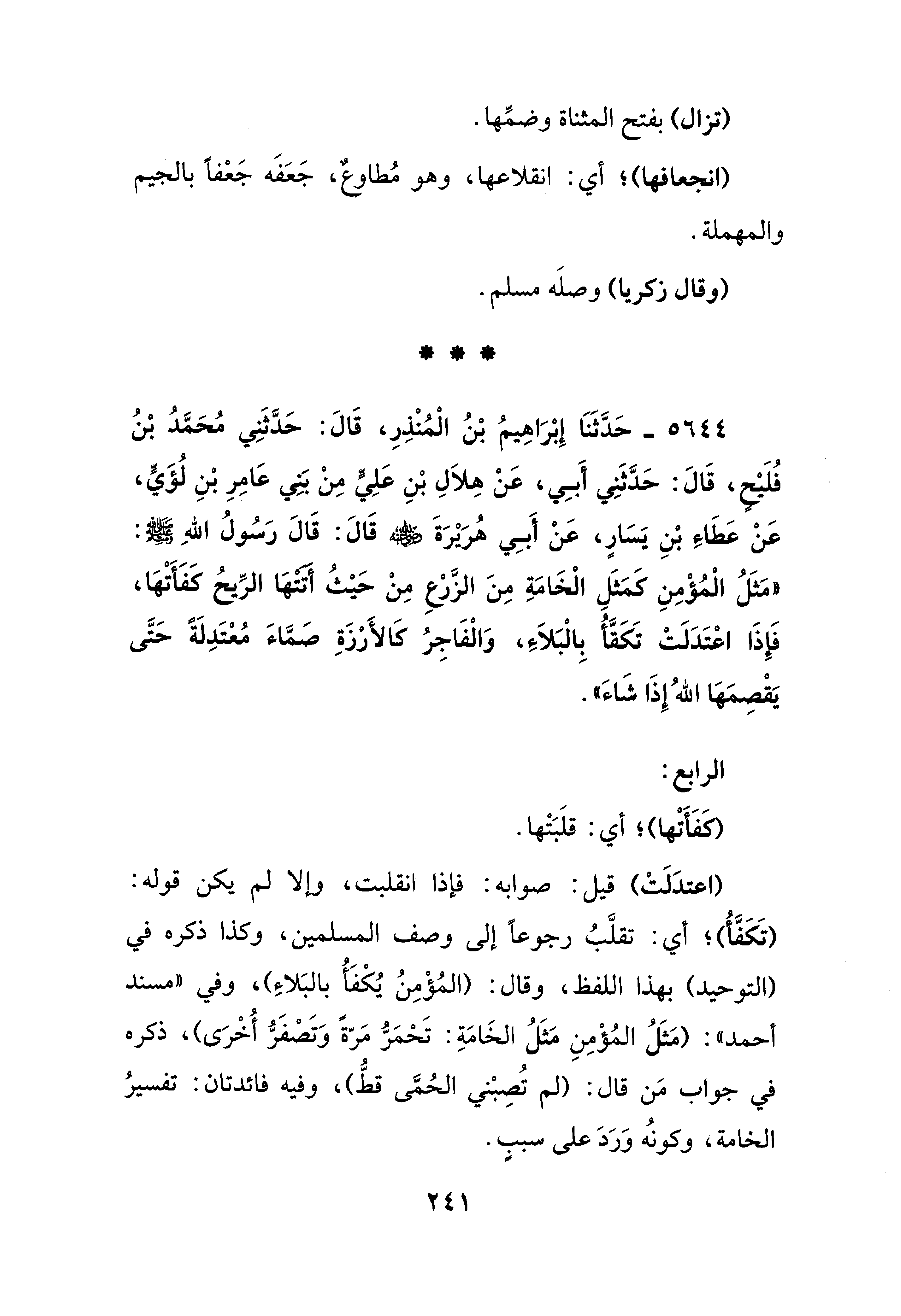 5644 - حَدَّثَنَا إِبْرَاهِيمُ بْنُ الْمُنْذِرِ، قَالَ: حَدَّثَنِي مُحَمَّدُ بْنُ فُلَيْحٍ، قَالَ: حَدَّثَنِي أَبِي، عَنْ هِلاَلِ بْنِ عَلِيُّ مِنْ بَنِي عَامِرِ بْنِ لُؤَيٍّ، عَنْ عَطَاءِ بْنِ يَسَارٍ، عَنْ أَبِي هُرَيْرَةَ - رضي الله عنه - قَالَ: قَالَ رَسُولُ اللهِ - صلى الله عليه وسلم -: "مَثَلُ الْمُؤْمِنِ كَمَثَلِ الْخَامَةِ مِنَ الزَّرْعِ مِنْ حَيْثُ أتتهَا الرِّيحُ كَفَأَتْهَا، فَإذَا اعْتَدَلَتْ تَكَقَّأُ بِالْبَلاَءِ، وَالْفَاجِرُ كَالأَرْزَةِ صَمَّاءَ مُعْتَدِلَةً حَتَّى يَقْصِمَهَا اللهُ إِذَا شَاءَ".