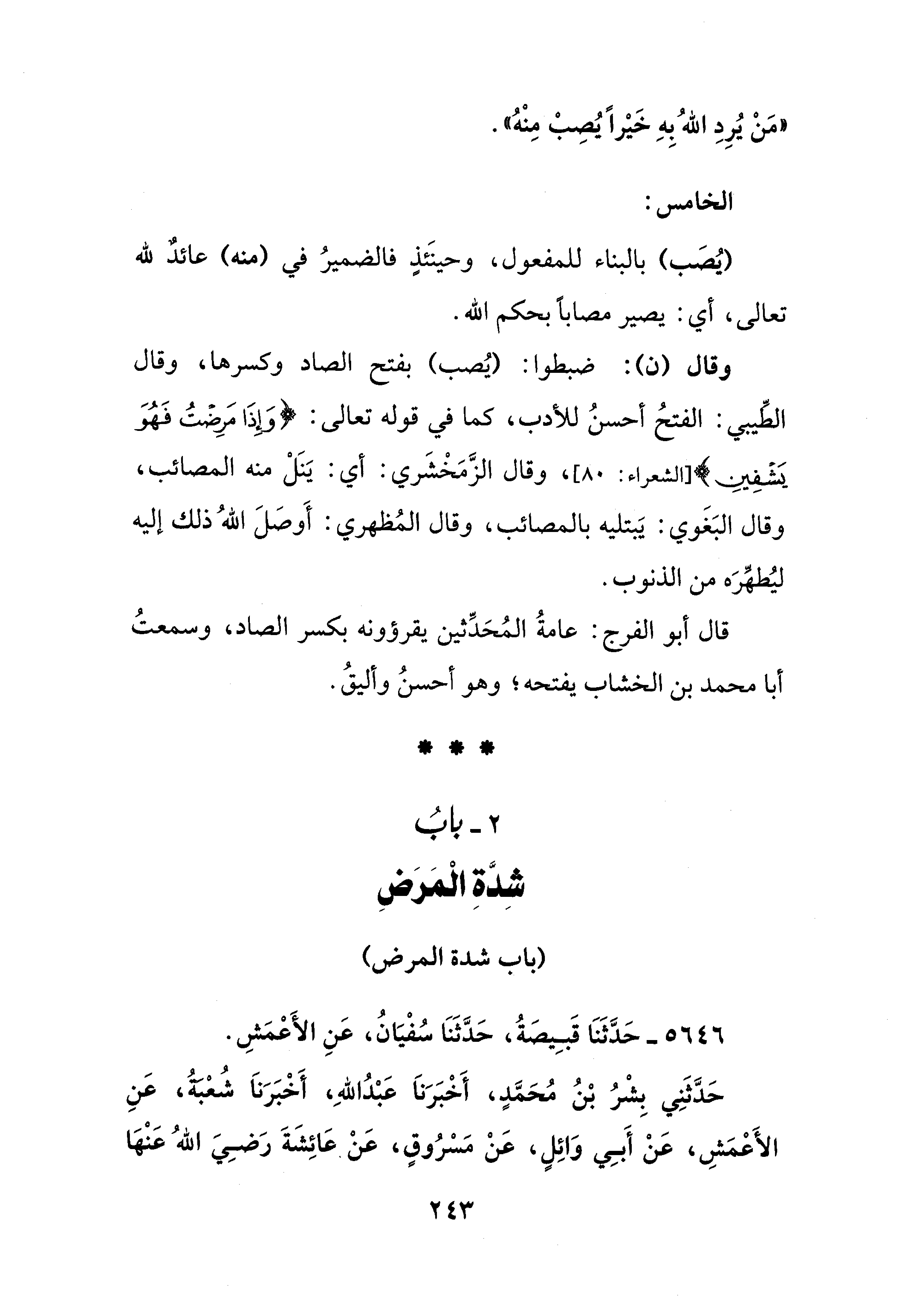 وقال (ن): ضبطوا: (يُصب) بفتح الصاد وكسرها، وقال الطِّيبي: الفتحُ أحسنُ للأدب، كما في قوله تعالى: {وَإِذَا مَرِضْتُ فَهُوَ يَشْفِينِ} [الشعراء: 80] وقال الزَّمَخْشَري: أي: يَنَلْ منه المصائب، وقال البَغَوي: يَبتليه بالمصائب، وقال المُظهري: أَوصَلَ اللهُ ذلك إليه ليُطهِّرَه من الذنوب.