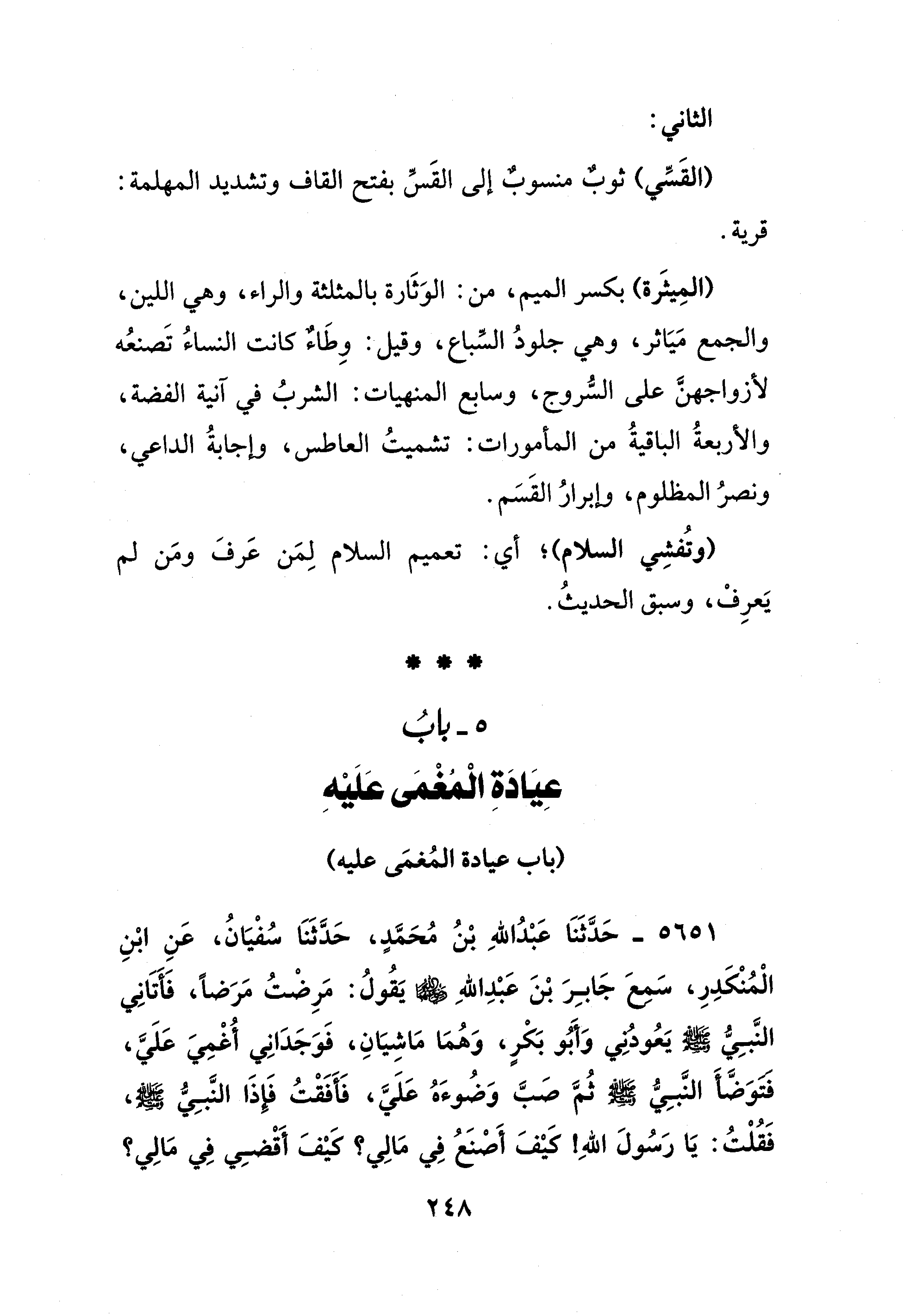 5651 - حَدَّثَنَا عَبْدُ اللهِ بْنُ مُحَمَّدٍ، حَدَّثَنَا سُفْيَانُ، عَنِ ابْنِ الْمُنْكَدِرِ، سَمِعَ جَابِرَ بْنَ عَبْدِ الله - رضي الله عنهما - يَقُولُ: مَرِضْتُ مَرَضًا، فَأتَانِي النَّبِيُّ - صلى الله عليه وسلم - يَعُودني وَأَبُو بَكْرٍ، وَهُمَا مَاشِيَانِ، فَوَجَدَانِي أُغمِيَ عَلَيَّ، فتوَضَّأَ النَّبِي - صلى الله عليه وسلم - ثُمَّ صَبَّ وَضُوءَهُ عَلَي، فَأَفَقْتُ فَإذَا النَّبِيّ - صلى الله عليه وسلم -، فَقُلْتُ: يَا رَسُولَ اللهِ كَيْفَ أَصْنعُ فِي مَالِي؟ كَيْفَ أَقْضِي فِي مَالِي؟