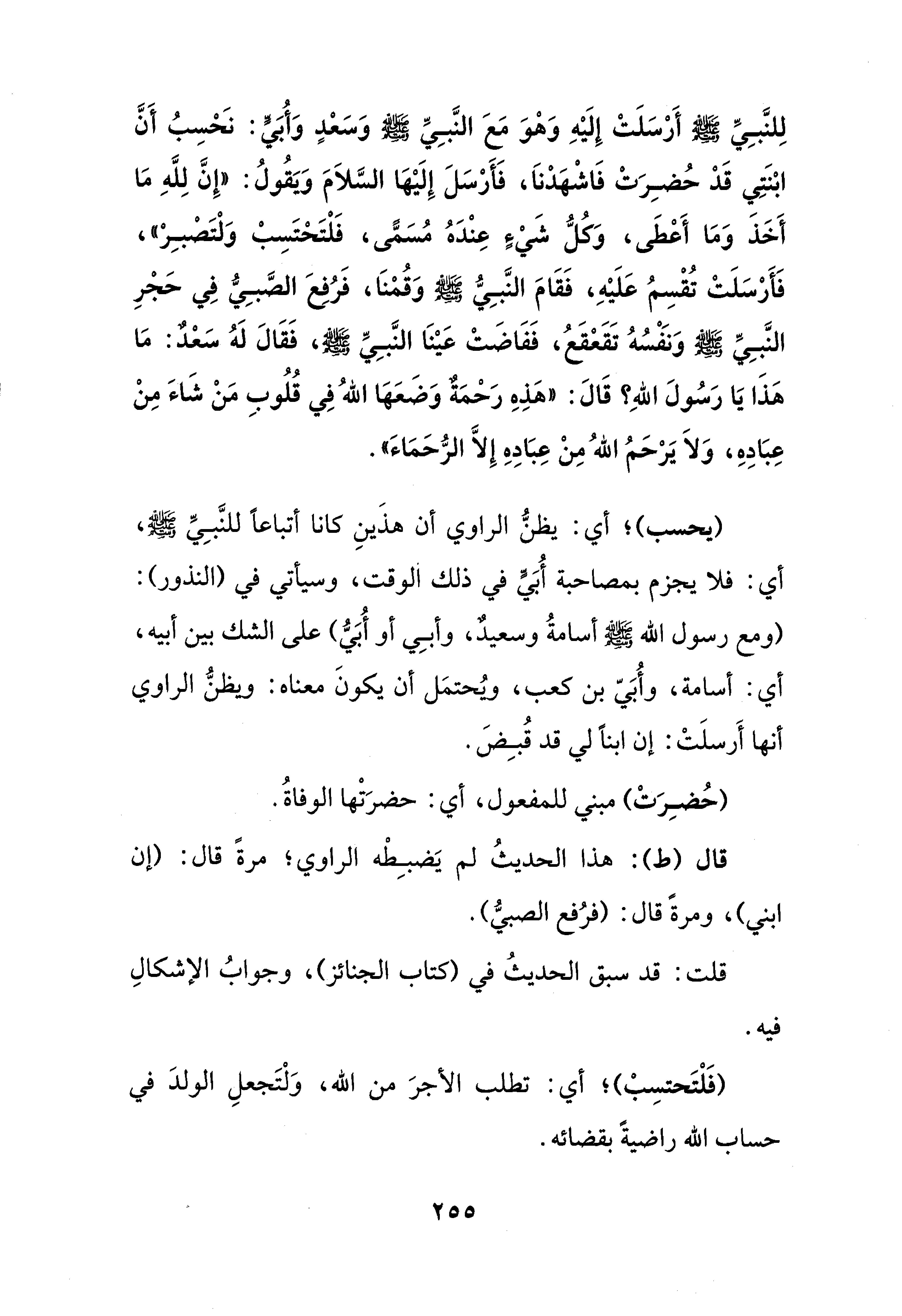 لِلنَّبِيِّ - صلى الله عليه وسلم - أَرْسَلَتْ إِلَيْهِ وَهْوَ مَعَ النَّبِيِّ - صلى الله عليه وسلم - وَسَعْدٍ وَأُبَيٍّ: نَحْسِبُ أَنَّ ابْنَتِي قَدْ حُضِرَتْ فَاشهَدْنَا، فَأرْسَلَ إِلَيْهَا السَّلاَمَ وَيَقُولُ: "إِنَّ لِلَّهِ مَا أَخَذَ وَمَا أَعْطَى، وَكُلُّ شَيْءٍ عِنْدَهُ مُسَمًّى، فَلْتَحْتَسِبْ وَلْتَصْبِرْ"، فَأرْسَلَتْ تُقْسِمُ عَلَيْهِ، فَقَامَ النَّبِيُّ - صلى الله عليه وسلم - وَقُمْنَا، فَرُفِعَ الصَّبِيُّ فِي حَجْرِ النَّبِيِّ - صلى الله عليه وسلم - وَنَفْسُهُ تَقَعْقَعُ، فَفَاضَتْ عَيْنَا النَّبِيِّ - صلى الله عليه وسلم -، فَقَالَ لَهُ سَعْد: مَا هَذَا يَا رَسُولَ اللهِ؟ قَالَ: "هَذِهِ رَحْمَةٌ وَضَعَهَا اللهُ فِي قُلُوبِ مَنْ شَاءَ مِنْ عِبَادِهِ، وَلَا يَرْحَمُ اللهُ مِنْ عِبَادِهِ إِلَّا الرُّحَمَاءَ".