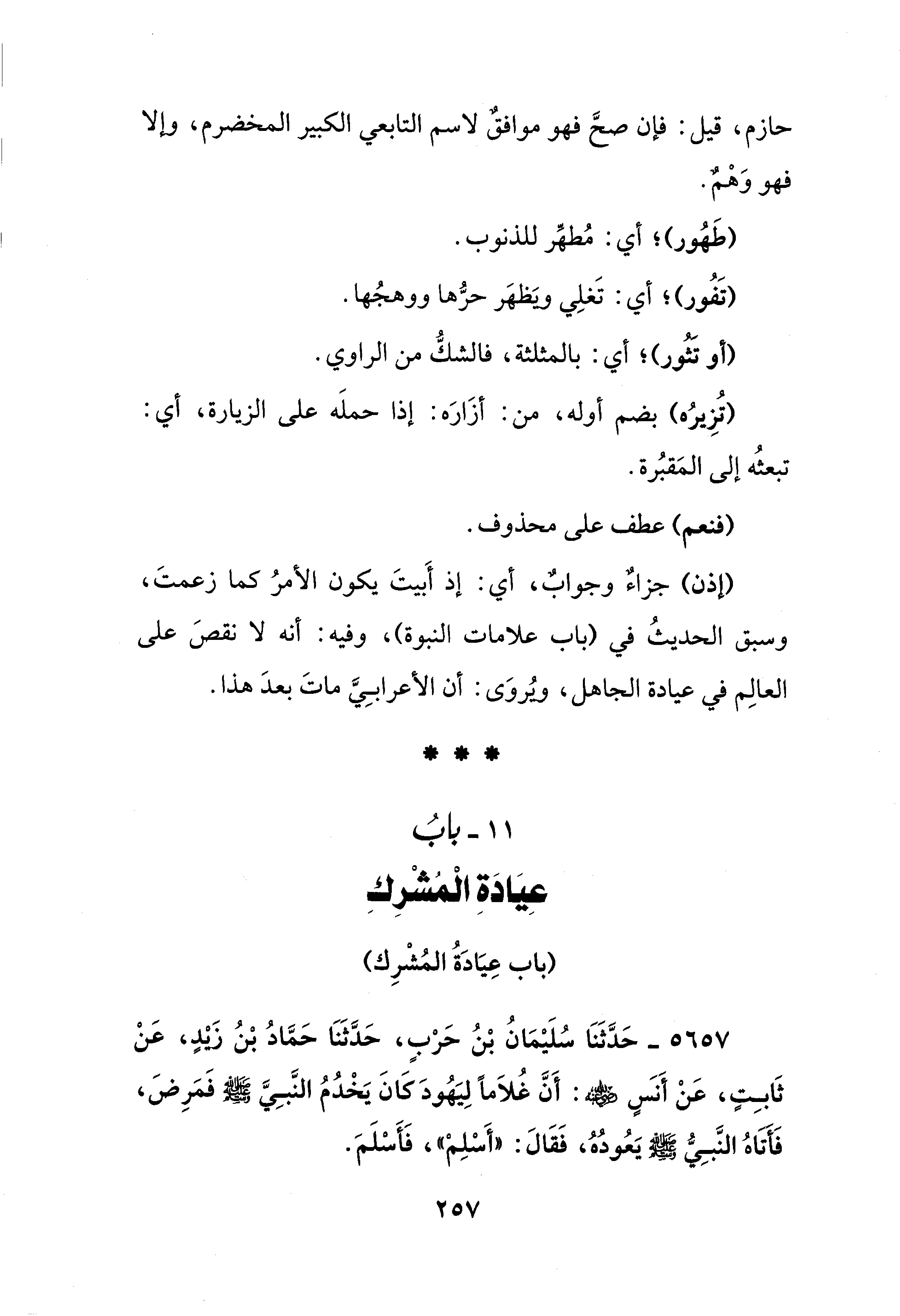5657 - حَدَّثَنَا سُلَيْمَانُ بْنُ حَرْبٍ، حَدَّثَنَا حَمَّادُ بْنُ زيدٍ، عَنْ ثَابِتٍ، عَنْ أَنسٍ - رضي الله عنه -: أَنَّ غُلاَمًا لِيَهُودَ كَانَ يَخْدُمُ النَّبِيَّ - صلى الله عليه وسلم - فَمَرِضَ، فَأتَاهُ النَّبِيُّ - صلى الله عليه وسلم - يَعُودُهُ، فَقَالَ: "أَسْلِمْ"، فَأسْلَمَ.