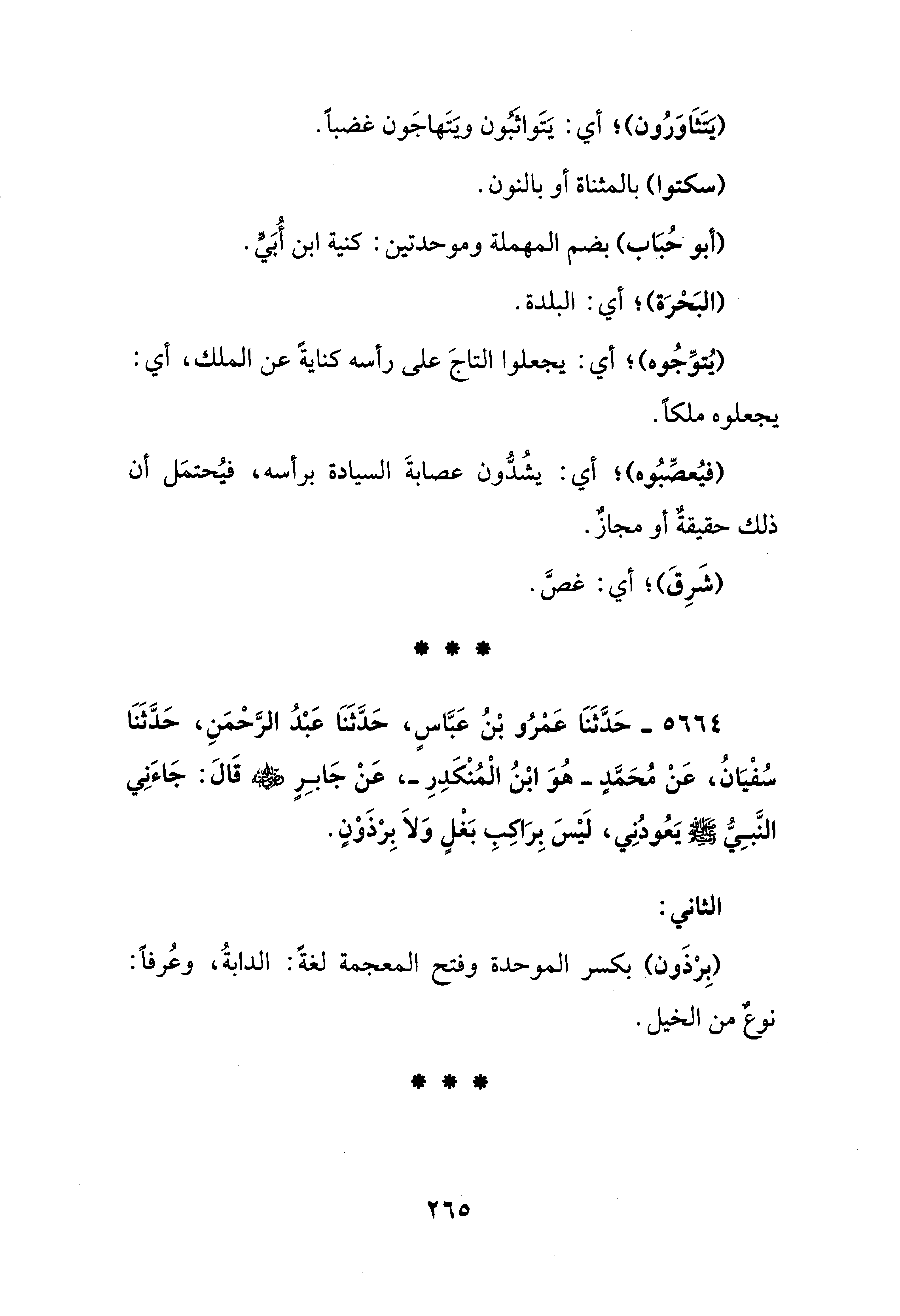 5664 - حَدَّثَنَا عَمْرُو بْنُ عَبَّاسٍ، حَدَّثَنَا عَبْدُ الرَّحْمَنِ، حَدَّثَنَا سُفْيَانُ، عَنْ مُحَمَّدٍ -هُوَ ابْنُ الْمُنْكَدِرِ-، عَنْ جَابِرٍ - رضي الله عنه - قَالَ: جَاءَنِي النَّبِيُّ - صلى الله عليه وسلم - يَعُودُنِي، لَيسَ بِرَاكِبِ بَغْلٍ وَلَا بِرذَوْنٍ.
