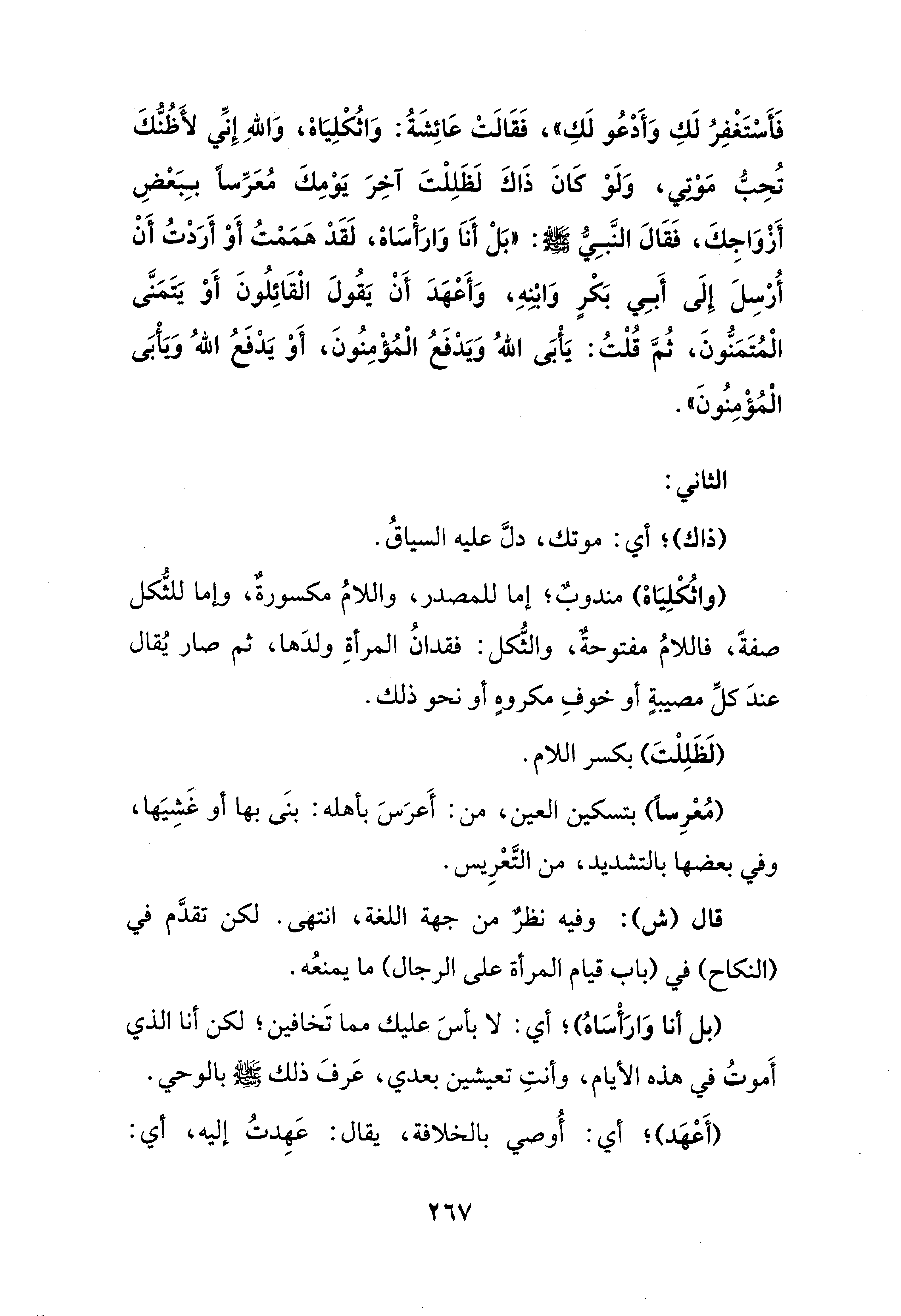 فَاَسْتَغْفِرُ لَكِ وَأَدْعُو لَكِ"، فَقَالَتْ عَائِشَةُ: وَاثُكْلِيَاهْ، وَاللهِ إِنِّي لأَظُنُّكَ تُحِبُّ مَوتِي، وَلَوْ كَانَ ذَاكَ لَظَلِلْتَ آخِرَ يَوْمِكَ مُعَرِّسًا بِبَعْضِ أَزْوَاجِكَ، فَقَالَ النَّبِيُّ - صلى الله عليه وسلم -: "بَلْ أَنَا وَارَأْسَاهْ، لَقَدْ هَمَمْتُ أَوْ أَرَدْتُ أَنْ أُرْسِلَ إِلَى أَبِي بَكْرٍ وَابْنِهِ، وَأَعْهَدَ أَنْ يَقُولَ الْقَائِلُونَ أَوْ يتمَنَّى الْمُتَمَنُّونَ، ثُمَّ قُلْتُ: يَأبَى اللهُ وَيَدْفَعُ الْمُؤْمِنُونَ، أَوْ يَدْفَعُ اللهُ وَيَأبَى الْمُؤْمِنُونَ".