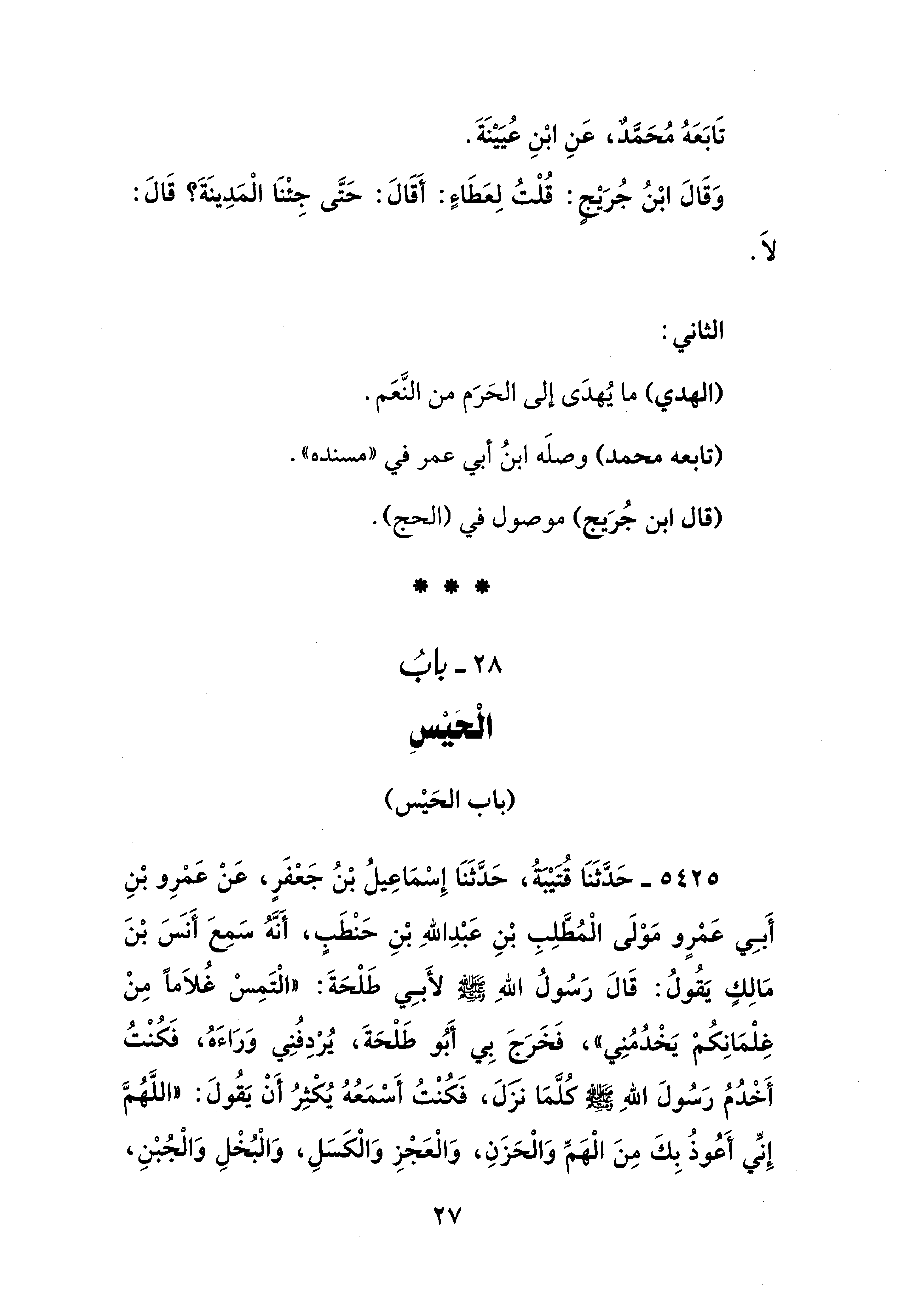 5425 - حَدَّثَنَا قتيْبَةُ، حَدَّثَنَا إِسْمَاعِيلُ بْنُ جَعْفَرٍ، عَنْ عَمْرِو بْنِ أَبِي عَمْرٍو مَوْلَى الْمُطَّلِبِ بْنِ عَبْدِ اللهِ بْنِ حَنْطَبٍ، أَنَّهُ سَمعَ أَنس بْنَ مَالِكٍ يَقُولُ: قَالَ رَسُولُ اللهِ - صلى الله عليه وسلم - لأَبِي طَلْحَةَ: "الْتَمِسْ غُلاَمًا مِنْ غِلْمَانِكُمْ يَخْدُمُنِي"، فَخَرَجَ بِي أَبُو طَلْحَةَ، يُرْدِفُنِي وَرَاءَهُ، فَكُنْتُ أَخْدُمُ رَسُولَ اللهِ - صلى الله عليه وسلم - كلَّمَا نزَلَ، فَكُنْتُ أَسْمَعُهُ يُكْثِرُ أَنْ يَقُولَ: "اللَّهُمَّ إِنِّي أَعُوذُ بِكَ مِنَ الْهَمِّ وَالْحَزَنِ، وَالْعَجْزِ وَالْكَسَلِ، وَالْبُخْلِ وَالْجُبْنِ،