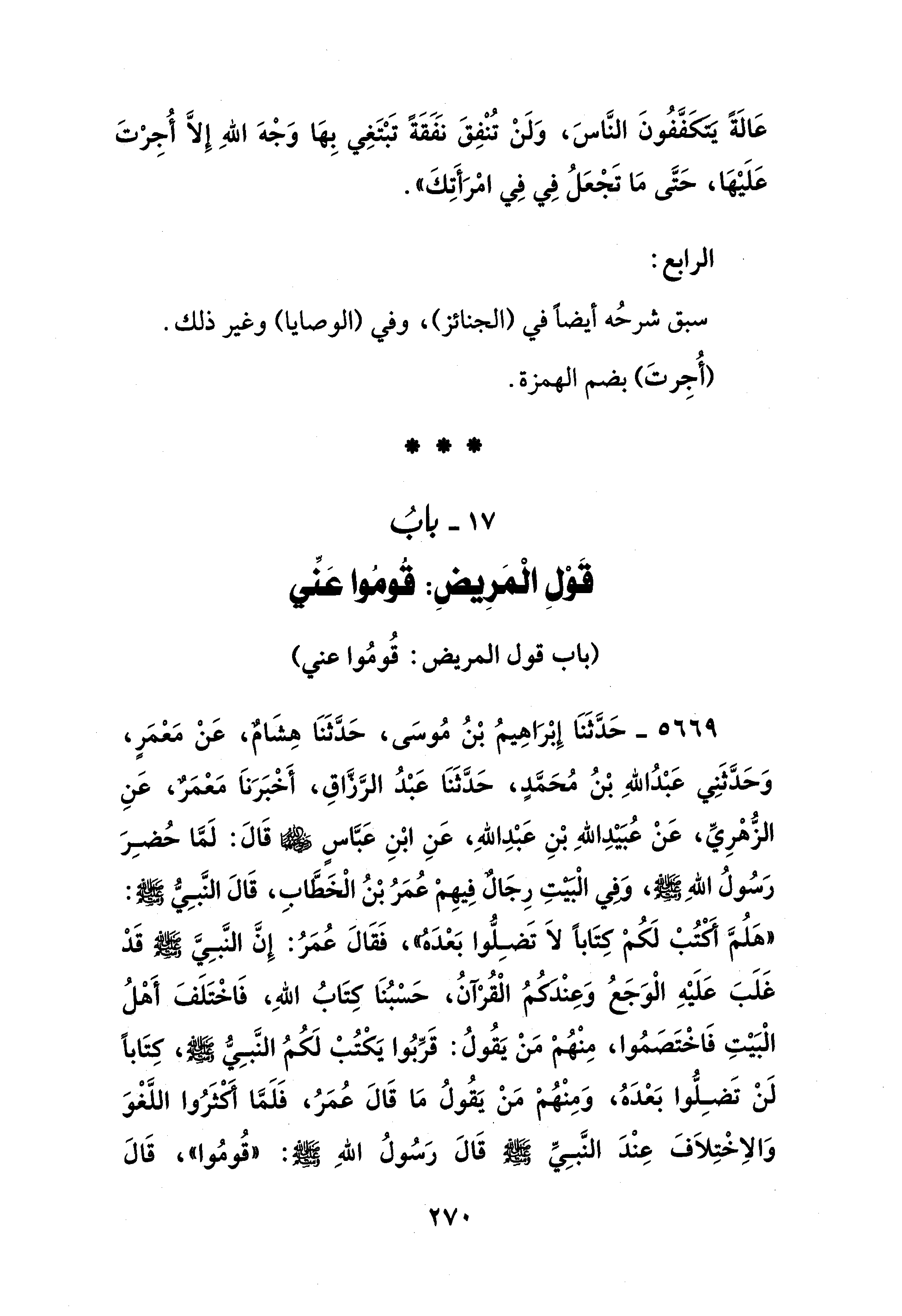 5669 - حَدَّثَنَا إِبْرَاهِيمُ بْنُ مُوسَى، حَدَّثَنَا هِشَام، عَنْ مَعْمَرٍ، وَحَدَّثَنِي عَبْدُ اللهِ بْنُ مُحَمَّدٍ، حَدَّثَنَا عَبْدُ الرَّزَاقِ، أَخْبَرَنَا مَعْمَرٌ، عَنِ الزُّهْرِيِّ، عَنْ عُبَيْدِ اللهِ بْنِ عَبْدِ اللهِ، عَنِ ابْنِ عَبَّاسٍ - رضي الله عنهما - قَالَ: لَمَّا حُضِرَ رَسُولُ اللهِ - صلى الله عليه وسلم -، وَفي الْبيتِ رِجَالٌ فِيهِمْ عُمَرُ بْنُ الْخَطَّابِ، قَالَ النَّبِيُّ - صلى الله عليه وسلم -: "هَلُمَّ أكتُبْ لَكُمْ كِتَابًا لَا تَضِلُّوا بَعْدَه"، فَقَالَ عُمَرُ: إِنَّ النَّبِيَّ - صلى الله عليه وسلم - قَدْ غَلَبَ عَلَيْهِ الْوَجَعُ وَعِنْدكم الْقُرْآنُ، حَسْبُنَا كِتَابُ اللهِ، فَاخْتَلَفَ أَهْلُ الْبَيْتِ فَاخْتَصَمُوا، مِنْهُمْ مَنْ يَقُولُ: قَرِّبُوا يَكْتُبْ لَكُمُ النَّبِيُّ - صلى الله عليه وسلم -، كِتَابًا لَنْ تَضِلُّوا بَعْدَهُ، وَمِنْهُمْ مَنْ يَقُولُ مَا قَالَ عُمَرُ، فَلَمَّا أكثَرُوا اللَّغوَ وَالاِخْتِلاَفَ عِنْدَ النَّبِيِّ - صلى الله عليه وسلم - قَالَ رَسُولُ اللهِ - صلى الله عليه وسلم -: "قُومُوا"، قَالَ
