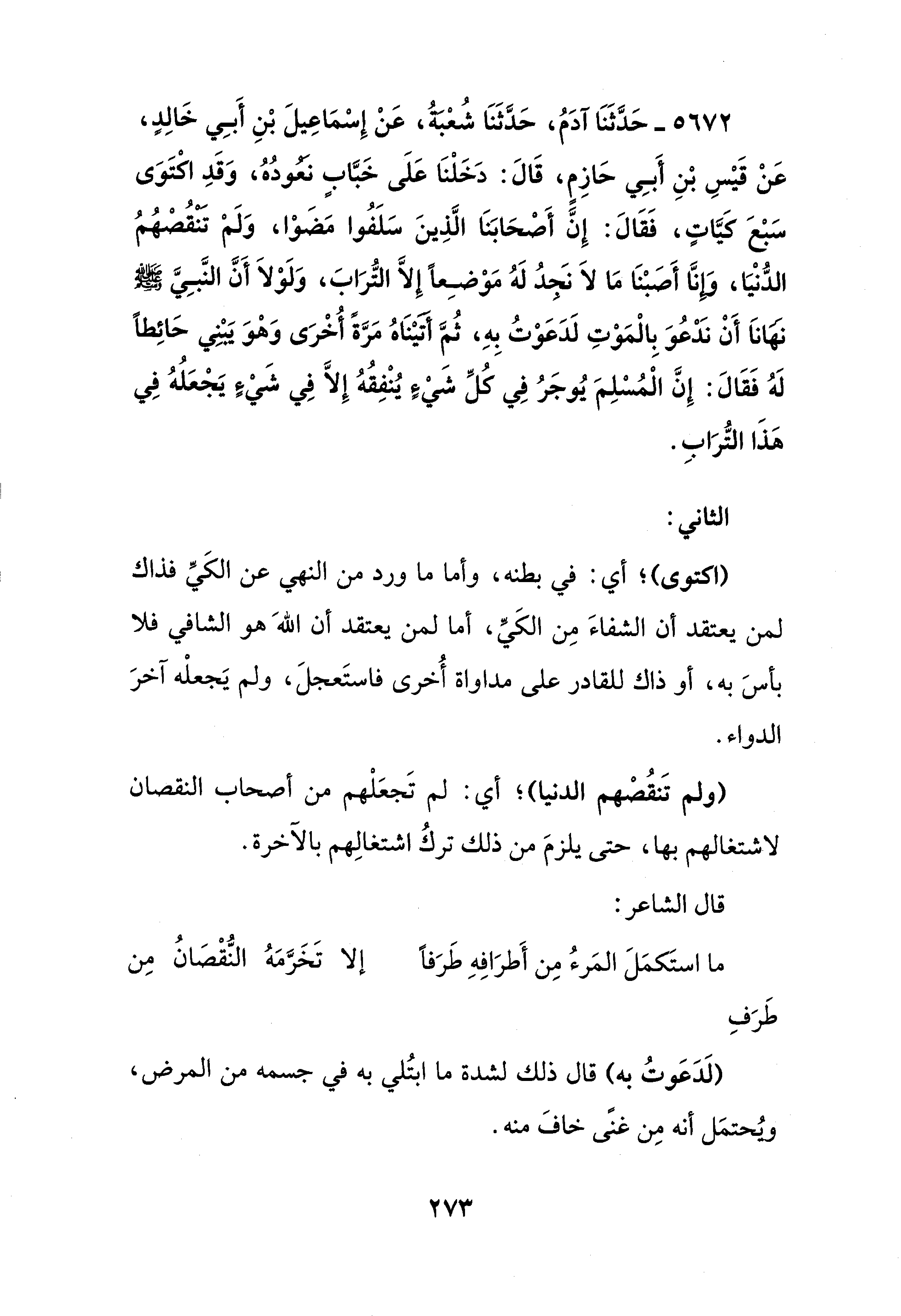 5672 - حَدَّثَنَا آدَمُ، حَدَّثَنَا شُعْبةُ، عَنْ إِسْمَاعِيلَ بْنِ أَبِي خَالِدٍ، عَنْ قَيْسِ بْنِ أَبِي حَازِمٍ، قَالَ: دَخَلْنَا عَلَى خَبَّابٍ نعودُهُ، وَقَدِ اكْتَوَى سَبْعَ كيَّاتٍ، فَقَالَ: إِنَّ أَصْحَابَنَا الَّذِينَ سَلَفُوا مَضَوْا، وَلَمْ تنقُصْهُمُ الدُّنْيَا، وإنَّا أَصَبْنَا مَا لَا نَجدُ لَهُ مَوْضِعًا إِلَّا التُّرَابَ، وَلَوْلاَ أَنَّ النَّبِيَّ - صلى الله عليه وسلم - نهانَا أَنْ نَدْعُوَ بِالْمَوْتِ لَدَعَوْتُ بِهِ، ثُمَّ أتيْنَاهُ مَرَّةً أُخْرَى وَهْوَ يَبْني حَائِطًا لَهُ فَقَالَ: إِنَّ الْمُسْلِمَ يُوجَرُ فِي كُلِّ شَيْءٍ يُنْفِقُهُ إِلَّا فِي شَيْء يَجْعَلُهُ فِي هَذَا التُّرَابِ.