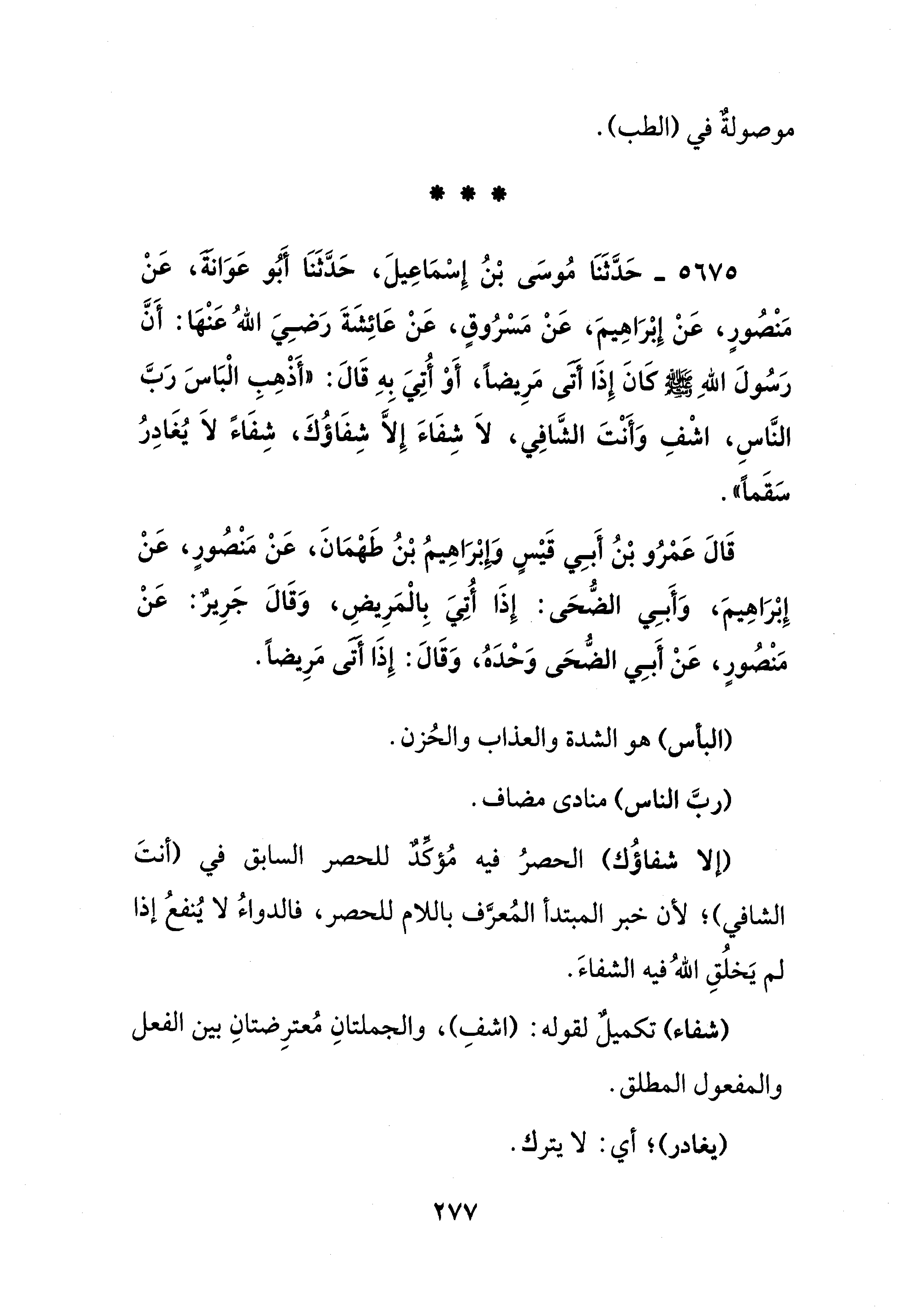 5675 - حَدَّثَنَا مُوسَى بْنُ إِسمَاعِيلَ، حَدَّثَنَا أَبو عَوَانة، عَنْ مَنْصُورٍ، عَنْ إِبْرَاهِيمَ، عَنْ مَسْرُوقٍ، عَنْ عَائِشَةَ رَضِيَ اللهُ عَنْهَا: أَنَّ رَسُولَ اللهِ - صلى الله عليه وسلم - كَانَ إِذَا أتى مَرِيضًا، أَوْ أُتِيَ بهِ قَالَ: "أَذْهِبِ الْبَاسَ رَبَّ النَّاسِ، اشْفِ وَأَنْتَ الشَّافِي، لَا شِفَاءَ إِلَّا شِفَاؤُكَ، شِفَاءً لَا يُغَادِرُ سَقَمًا".