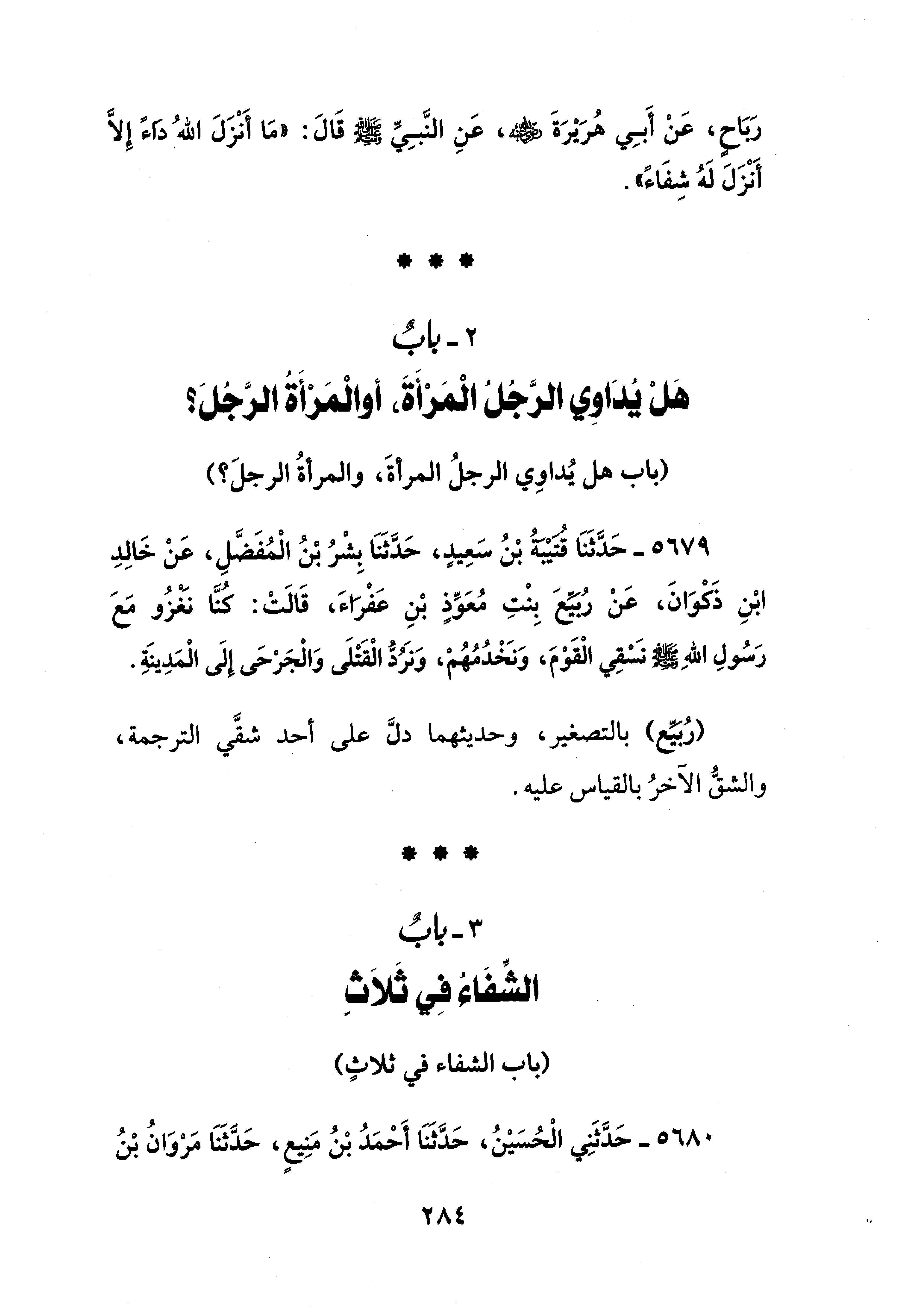 2 - بابٌ هَلْ يُدَاوِي الرَّجُلُ الْمَرْأَةَ، أو الْمَرْأَةُ الرَّجُل؟