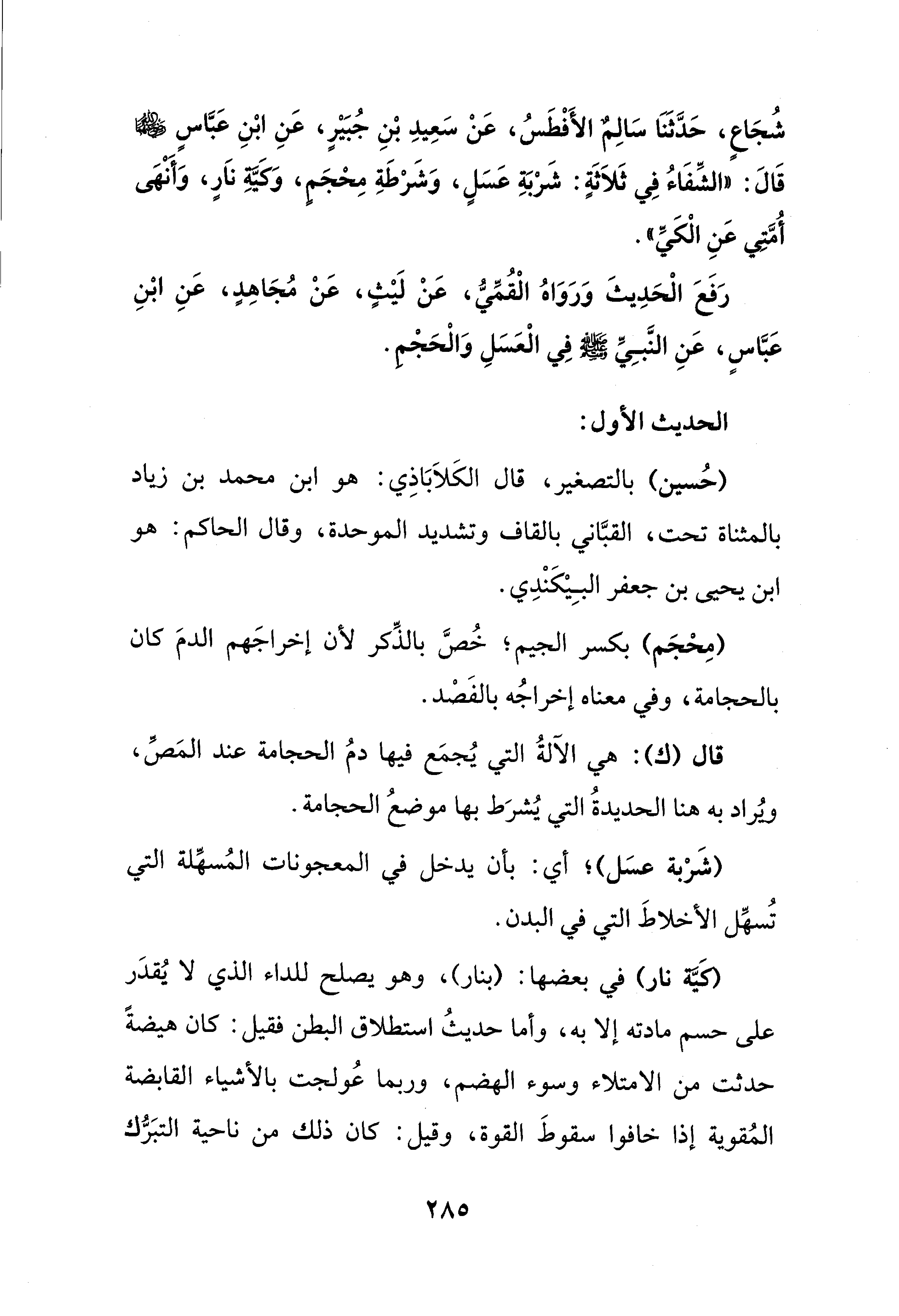 شُجَاعٍ، حَدَّثَنَا سَالِمٌ الأَفْطَسُ، عَنْ سَعِيدِ بْنِ جُبَيْرٍ، عَنِ ابْنِ عَبَّاسٍ - رضي الله عنهما - قَالَ: "الشِّفَاءُ فِي ثَلاَثَةٍ: شَرْبَةِ عَسَلٍ، وَشَرْطَةِ مِحْجَمٍ، وَكَيَّةِ نَارٍ، وَأَنْهَى أُمَّتي عَنِ الْكَيِّ".