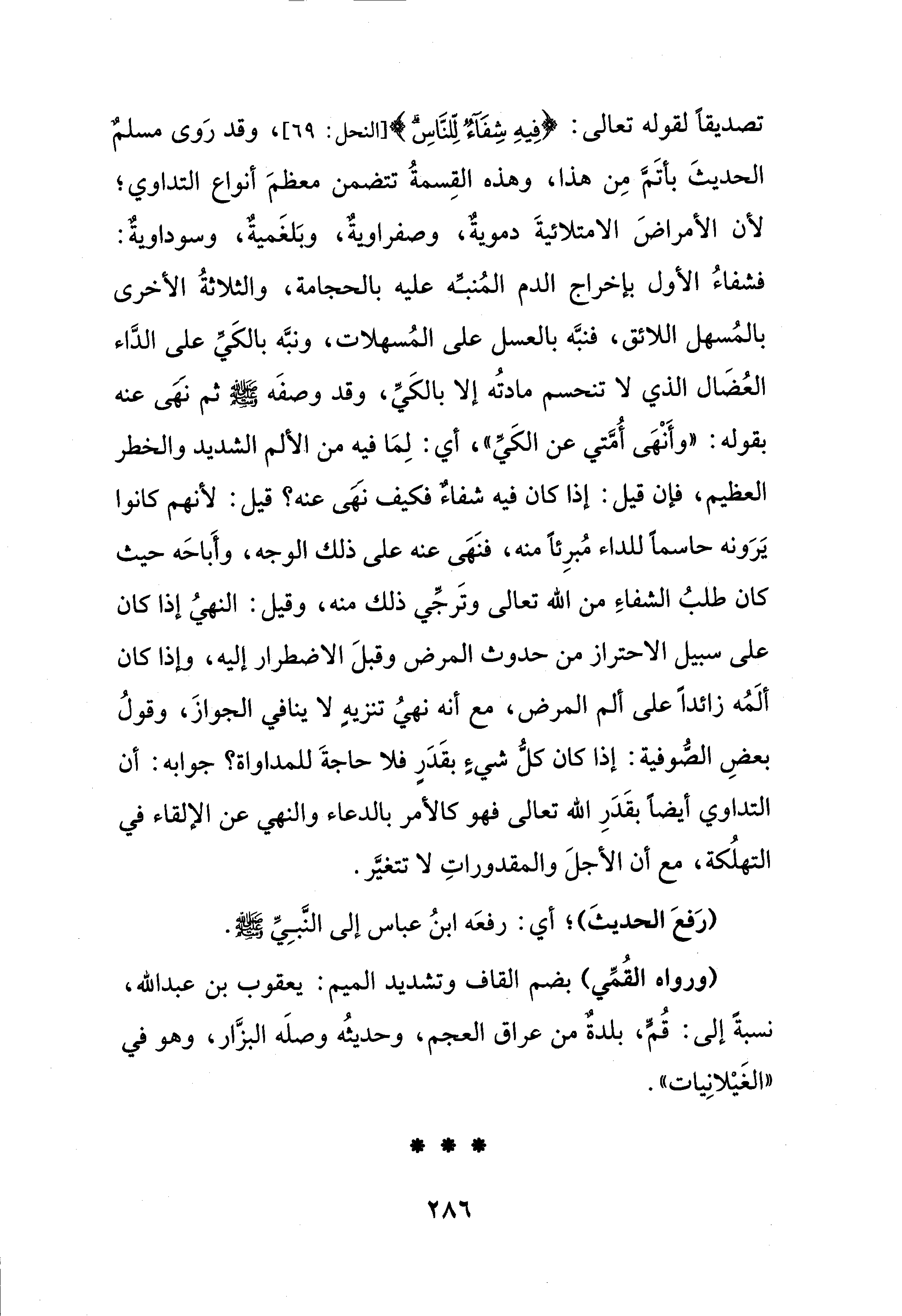 تصديقًا لقوله تعالى: {فِيهِ شِفَاءٌ لِلنَّاسِ} [النحل: 69]، وقد رَوى مسلمٌ الحديثَ بأتَمَّ مِن هذا، وهذه القِسمةُ تتضمن معظمَ أنواع التداوي؛ لأن الأمراضَ الامتلائيةَ دمويةٌ، وصفراويةٌ، وبَلغَميةٌ، وسوداويةٌ: فشفاءُ الأول بإخراج الدم المُنبِّه عليه بالحجامة، والثلاثةُ الأخرى بالمُسهل اللائق، فنبَّه بالعسل على المُسهلات، ونبَّه بالكَيِّ على الدَّاء العُضَال الذي لا تنحسم مادتُه إلا بالكَي، وقد وصفَه - صلى الله عليه وسلم - ثم نهى عنه بقوله: "وأَنْهَى أُمَّتي عن الكَيِّ"، أي: لِمَا فيه من الألم الشديد والخطر العظيم، فإن قيل: إذا كان فيه شفاءٌ فكيف نهى عنه؟ قيل: لأنهم كانوا يَرَونه حاسمًا للداء مُبرِئًا منه، فنَهَى عنه على ذلك الوجه، وأَباحَه حيث كان طلبُ الشفاءِ من الله تعالى وتَرجِّي ذلك منه، وقيل: النهيُ إذا كان على سبيل الاحتراز من حدوث المرض وقبلَ الاضطرار إليه، وإذا كان ألَمُه زائدًا على ألم المرض، مع أنه نهيُ تنزيهٍ لا ينافي الجوازَ، وقولُ بعضِ الصوفية: إذا كان كلُّ شيءٍ بقَدَرٍ فلا حاجةَ للمداواة؟ جوابه: أن التداوي أيضًا بقَدَرِ الله تعالى فهو كالأمر بالدعاء والنهي عن الإلقاء في التهلُكة، مع أن الأجلَ والمقدوراتِ لا تتغيَّر.