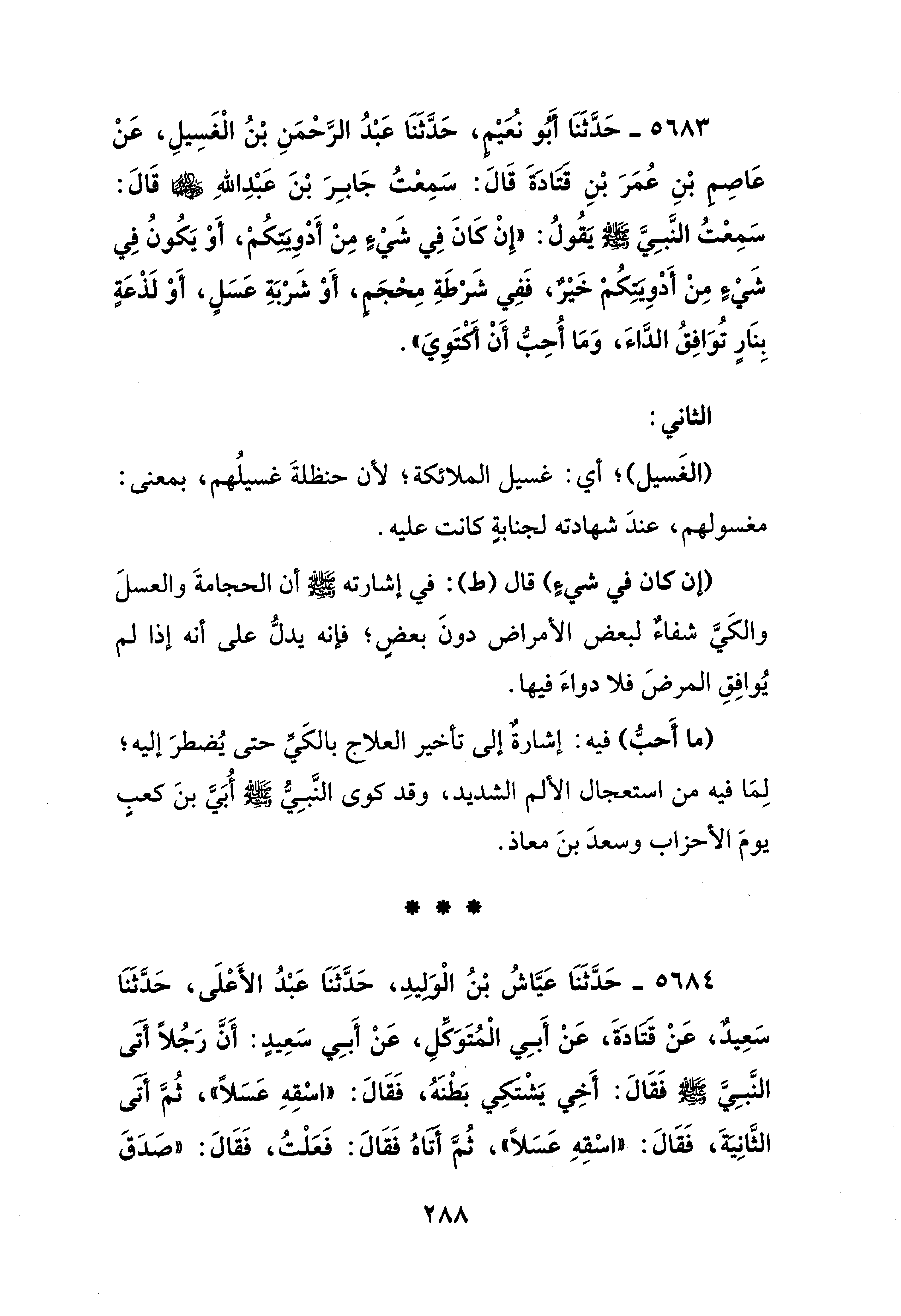 5683 - حَدَّثَنَا أَبُو نُعَيْمٍ، حَدَّثَنَا عَبْدُ الرَّحْمَنِ بْنُ الْغَسِيلِ، عَنْ عَاصم بْنِ عُمَرَ بْنِ قتادَةَ قَالَ: سَمِعْتُ جَابِرَ بْنَ عَبْدِ اللهِ - رضي الله عنهما - قَالَ: سَمِعْتُ النَّبِيَّ - صلى الله عليه وسلم - يَقُولُ: "إِنْ كَانَ فِي شَيْءٍ مِنْ أَدْوِيتكُمْ، أَوْ يَكُونُ فِي شَيْءٍ مِنْ أَدْوِيتكُمْ خَيْرٌ، فَفِي شَرْطَةِ مِحْجَمٍ، أَوْ شَرْبَةِ عَسَلٍ، أَوْ لَذْعَةٍ بِنَارٍ تُوَافِقُ الدَّاءَ، وَمَا أُحِبُّ أَنْ أكتَوِيَ".