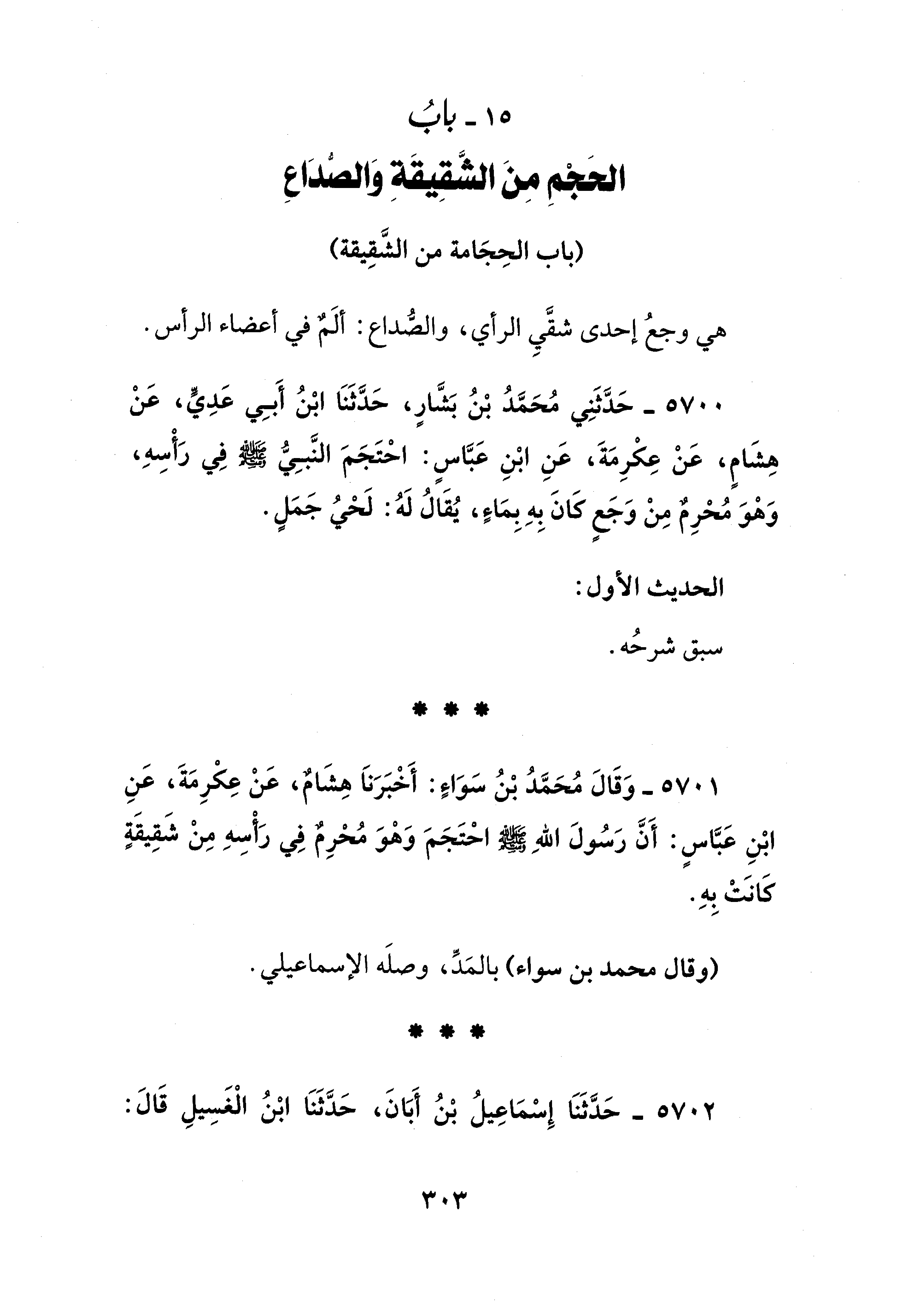 5700 - حَدَّثَنِي مُحَمَّدُ بْنُ بَشَّارٍ، حَدَّثَنَا ابْنُ أَبِي عَدِيٍّ، عَنْ هِشَامٍ، عَنْ عِكْرِمَةَ، عَنِ ابْنِ عَبَّاسٍ: احْتَجَمَ النَّبِيُّ - صلى الله عليه وسلم - فِي رَأْسِهِ، وَهْوَ مُحْرِمٌ مِنْ وَجَعٍ كَانَ بِهِ بِمَاءٍ، يُقَالُ لَهُ: لَحْيُ جَمَلٍ.