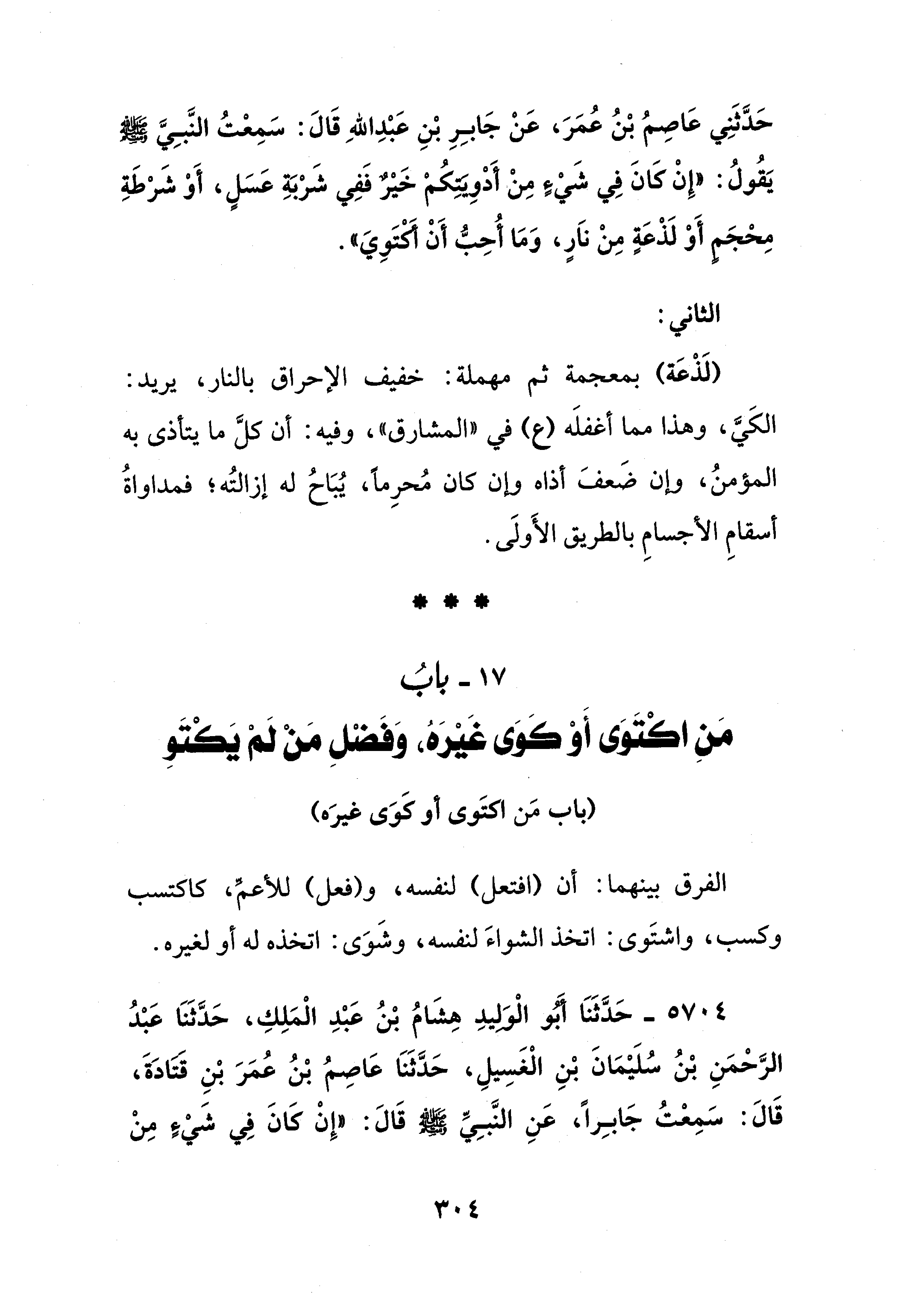 17 - بابُ مَنِ اكتَوَى أَوْ كَوَى غَيْرَه، وَفَضْلِ مَنْ لَمْ يَكتَوِ