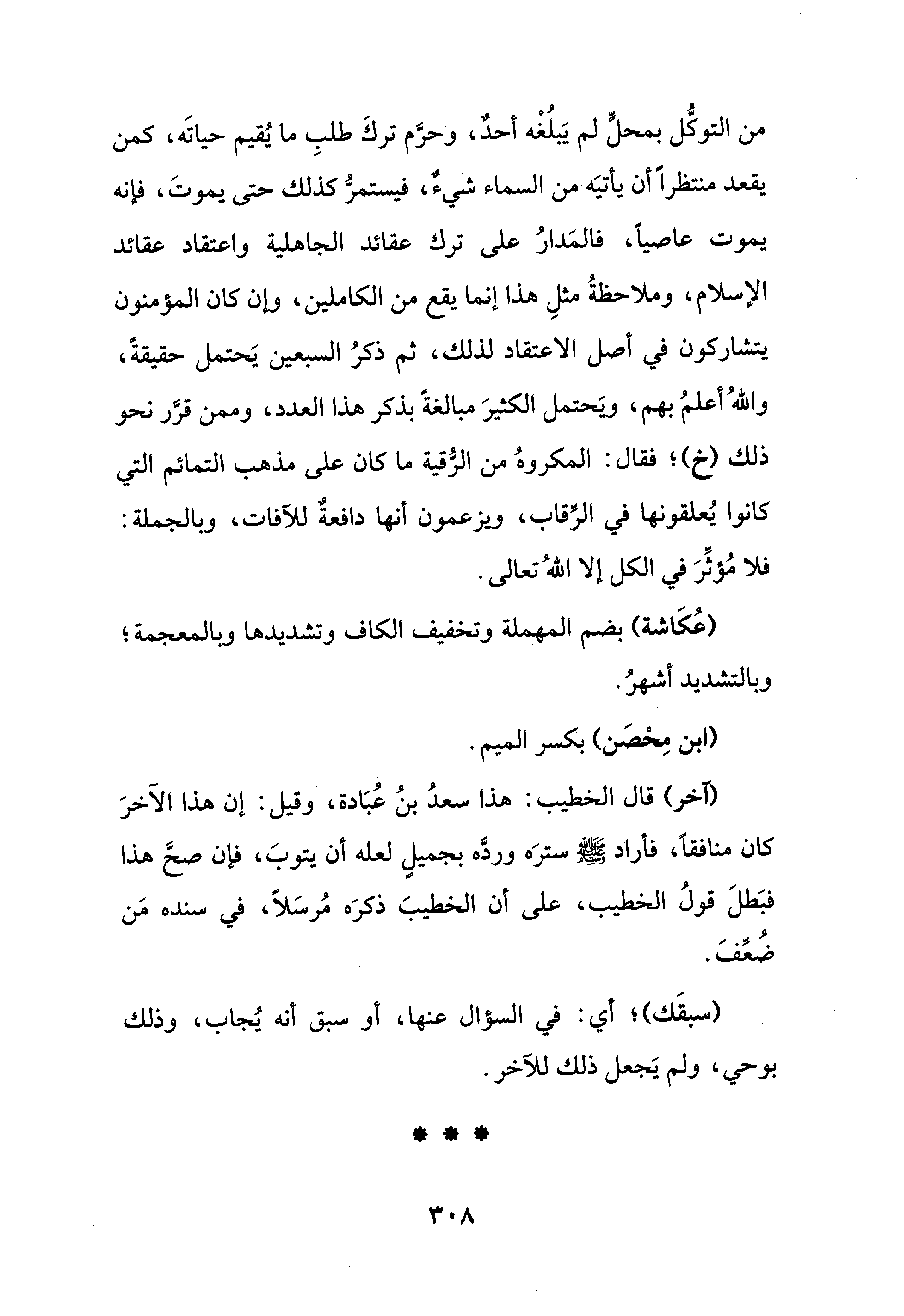 من التوكُّل بمحلٍّ لم يَبلُغْه أحدٌ، وحرَّم تركَ طلبِ ما يُقيم حياتَه، كمن يقعد منتظرًا أن يأتيَه من السماء شيءٌ، فيستمرُّ كذلك حتى يموتَ، فإنه يموت عاصيًا، فالمَدارُ على ترك عقائد الجاهلية واعتقاد عقائد الإسلام، وملاحظةُ مثلِ هذا إنما يقع من الكاملين، وإن كان المؤمنون يتشاركون في أصل الاعتقاد لذلك، ثم ذكرُ السبعين يَحتمل حقيقة، واللهُ أعلمُ بهم، ويَحتمل الكثيرَ مبالغةً بذكر هذا العدد، وممن قرَّر نحو ذلك (خ)؛ فقال: المكروهُ من الرُّقية ما كان على مذهب التمائم التي كانوا يُعلقونها في الرِّقاب، ويزعمون أنها دافعةٌ للآفات، وبالجملة: فلا مُؤثِّرَ في الكل إلا الله تعالى.