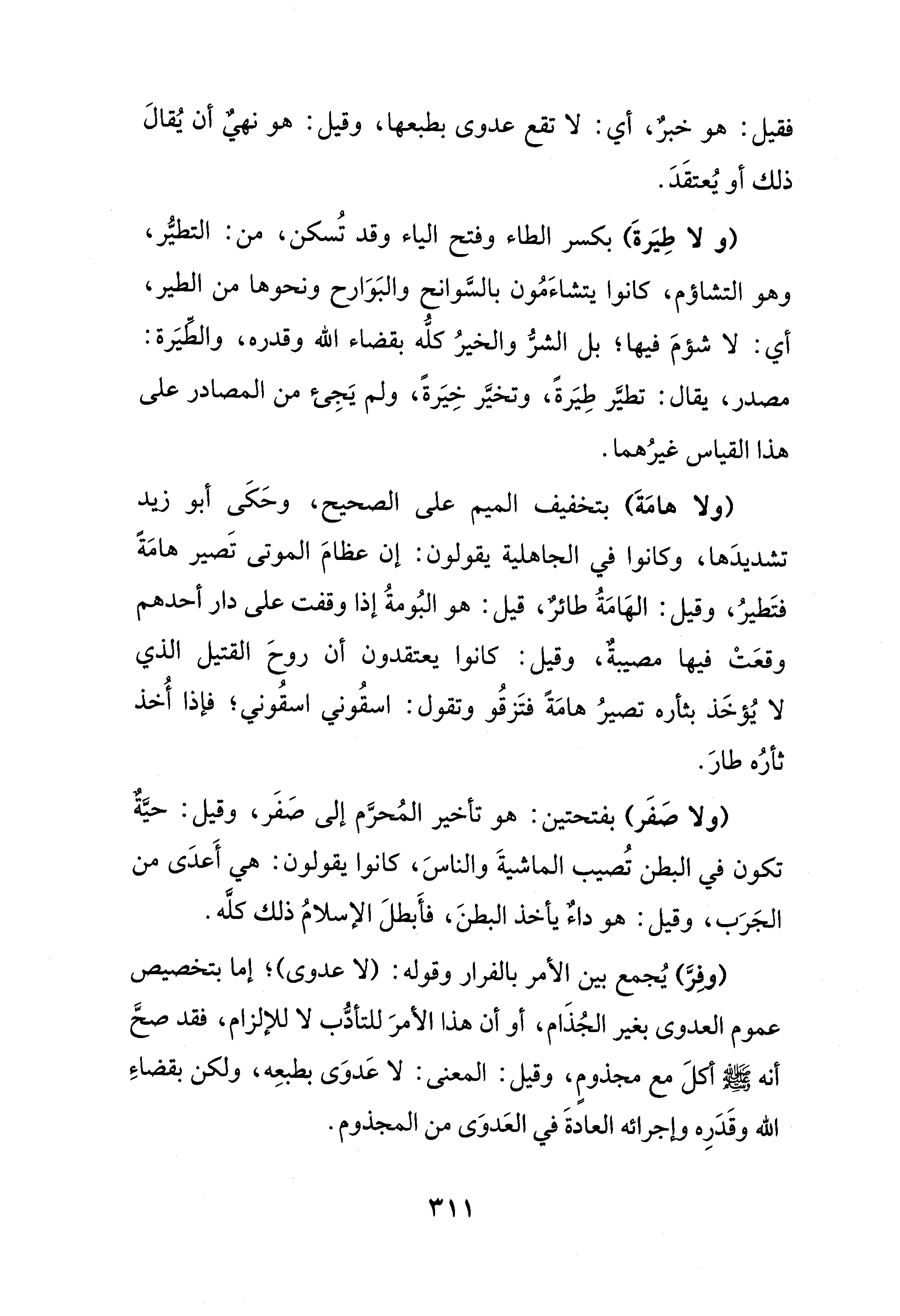 (ولا صَفَر) بفتحتين: هو تأخير المُحرَّم إلى صَفَر، وقيل: حيَّةٌ تكون في البطن تُصيب الماشيةَ والناسَ، كانوا يقولون: هي أَعدَى من الجَرَب، وقيل: هو داءٌ يأخذ البطنَ، فأبطلَ الإسلامُ ذلك كلَّه.