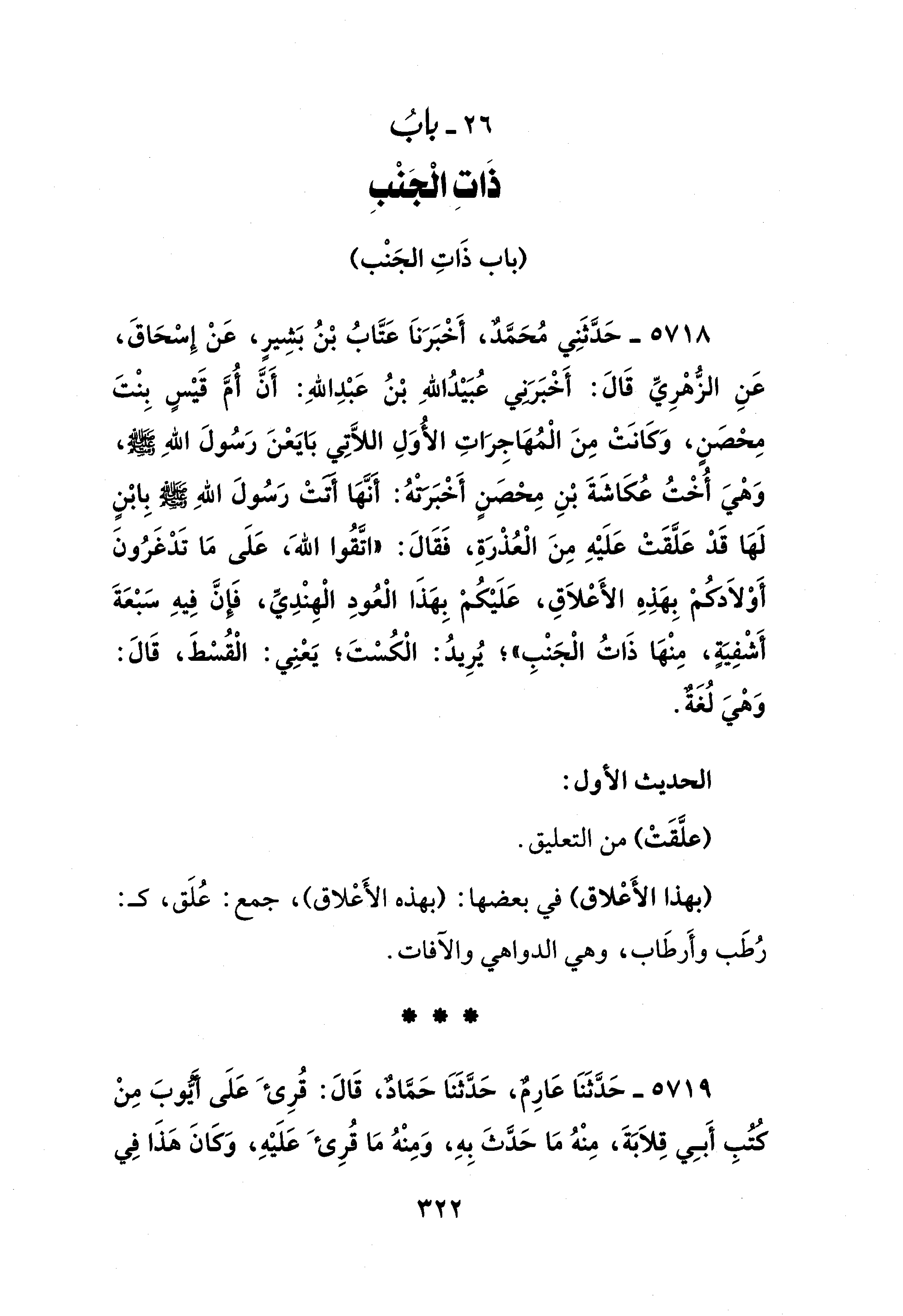 5718 - حَدَّثَنِي مُحَمَّدٌ، أَخْبَرَنَا عَتَّابُ بْنُ بَشِيرٍ، عَنْ إِسْحَاقَ، عَنِ الزُّهْرِيِّ قَالَ: أَخْبَرني عُبَيْدُ اللهِ بْنُ عَبْدِ اللهِ: أَنَّ أُمَّ قَيْسٍ بِنْتَ مِحْصَنٍ، وَكانَتْ مِنَ الْمُهَاجِرَاتِ الأُوَلِ اللَّاتِي بَايَعْنَ رَسُولَ اللهِ - صلى الله عليه وسلم -، وَهْيَ أُخْتُ عُكَاشَةَ بْنِ مِحْصَنٍ أَخْبَرتهُ: أَنَّهَا أتتْ رَسُولَ اللهِ - صلى الله عليه وسلم - بِابْنٍ لَهَا قَدْ عَلَّقَتْ عَلَيْهِ مِنَ الْعُذْرَةِ، فَقَالَ: "اتَّقُوا اللهَ، عَلَى مَا تَدْغَرُونَ أَوْلاَدكم بِهَذِهِ الأَعْلاَقِ، عَلَيكُم بِهَذَا الْعُودِ الْهِنْدِيِّ، فَإِنَّ فِيهِ سَبعَةَ أَشْفِيَةٍ، مِنْهَا ذَاتُ الْجَنْبِ"؛ يُرِيدُ: الْكُسْتَ؛ يَعْنِي: الْقُسْطَ، قَالَ: وَهْيَ لُغَةٌ.