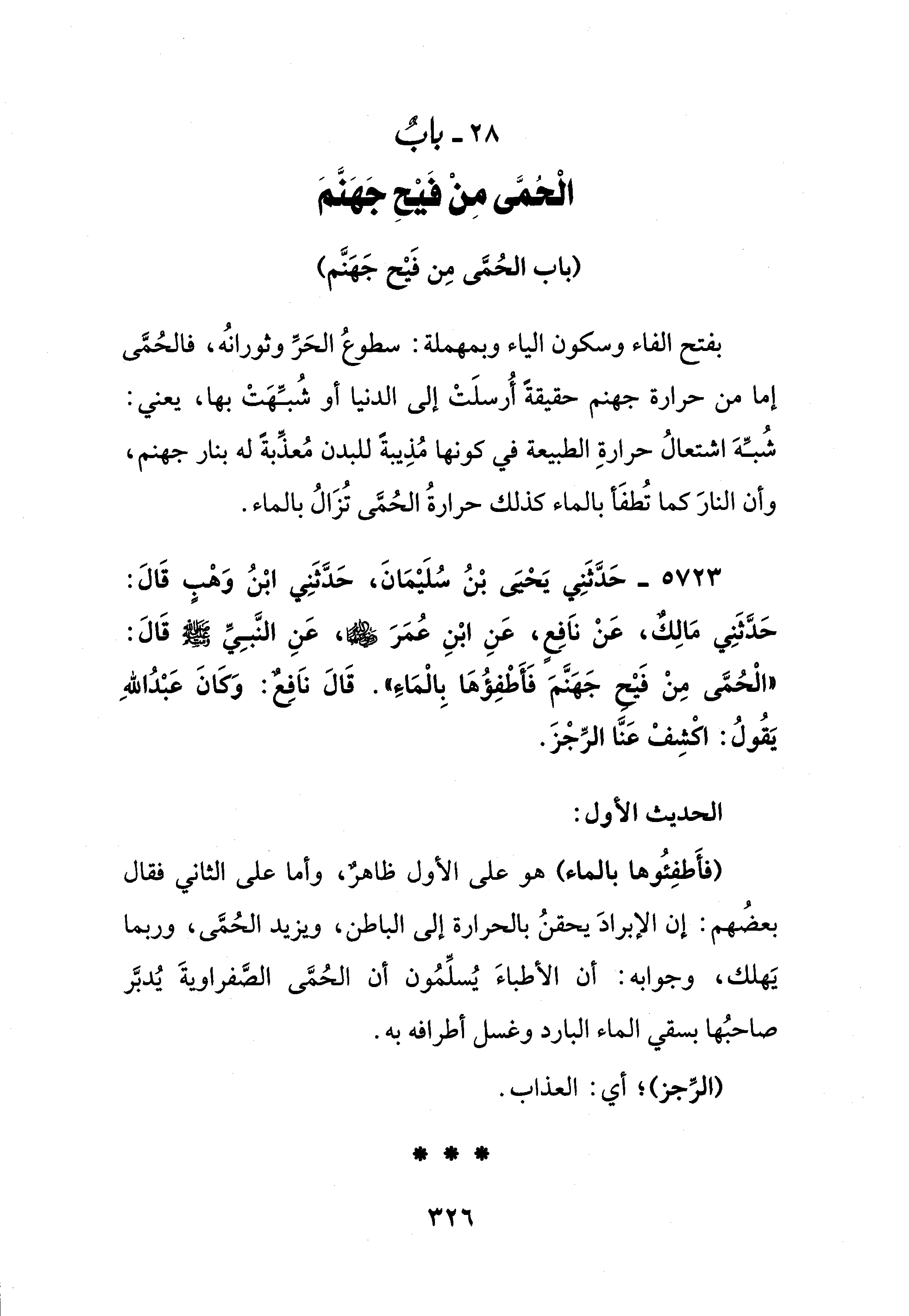 5723 - حَدَّثَنِي يَحْيَى بْنُ سُلَيْمَانَ، حَدَّثَنِي ابْنُ وَهْبٍ قَالَ: حَدَّثَنِي مَالِكٌ، عَنْ نَافِعٍ، عَنِ ابْنِ عُمَرَ - رضي الله عنهما -، عَنِ النَّبِيِّ - صلى الله عليه وسلم - قَالَ: "الْحُمَّى مِنْ فَيْحِ جَهَنَّمَ فَأطْفِؤُهَا بِالْمَاءِ". قَالَ نَافِعٌ: وَكَانَ عَبْدُ اللهِ يَقُولُ: اكشِفْ عَنَّا الرِّجْزَ.