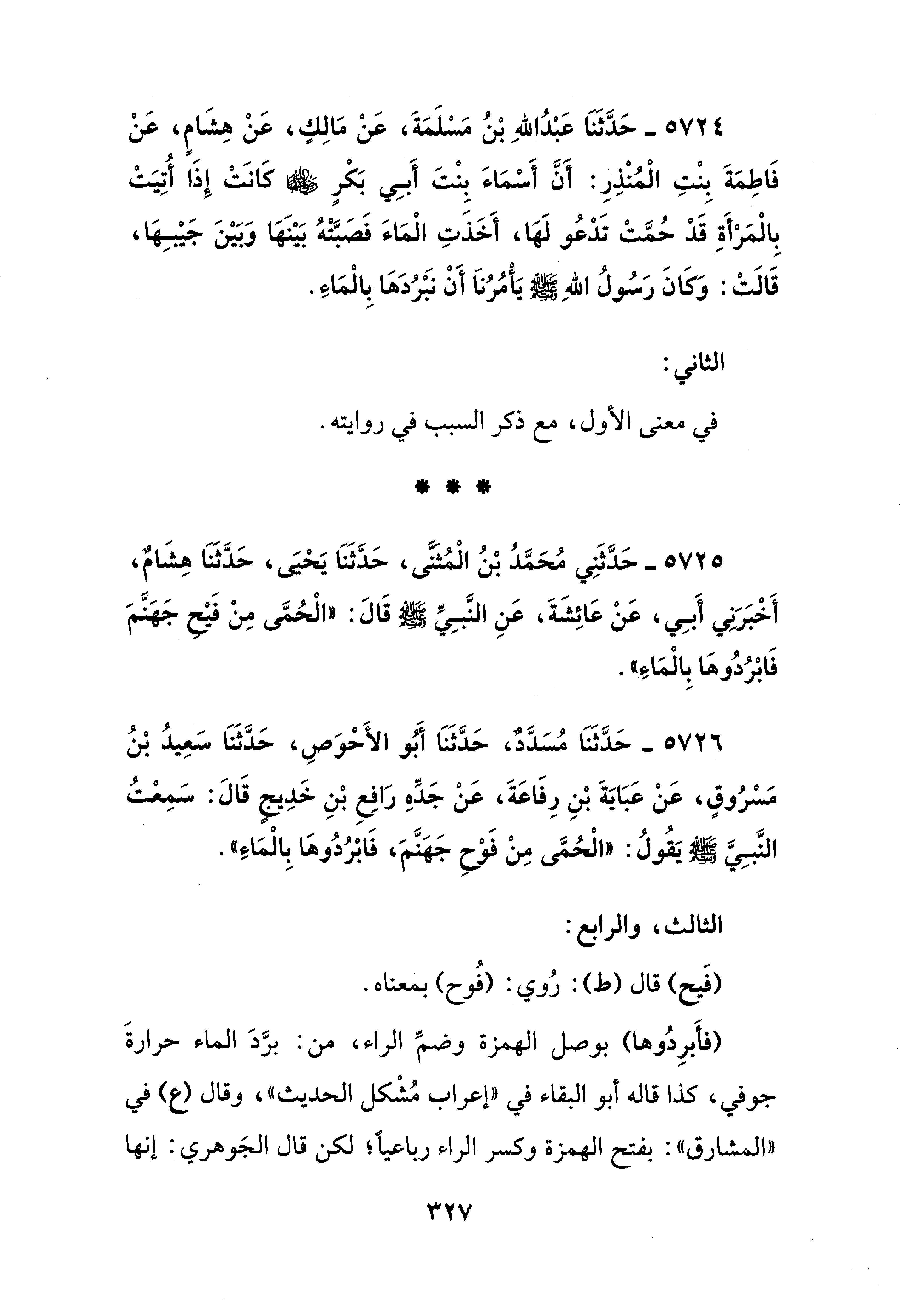 5724 - حَدَّثَنَا عَبْدُ اللهِ بْنُ مَسْلَمَةَ، عَنْ مَالِكٍ، عَنْ هِشَامٍ، عَنْ فَاطِمَةَ بِنْتِ الْمُنْذِرِ: أَنَّ أَسْمَاءَ بِنْتَ أَبِي بَكْرٍ - رضي الله عنهما - كَانَتْ إِذَا أُتِيَتْ بِالْمَرْأَةِ قَدْ حُمَّتْ تَدْعُو لَهَا، أَخَذَتِ الْمَاءَ فَصَبَّتْهُ بَيْنَهَا وَبَيْنَ جَيْبِهَا، قَالَتْ: وَكَانَ رَسُولُ اللهِ - صلى الله عليه وسلم - يَأمُرُنَا أَنْ نَبْرُدَهَا بِالْمَاءِ.