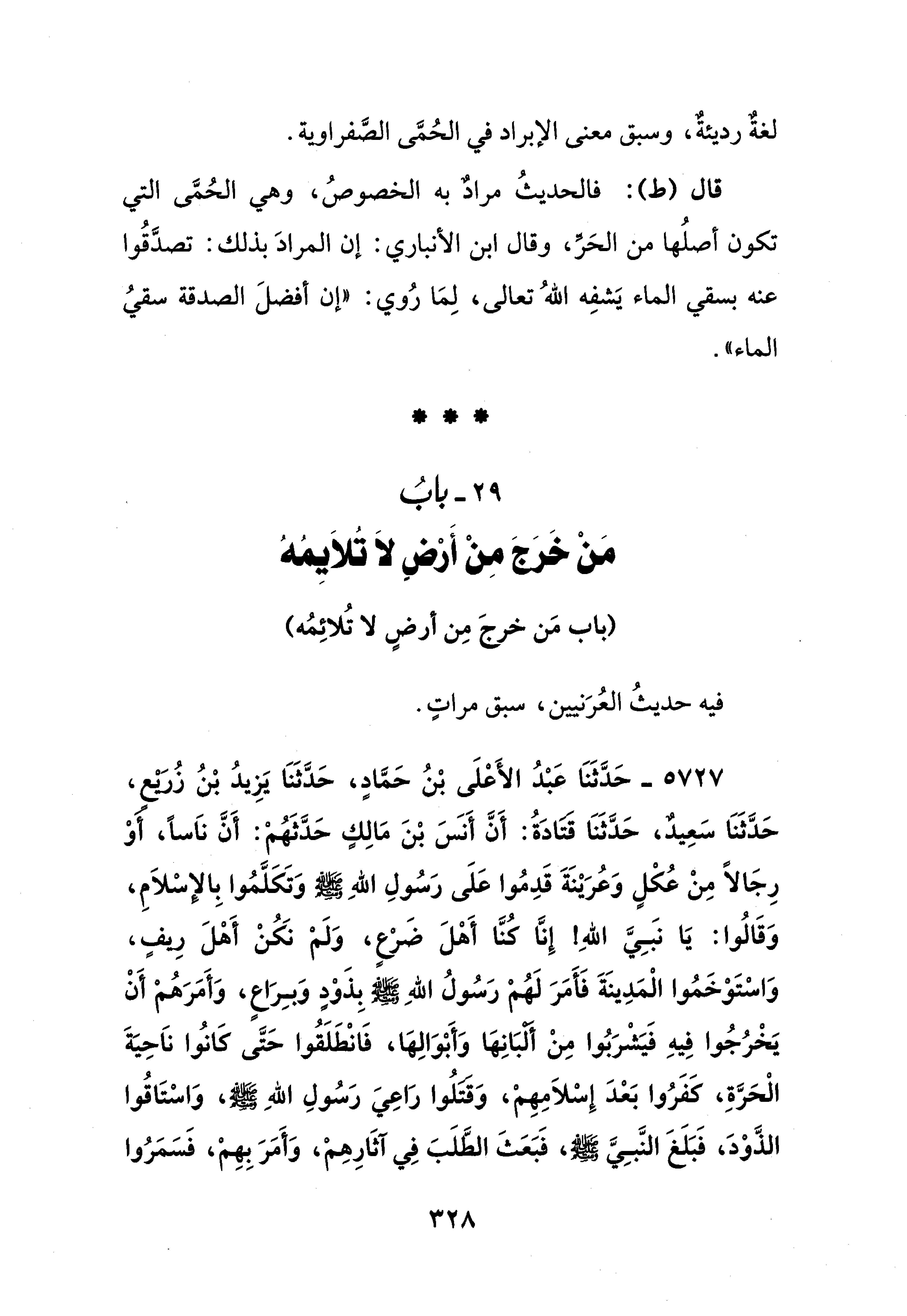 5727 - حَدَّثَنَا عَبْدُ الأَعْلَى بْنُ حَمَّادٍ، حَدَّثَنَا يَزِيدُ بْنُ زُرَيْعٍ، حَدَّثَنَا سَعِيدٌ، حَدَّثَنَا قتادَةُ: أَنَّ أَنس بْنَ مَالِكٍ حَدَّثَهُمْ: أَنَّ نَاسًا، أوْ رِجَالًا مِنْ عُكْلٍ وَعُرَينَةَ قَدِمُوا عَلَى رَسُولِ اللهِ - صلى الله عليه وسلم - وَتَكَلَّمُوا بِالإسْلاَمِ، وَقَالُوا: يَا نبَيَّ اللهِ إِنَّا كُنَّا أَهْلَ ضَرْعٍ، وَلَمْ نكُنْ أَهْلَ رِيفٍ، وَاسْتَوخَمُوا الْمَدِينَةَ فَأَمَرَ لَهُم رَسُولُ اللهِ - صلى الله عليه وسلم - بِذَوْدٍ وَبِرَاعٍ، وَأَمَرَهُمْ أَنْ يَخْرُجُوا فِيهِ فَيَشْرَبُوا مِنْ ألبَانِهَا وَأَبْوَالِهَا، فَانْطَلَقُوا حَتَّى كَانُوا نَاحِيةَ الْحَرَّةِ، كَفَرُوا بَعْدَ إِسْلاَمِهِمْ، وَقتلُوا رَاعِيَ رَسُولِ اللهِ - صلى الله عليه وسلم -، وَاسْتَاقُوا الذَّوْدَ، فَبَلَغَ النَّبِي - صلى الله عليه وسلم -، فَبَعَثَ الطَّلَبَ فِي آثَارِهِم، وَأَمَرَ بِهِم، فَسَمَرُوا