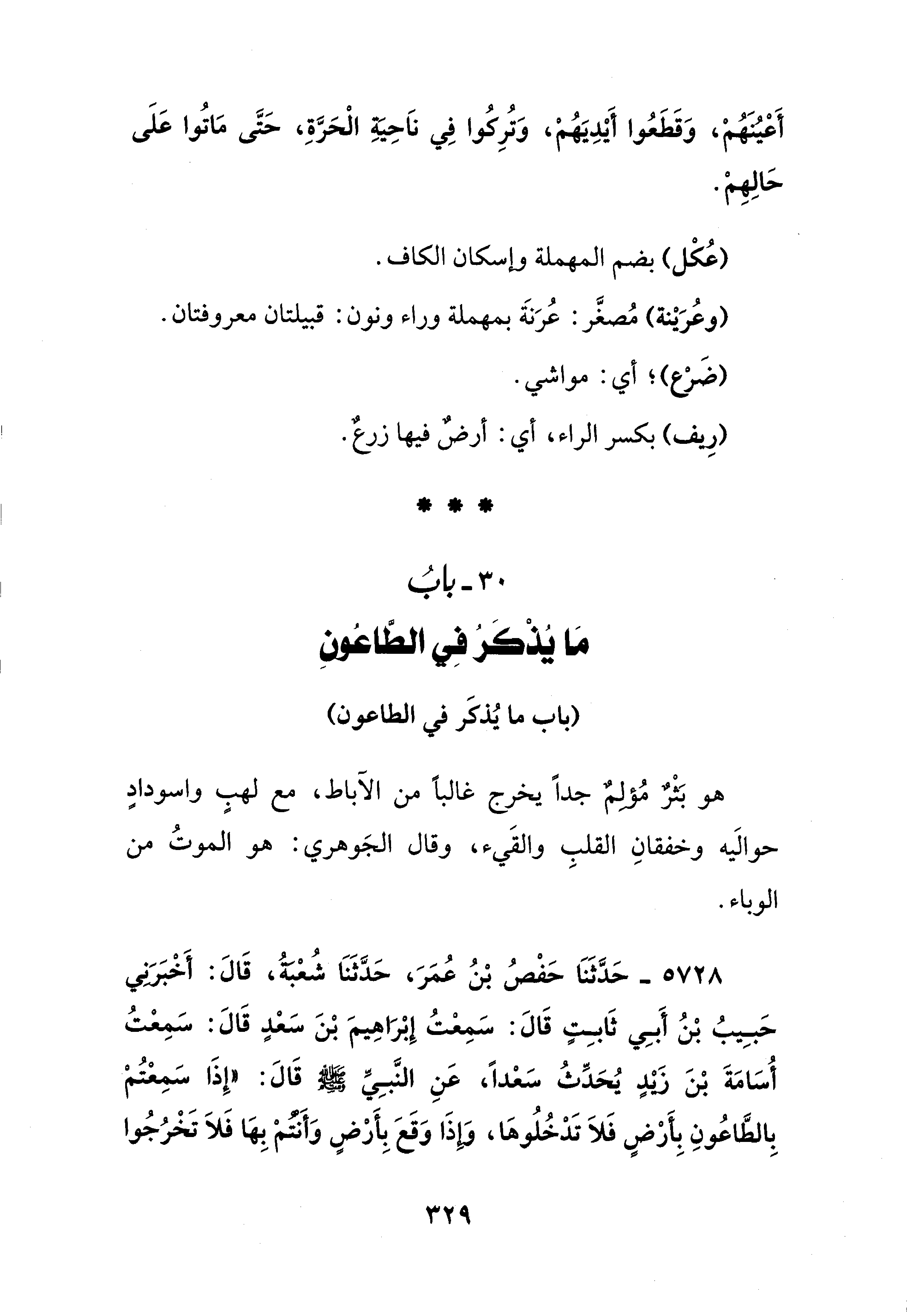 5728 - حَدَّثَنَا حَفْصُ بْنُ عُمَرَ، حَدَّثَنَا شُعْبةُ، قَالَ: أَخْبَرَني حَبِيبُ بْنُ أَبِي ثَابِتٍ قَالَ: سَمِعْتُ إِبْرَاهِيمَ بْنَ سَعْدٍ قَالَ: سَمِعْتُ أُسَامَةَ بْنَ زيدٍ يُحَدِّثُ سَعْدًا، عَنِ النَّبِيِّ - صلى الله عليه وسلم - قَالَ: "إِذَا سَمِعْتُمْ بِالطَّاعُونِ بِأَرْضٍ فَلَا تَدْخُلُوهَا، وَإِذَا وَقَعَ بِأرْضٍ وَأَنتمْ بِهَا فَلَا تَخْرُجُوا