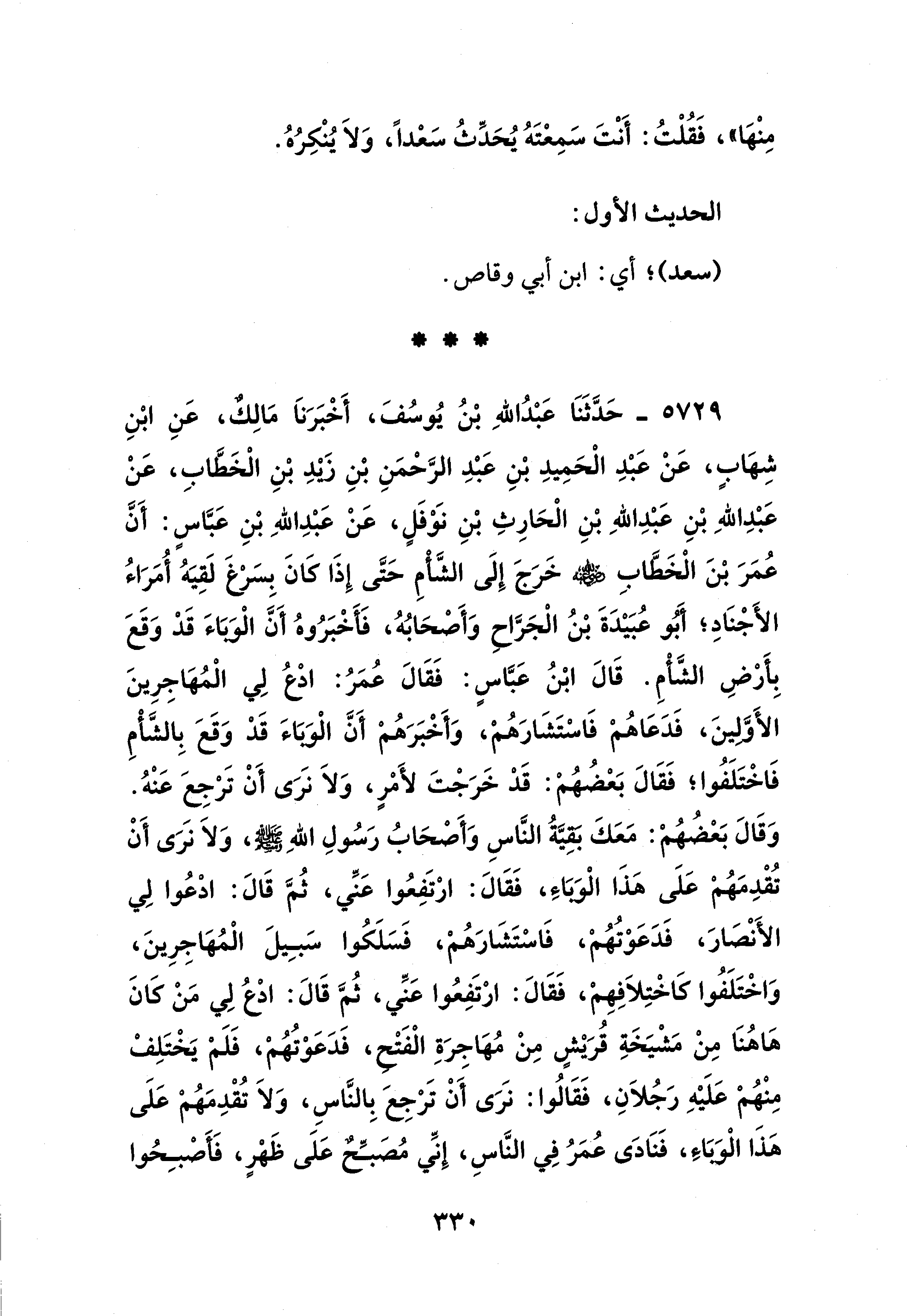 5729 - حَدَّثَنَا عَبْدُ اللهِ بْنُ يُوسُفَ، أَخْبَرَنَا مَالِكٌ، عَنِ ابْنِ شِهَابٍ، عَنْ عَبْدِ الْحَمِيدِ بْنِ عَبْدِ الرَّحْمَنِ بْنِ زبدِ بْنِ الْخَطَّابِ، عَنْ عَبْدِ اللهِ بْنِ عَبْدِ اللهِ بْنِ الْحَارِثِ بْنِ نَوْفَلٍ، عَنْ عَبْدِ اللهِ بْنِ عَبَّاسٍ: أَنَّ عُمَرَ بْنَ الْخَطَّابِ - رضي الله عنه - خَرَجَ إِلَى الشَّأْمِ حَتَّى إِذَا كَانَ بِسَرْغَ لَقِيَهُ أُمَرَاءُ الأَجْنَادِ؛ أَبُو عُبَيْدَةَ بْنُ الْجَرَّاح وَأَصحَابُهُ، فَأخْبَرُوهُ أَنَّ الْوَباءَ قَدْ وَقَعَ بِأرْضِ الشَّأْمِ. قَالَ ابْنُ عَبَّاسٍ: فَقَالَ عُمَرُ: ادع لِي الْمُهَاجِرِينَ الأَوَّلينَ، فَدَعَاهُمْ فَاسْتَشَارَهُمْ، وَأَخْبَرَهُمْ أَنَّ الْوَبَاءَ قَدْ وَقَعَ بِالشَّأْمِ فَاخْتَلَفُوا؛ فَقَالَ بَعْضُهُمْ: قَدْ خَرَجْتَ لأَمْرٍ، وَلَا نَرَى أَنْ تَرْجِعَ عَنْهُ. وَقَالَ بَعْضُهُمْ: مَعَكَ بقِيَّةُ النَّاسِ وَأَصْحَابُ رَسُولِ اللهِ - صلى الله عليه وسلم -، وَلَا نَرَى أَنْ تُقْدِمَهُمْ عَلَى هَذَا الْوَبَاءِ، فَقَالَ: ارْتَفِعُوا عَنِّي، ثُمَّ قَالَ: ادْعُوا لِي الأَنْصَارَ، فَدَعَوْتُهُمْ، فَاسْتَشَارَهُمْ، فَسَلَكُوا سَبِيلَ الْمُهَاجِرِينَ، وَاخْتَلَفُوا كَاخْتِلاَفِهِمْ، فَقَالَ: ارْتَفِعُوا عَنِّي، ثُمَّ قَالَ: ادْعُ لِي مَنْ كَانَ هَاهُنَا مِنْ مَشْيَخَةِ قُرَيْشٍ مِنْ مُهَاجِرَةِ الْفَتْح، فَدَعَوْتُهُمْ، فَلَمْ يَخْتَلِفْ مِنْهُمْ عَلَيْهِ رَجُلاَنِ، فَقَالُوا: نَرَى أَنْ تَرْجِعَ بِالنَّاسِ، وَلَا تُقْدِمَهُمْ عَلَى هَذَا الْوَبَاءِ، فَنَادَى عُمَرُ فِي النَّاسِ، إِنِّي مُصَبِّحٌ عَلَى ظَهْرٍ، فَأصْبِحُوا
