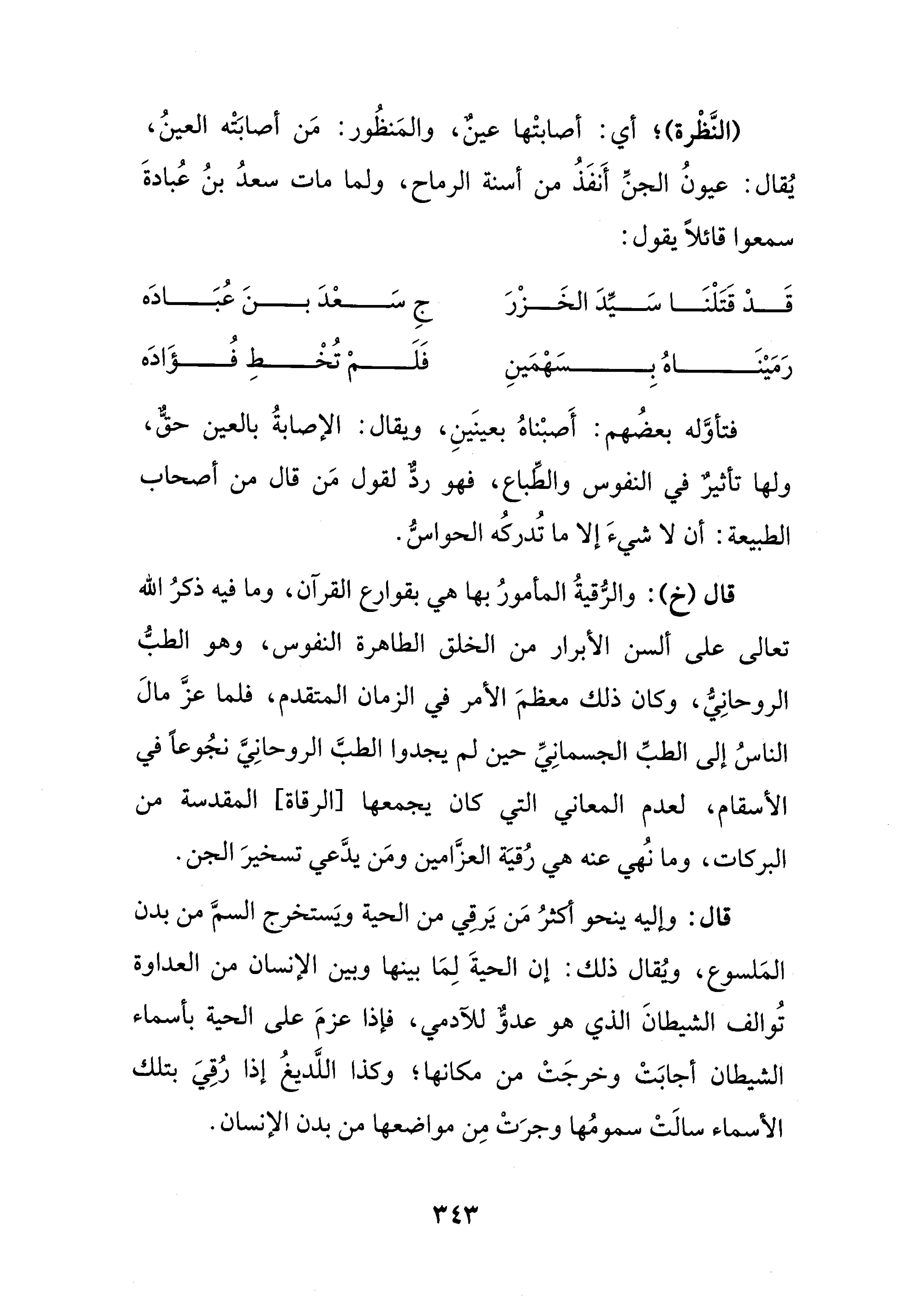 قال (خ): والرُّقيةُ المأمورُ بها هي بقوارع القرآن، وما فيه ذكرُ الله تعالى على ألسن الأبرار من الخلق الطاهرة النفوس، وهو الطبُّ الروحانِيُّ، وكان ذلك معظمَ الأمر في الزمان المتقدم، فلما عزَّ مالَ الناسُ إلى الطبِّ الجسمانِيِّ حين لم يجدوا الطبَّ الروحانِيَّ نجُوعًا في الأسقام، لعدم المعاني التي كان يجمعها [الرقاة] المقدسة من البركات، وما نُهي عنه هي رُقيَة العزَّامين ومَن يدَّعي تسخيرَ الجن.