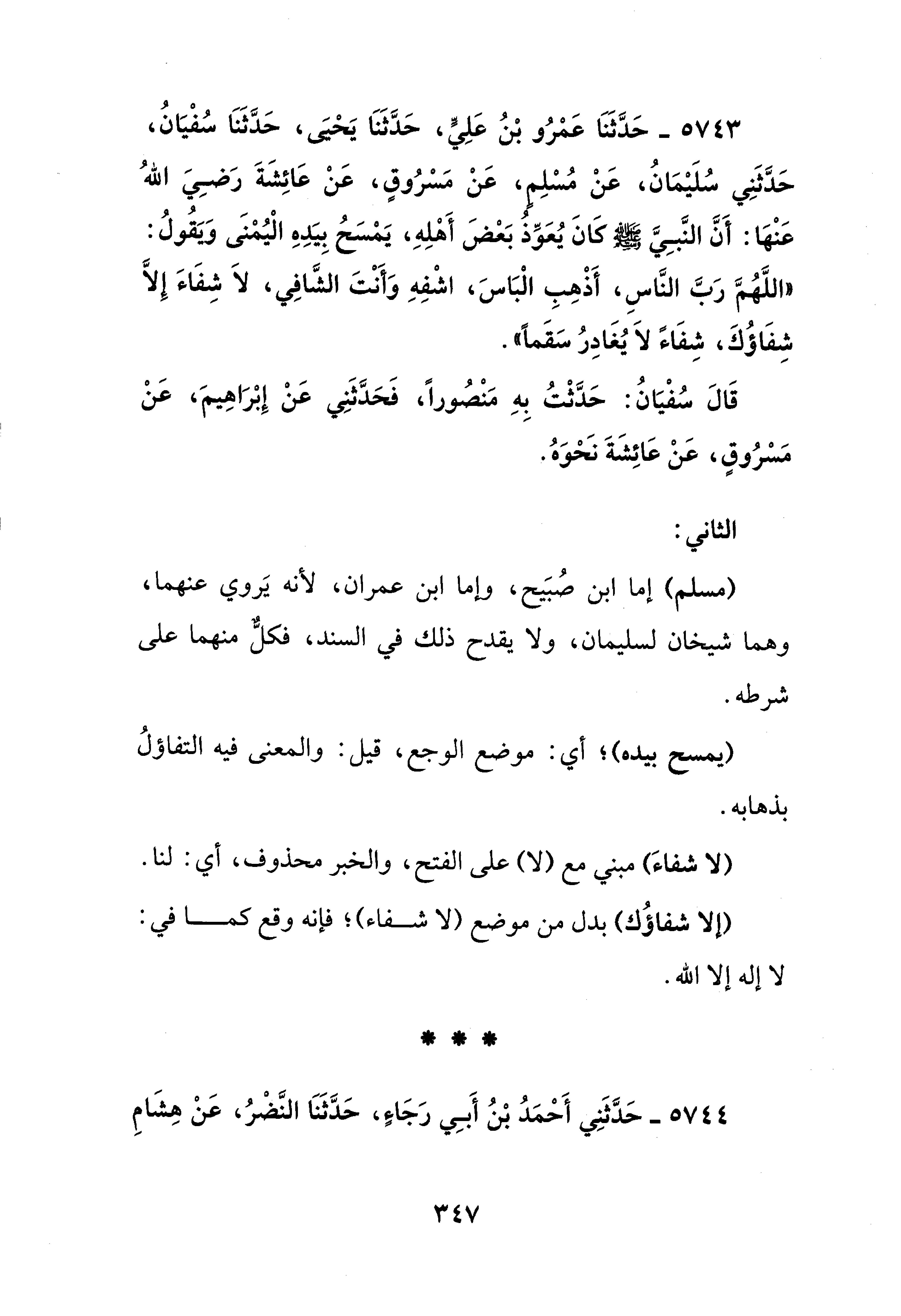 5743 - حَدَّثَنَا عَمْرُو بْنُ عَلِيُّ، حَدَّثَنَا يَحْيَى، حَدَّثَنَا سُفْيَانُ، حَدَّثَنِي سُلَيْمَانُ، عَنْ مُسْلِمٍ، عَنْ مَسْرُوقٍ، عَنْ عَائِشَةَ رَضِيَ اللهُ عَنْهَا: أَنَّ النَّبِيَّ - صلى الله عليه وسلم - كَانَ يُعَوِّذُ بَعْضَ أَهْلِهِ، يَمْسَحُ بِيَدِهِ الْيُمْنَى وَيَقُولُ: "اللهُمَّ رَبَّ النَّاسِ، أَذْهِبِ الْبَاسَ، اشْفِهِ وَأَنْتَ الشَّافِي، لَا شِفَاءَ إِلَّا شِفَاؤُكَ، شِفَاءً لَا يُغادِرُ سَقَمًا".