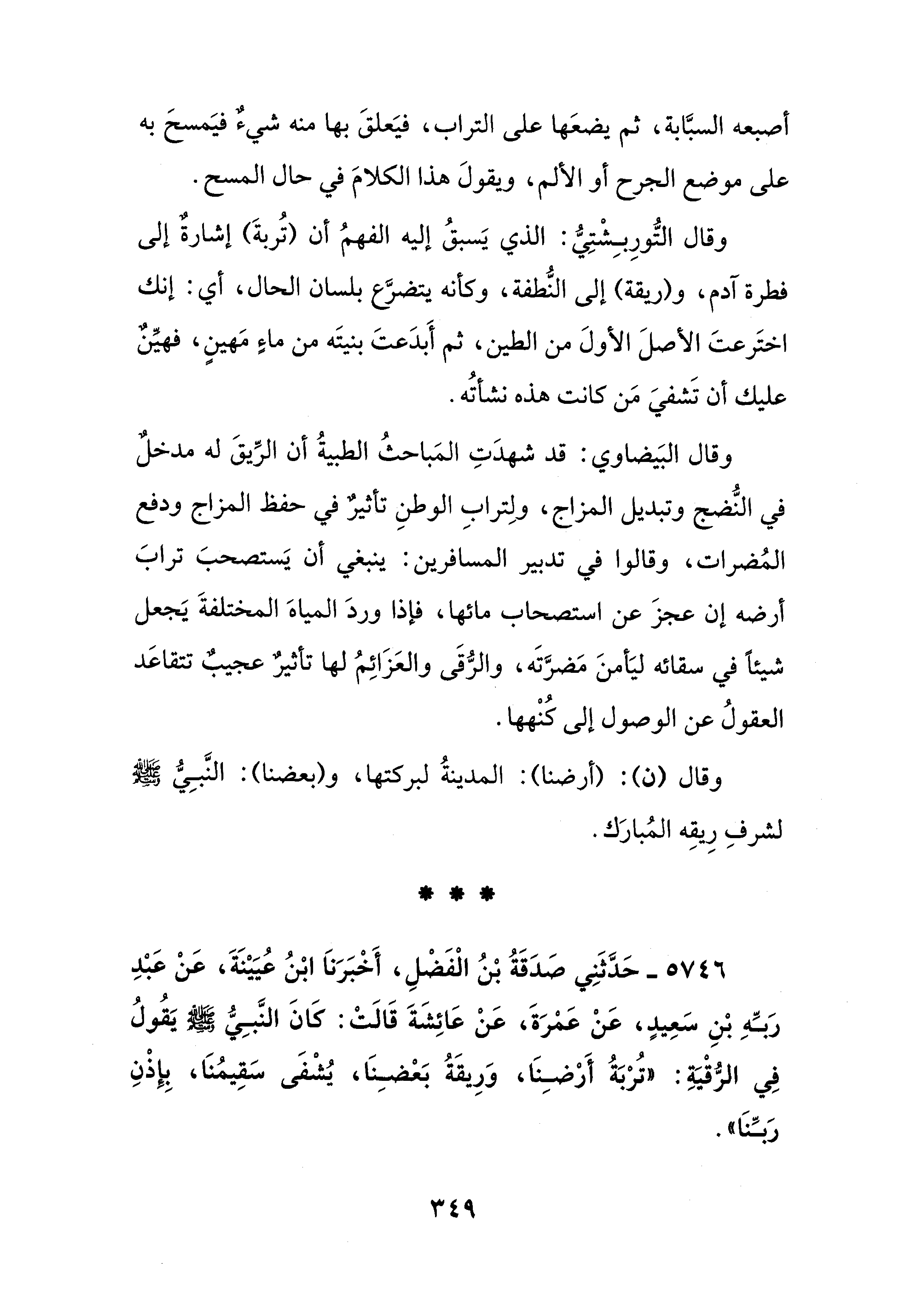 5746 - حَدَّثَنِي صَدَقَةُ بْنُ الْفَضْلِ، أَخْبَرَنَا ابْنُ عُيَيْنَةَ، عَنْ عَبْدِ رَبِّهِ بْنِ سَعِيدٍ، عَنْ عَمْرَةَ، عَنْ عَائِشَةَ قَالَتْ: كَانَ النَّبِيُّ - صلى الله عليه وسلم - يَقُولُ في الرُّقْية: "تُرْبَةُ أَرْضِنَا، وَرِيقَةُ بَعْضِنَا، يُشْفَى سَقِيمُنَا، بِإِذْنِ رَبِّنَا".