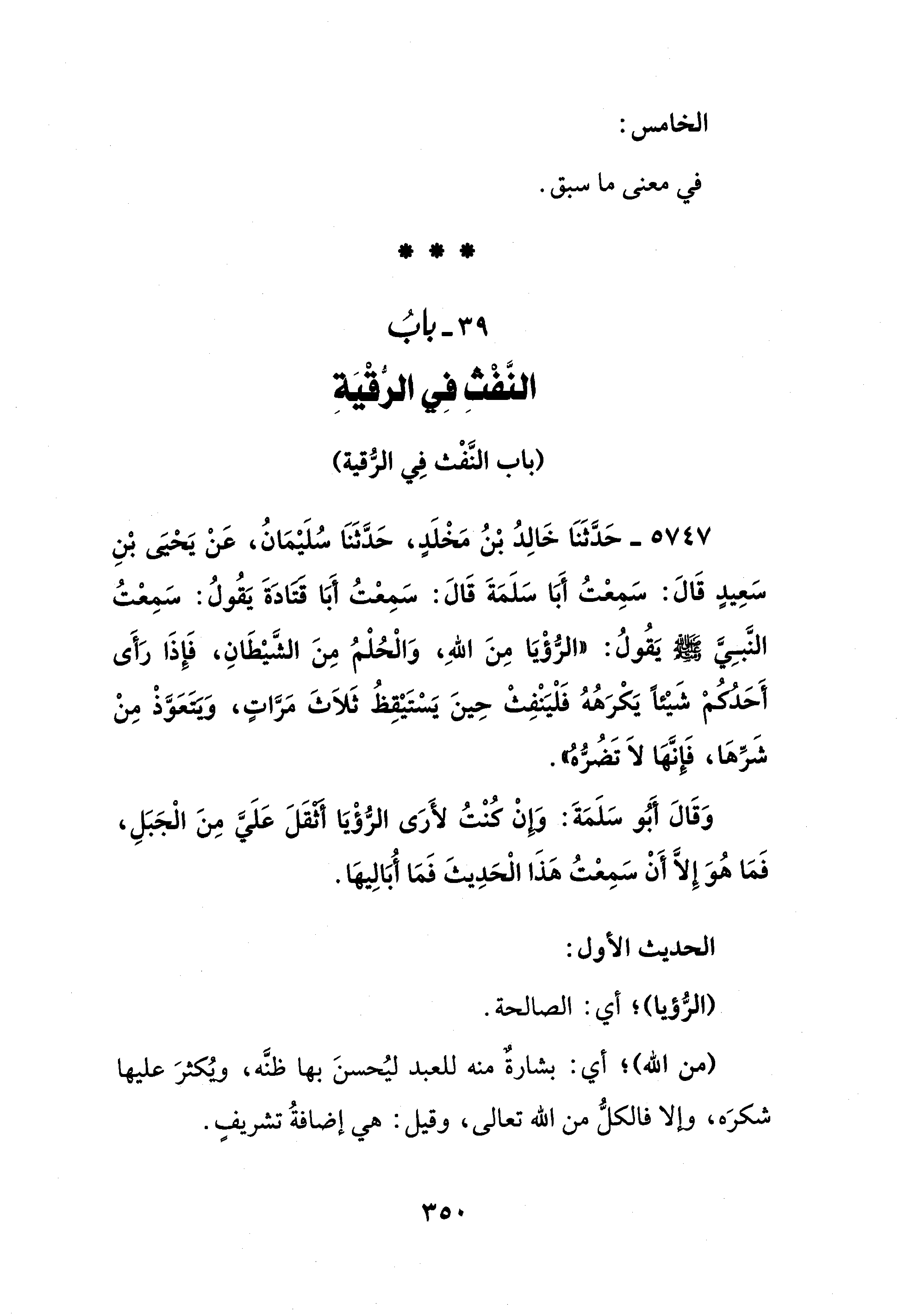 5747 - حَدَّثَنَا خَالِدُ بْنُ مَخْلَدٍ، حَدَّثَنَا سُلَيْمَانُ، عَنْ يَحْيَى بْنِ سَعِيدٍ قَالَ: سَمِعْتُ أَبَا سَلَمَةَ قَالَ: سَمِعْتُ أَبَا قتادَةَ يَقُولُ: سَمِعْتُ النَّبِيَّ - صلى الله عليه وسلم - يَقُولُ: "الرُّؤْيَا مِنَ اللهِ، وَالْحُلْمُ مِنَ الشَّيْطَانِ، فَإِذَا رَأَى أَحَدُكُمْ شَيْئًا يَكْرَهُهُ فَلْيَنْفِثْ حِينَ يَسْتَيْقِظُ ثَلاَثَ مَرَّاتٍ، وَيتعَوَّذْ مِنْ شَرِّهَا، فَإنَّهَا لَا تَضُرُّهُ".