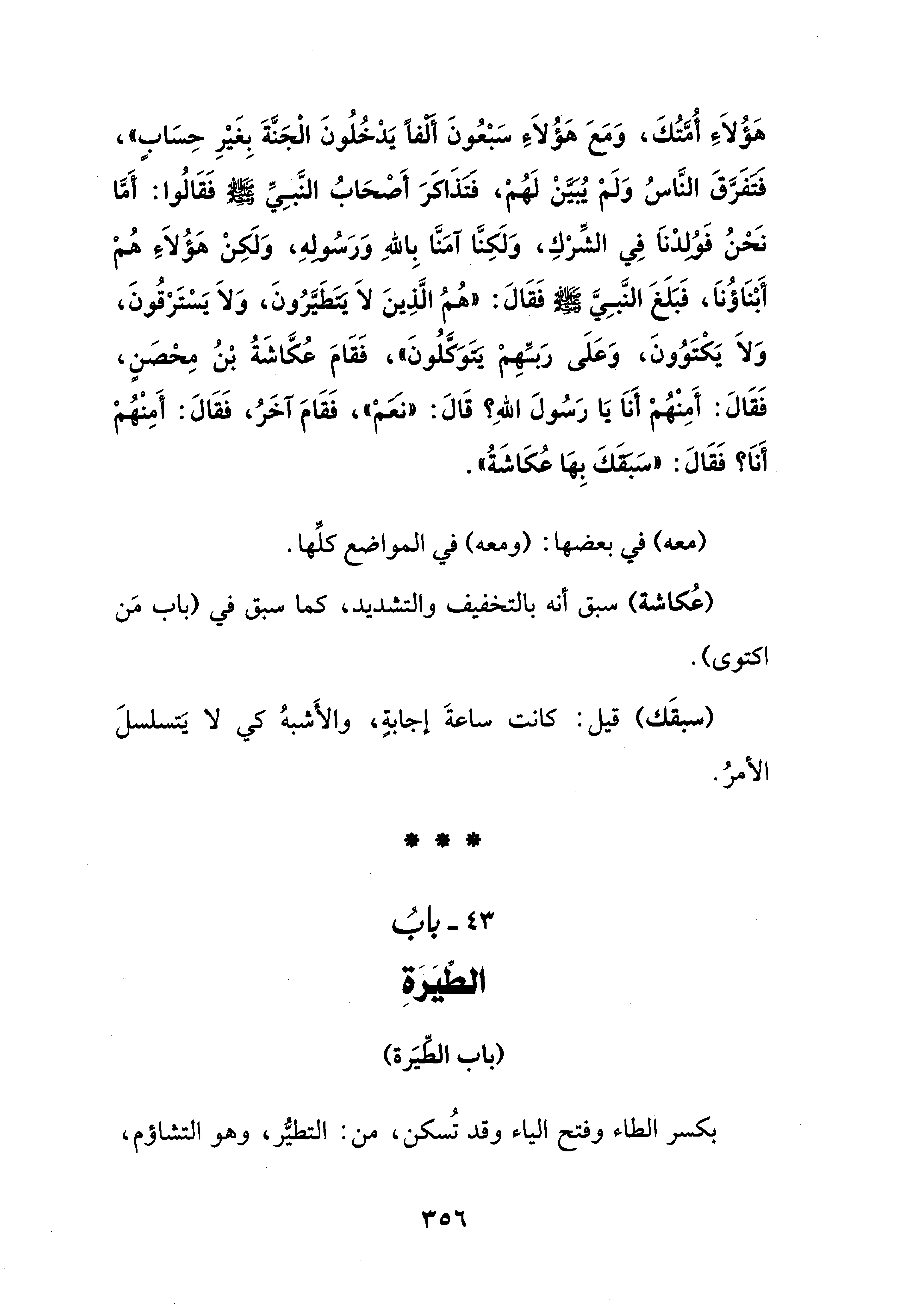 هَؤُلاَء أُمَّتُكَ، وَمَعَ هَؤُلاَء سَبْعُونَ ألفًا يَدْخُلُونَ الْجَنَّةَ بِغَيْرِ حِسَابٍ"، فتفَرَّقَ النَّاسُ وَلَمْ يُبيَّنْ لَهُمْ، فتذَاكَرَ أَصْحَابُ النَّبِيِّ - صلى الله عليه وسلم - فَقَالُوا: أَمَّا نَحْنُ فَوُلِدْنَا في الشِّرْكِ، وَلَكِنَّا آمَنَّا بِاللهِ وَرَسُولهِ، وَلَكِنْ هَؤُلاَء هُمْ أَبْنَاؤُنَا، فَبَلَغَ النَّبِيَّ - صلى الله عليه وسلم - فَقَالَ: "هُمُ الَّذِينَ لَا يتطَيَّرُونَ، وَلَا يَسْتَرْقُونَ، وَلَا يَكْتَوُونَ، وَعَلَى رَبِّهِمْ يتوَكلُونَ"، فَقَامَ عُكَّاشَةُ بْنُ مِحْصَنٍ، فَقَالَ: أَمِنْهُمْ أَنَا يَا رَسُولَ اللهِ؟ قَالَ: "نعمْ"، فَقَامَ آخَرُ، فَقَالَ: أَمِنْهُمْ أَنَا؟ فَقَالَ: "سَبقَكَ بِهَا عُكَاشَةُ".