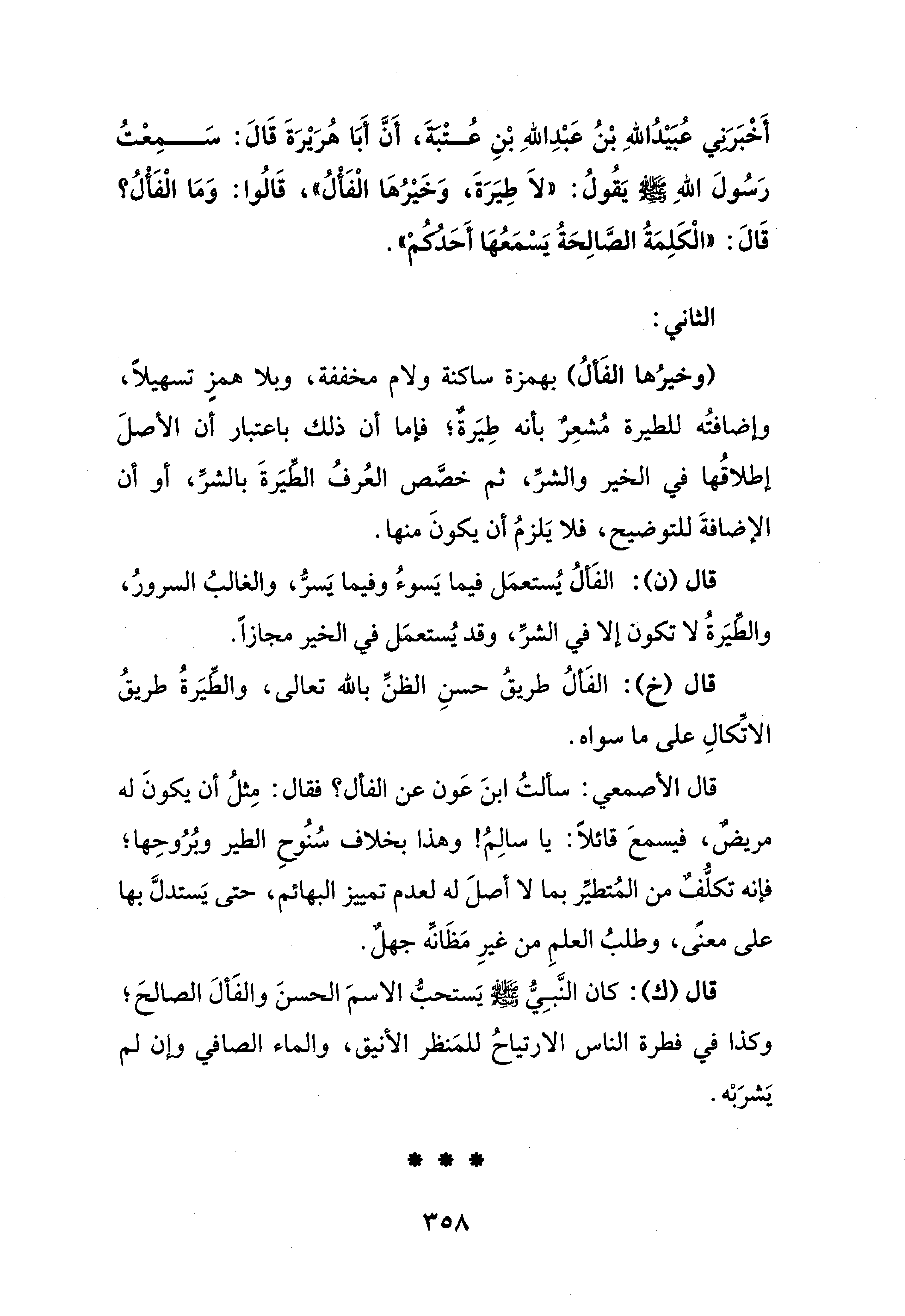 قال الأصمعي: سألتُ ابنَ عَون عن الفأل؟ فقال: مِثلُ أن يكونَ له مريضٌ، فيسمعَ قائلًا: يا سالِمُ! وهذا بخلاف سُنُوحِ الطير وبُرُوحِها؛ فإنه تكلُّفٌ من المُتطيِّر بما لا أصلَ له لعدم تمييز البهائم، حتى يَستدلَّ بها على معنًى، وطلبُ العلمِ من غيرِ مَظَانِّه جهلٌ.