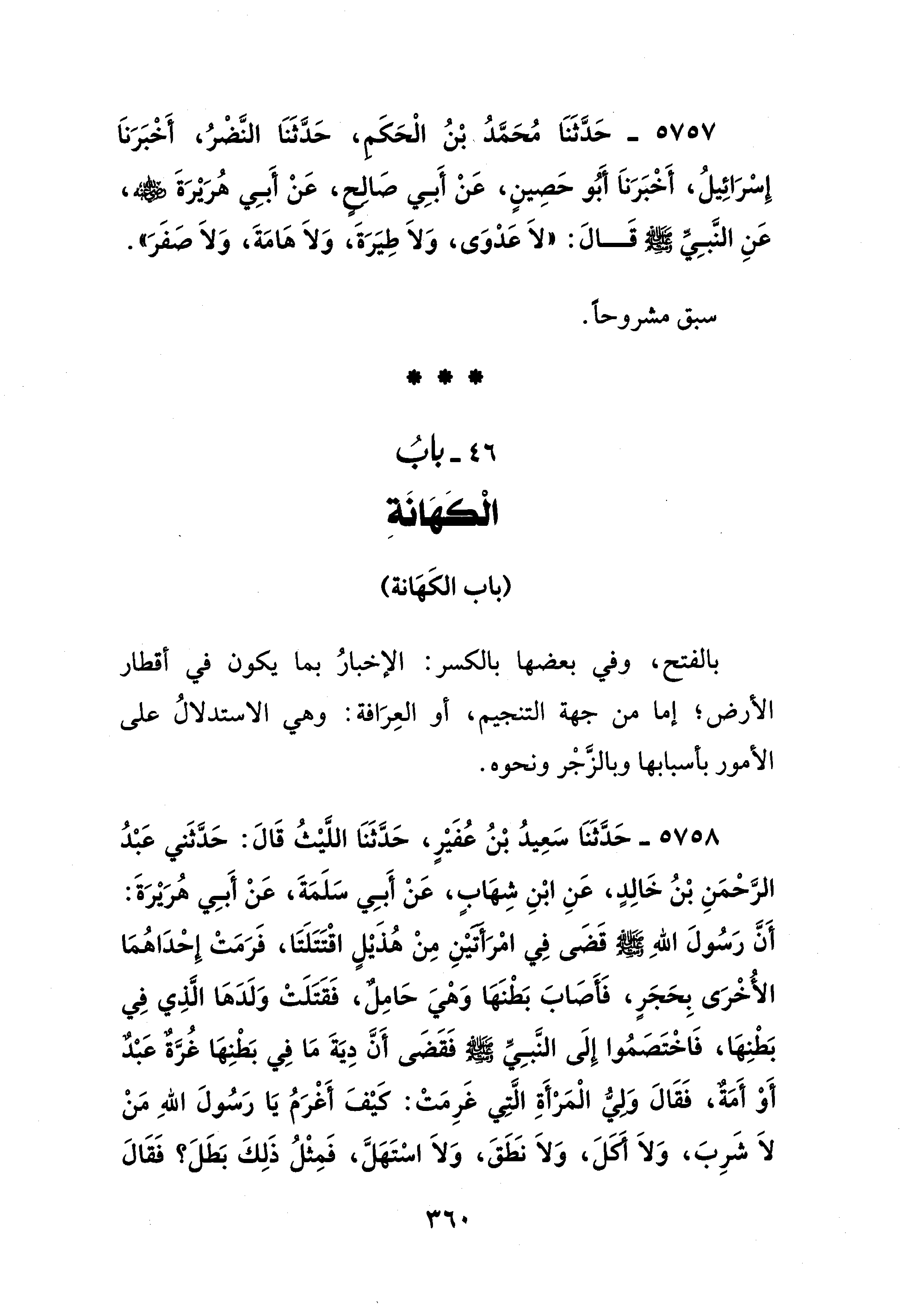 5757 - حَدَّثَنَا مُحَمَّدُ بْنُ الْحَكَم، حَدَّثَنَا النَّضْرُ، أَخْبَرَنَا إِسْرَائِيلُ، أَخْبَرَنَا أَبُو حَصِينٍ، عَنْ أَبِي صَالِحٍ، عَنْ أَبِي هُرَيْرَةَ - رضي الله عنه -، عَنِ النَّبِي - صلى الله عليه وسلم - قالَ: "لَا عَدْوَى، وَلَا طِيَرَةَ، وَلَا هَامَةَ، وَلَا صَفَرَ".