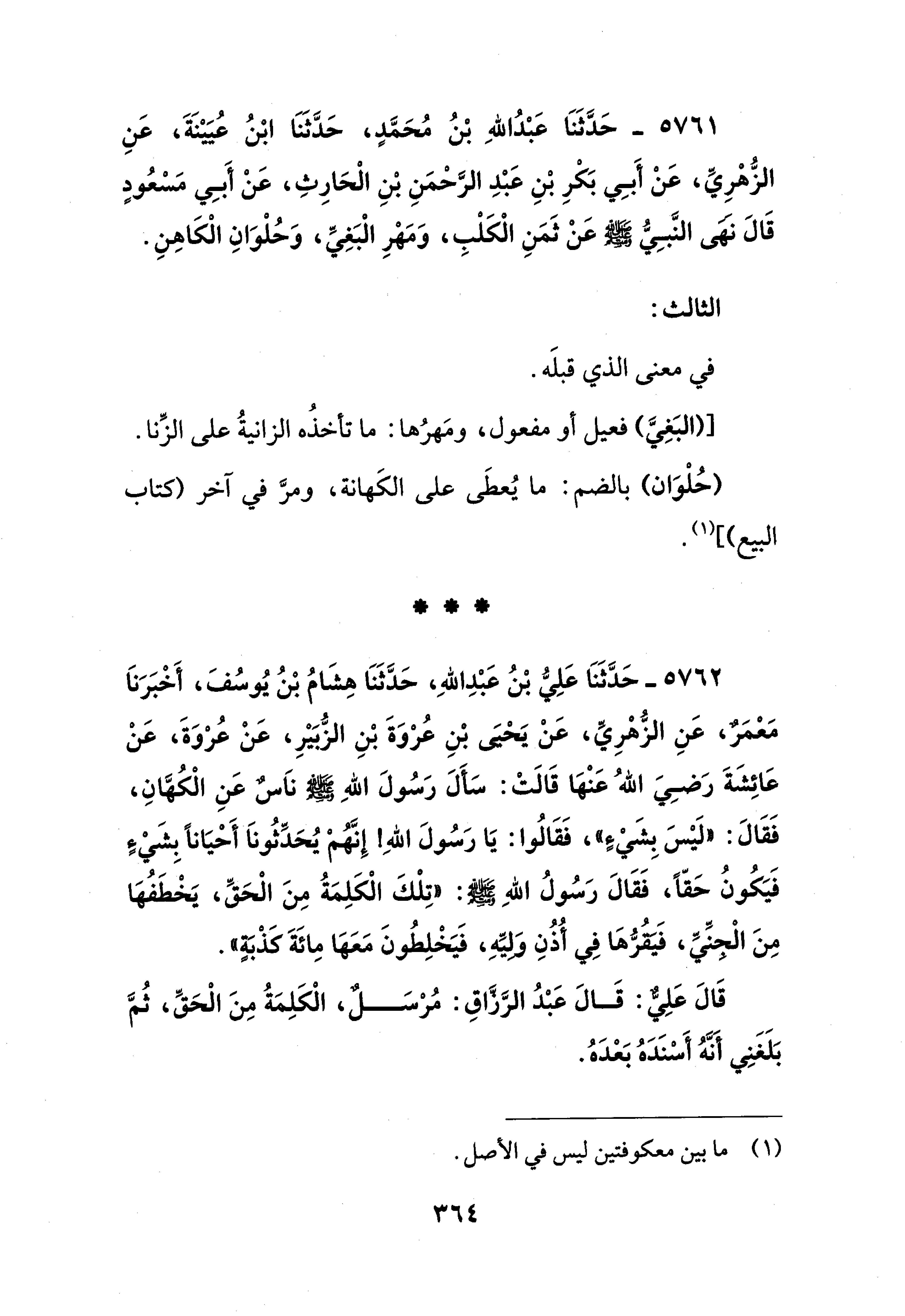 5761 - حَدَّثَنَا عَبْدُ اللهِ بْنُ مُحَمَّدٍ، حَدَّثَنَا ابْنُ عُيَيْنَةَ، عَنِ الزُّهْرِيِّ، عَنْ أَبِي بَكْرِ بْنِ عَبْدِ الرَّحْمَنِ بْنِ الْحَارِثِ، عَنْ أَبِي مَسْعُودٍ قَالَ نهى النَّبِيُّ - صلى الله عليه وسلم - عَنْ ثَمَنِ الْكَلْبِ، وَمَهْرِ الْبَغِي، وَحُلْوَانِ الْكَاهِنِ.