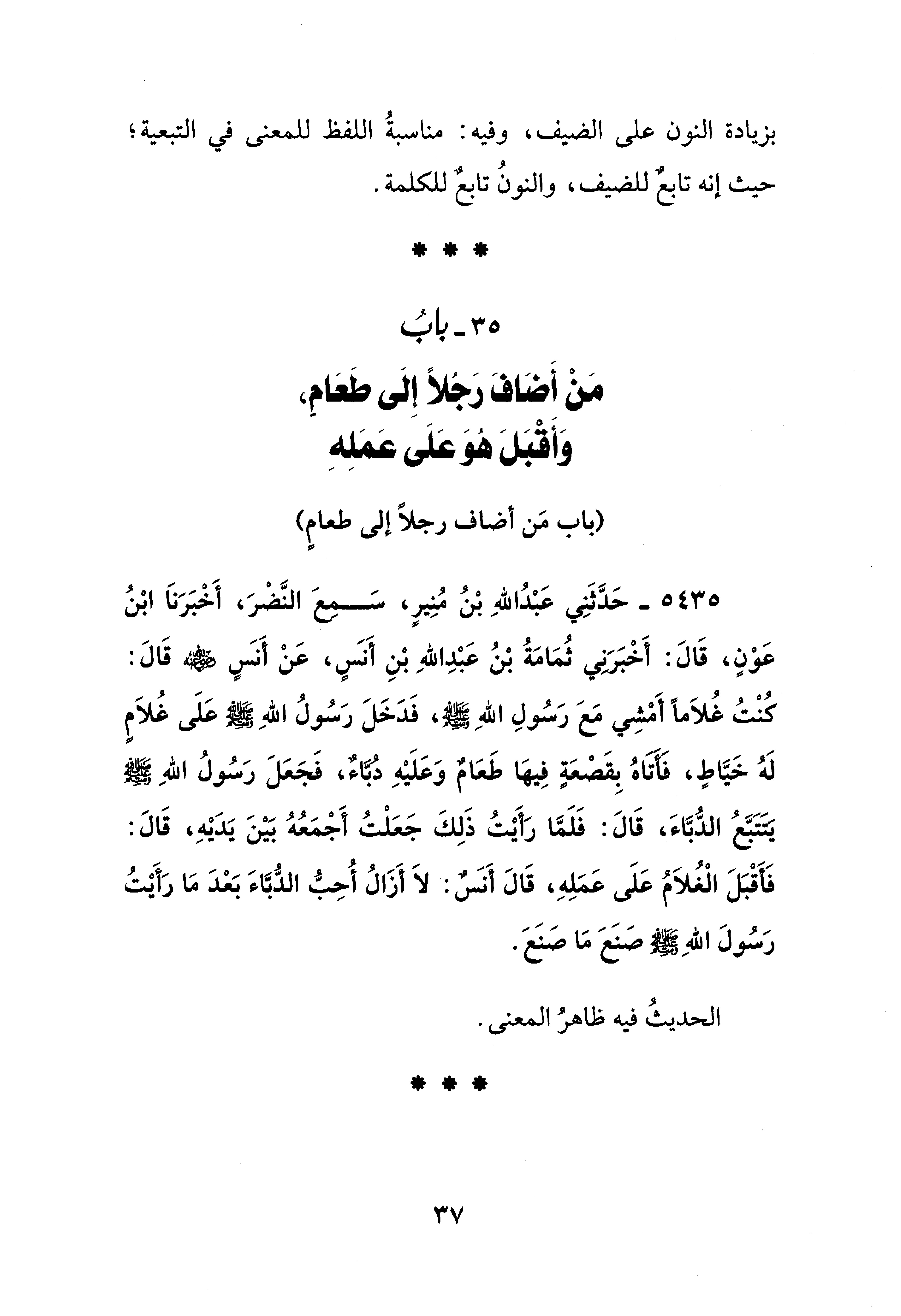 5435 - حَدَّثنِي عَبْدُ اللهِ بْنُ مُنِيرٍ، سَمِعَ النَّضْرَ، أَخْبَرَنَا ابْنُ عَوْنٍ، قَالَ: أَخْبَرَني ثُمَامَةُ بْنُ عَبْدِ اللهِ بْنِ أَنسٍ، عَنْ أَنسٍ - رضي الله عنه - قَالَ: كُنْتُ غُلاَمًا أَمْشِي مَعَ رَسُولِ اللهِ - صلى الله عليه وسلم -، فَدَخَلَ رَسُولُ اللهِ - صلى الله عليه وسلم - عَلَى كُلاَمٍ لَهُ خَيَّاطٍ، فَأتاهُ بِقَصْعَةٍ فِيهَا طَعَامٌ وَعَلَيْهِ دبَاءٌ، فَجَعَلَ رَسُولُ اللهِ - صلى الله عليه وسلم - يتتبَّعُ الدُّبَّاءَ، قَالَ: فَلَمَّا رَأَيْتُ ذَلِكَ جَعَلْتُ أَجْمَعُهُ بَيْنَ يَدَيْهِ، قَالَ: فَأقْبَلَ الْغُلاَمُ عَلَى عَمَلِهِ، قَالَ أَنسٌ: لَا أَزَالُ أُحِبُّ الدُّبَّاءَ بَعْدَ مَا رَأَيْتُ رَسُولَ اللهِ - صلى الله عليه وسلم - صَنَعَ مَا صَنَعَ.