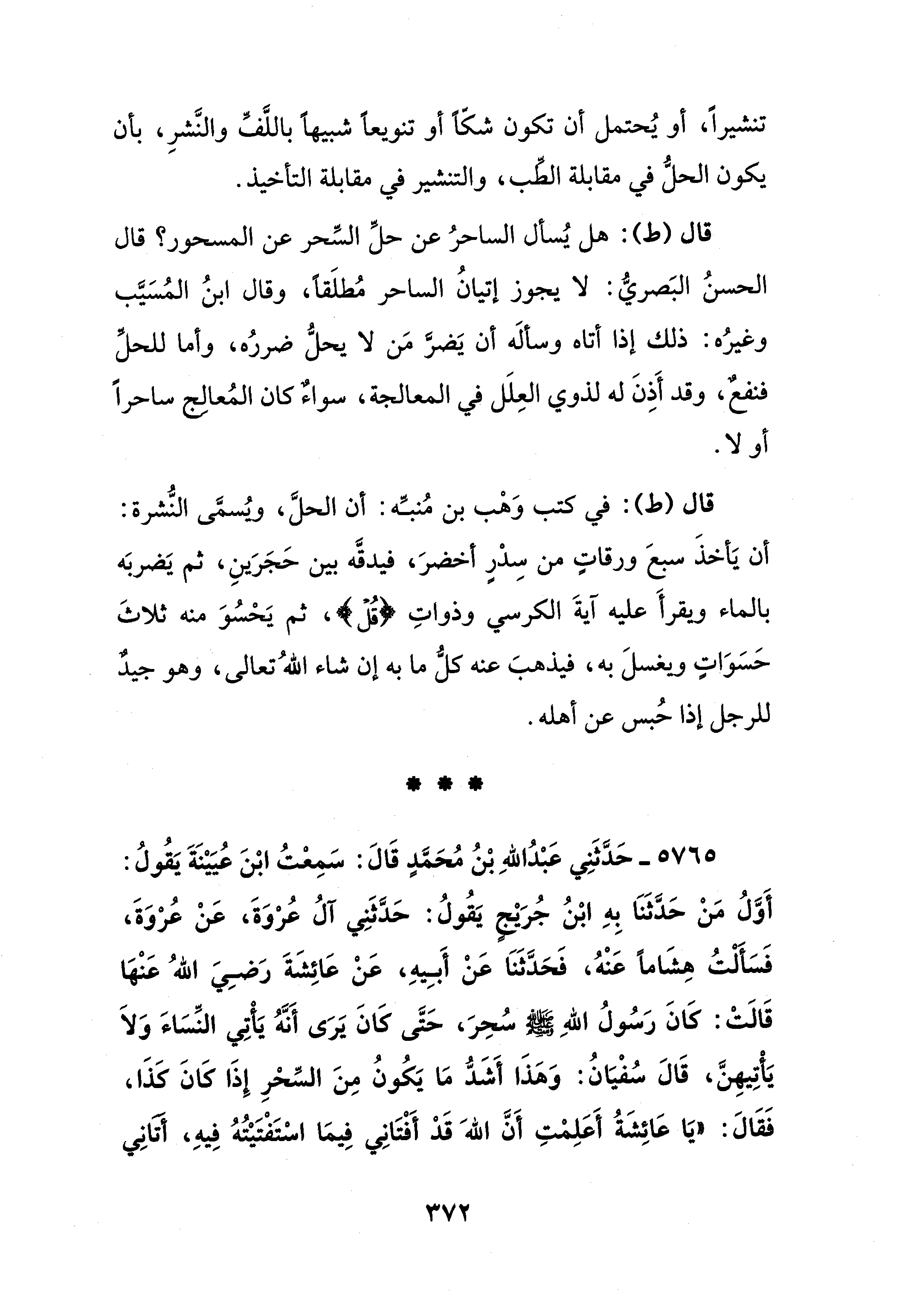 قال (ط): في كتب وَهْب بن مُنبِّه: أن الحلَّ، ويُسمَّى النُّشرة: أن يَأخذَ سبعَ ورقاتٍ من سِدْرٍ أخضرَ، فيدقَّه بين حَجَرَينِ، ثم يَضربَه بالماء ويقرأَ عليه آيةَ الكرسي وذواتِ {قُلْ}، ثم يَحْسُوَ منه ثلاثَ حَسَوَاتٍ ويغسلَ به، فيذهبَ عنه كلُّ ما به إن شاء اللهُ تعالى، وهو جيدٌ للرجل إذا حُبس عن أهله.