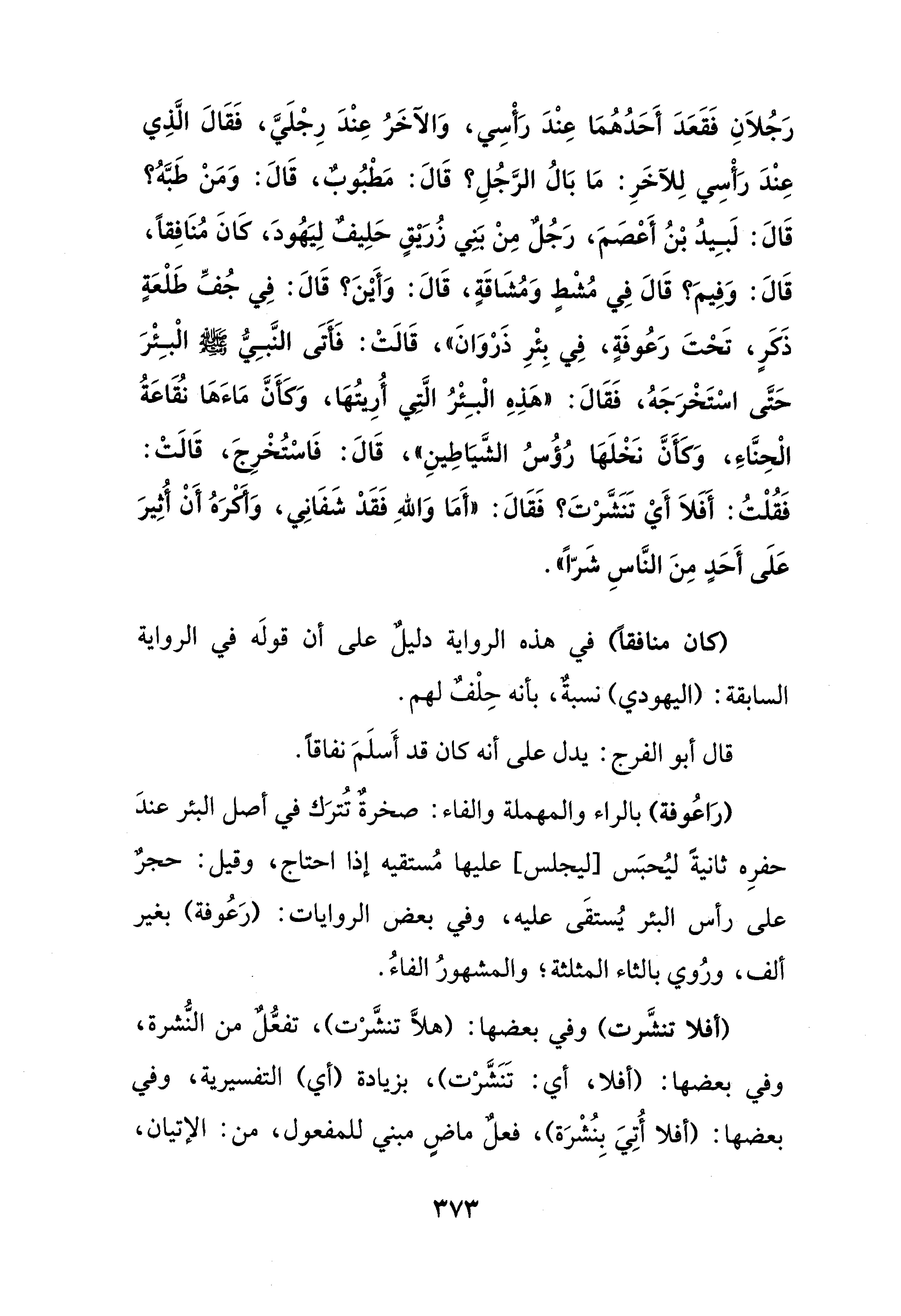 رَجُلاَنِ فَقَعَدَ أَحَدُهُمَا عِنْدَ رَأْسِي، وَالآخَرُ عِنْدَ رِجْلَيَّ، فَقَالَ الَّذِي عِنْدَ رَأْسِي لِلآخَرِ: مَا بَالُ الرَّجُلِ؟ قَالَ: مَطْبُوبٌ، قَالَ: وَمَنْ طَبَّهُ؟ قَالَ: لَبِيدُ بْنُ أَعْصَمَ، رَجُلٌ مِنْ بَنِي زُرَيْقٍ حَلِيفٌ لِيَهُودَ، كانَ مُنَافِقًا، قَالَ: وَفِيمَ؟ قَالَ في مُشْطٍ وَمُشَاقَةٍ، قَالَ: وَأَيْنَ؟ قَالَ: في جُفِّ طَلْعَةٍ ذَكَرٍ، تَحْتَ رَعُوفَةٍ، في بِئْرِ ذَرْوَانَ"، قَالَتْ: فَأَتَى النَّبِيُّ - صلى الله عليه وسلم - الْبِئْرَ حَتَّى اسْتَخْرَجَهُ، فَقَالَ: "هَذِهِ الْبِئْرُ الَّتِي أُرِيتُهَا، وَكَأَنَّ مَاءَهَا نُقَاعَةُ الْحِنَّاءَ، وَكَأَنَّ نَخْلَهَا رُؤُسُ الشَّيَاطِينِ"، قَالَ: فَاسْتُخْرِجَ، قَالَتْ: فَقُلْتُ: أفلاَ أَيْ تنشَّرْتَ؟ فَقَالَ: "أَمَا وَاللهِ فَقَدْ شَفَانِي، وَأكرَهُ أَنْ أُثِيرَ عَلَى أَحَدٍ مِنَ النَّاسِ شَرًّا".
