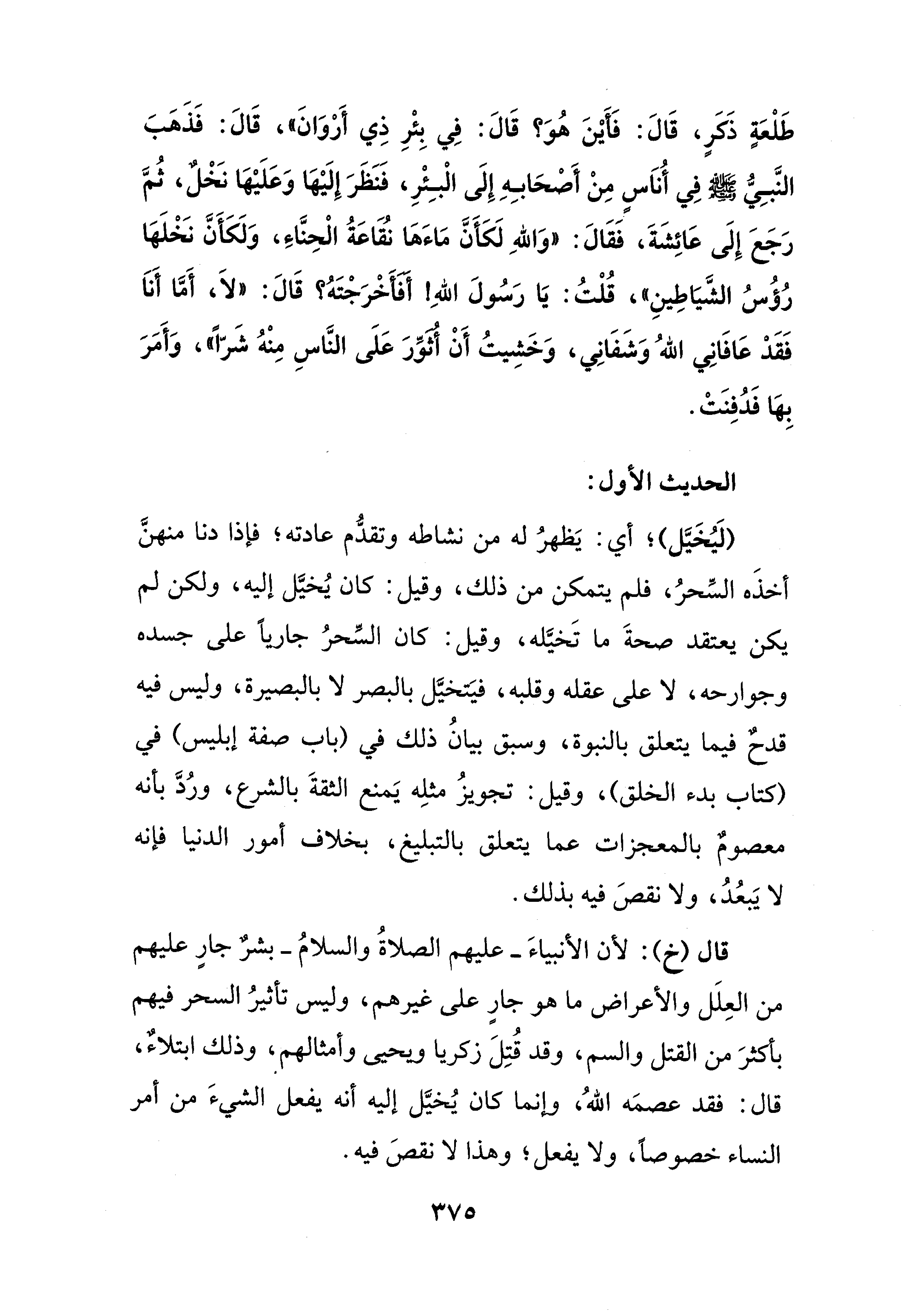قال (خ): لأن الأنبياءَ -عليهم الصلاةُ والسلامُ- بشرٌ جارٍ عليهم من العِلَل والأعراض ما هو جارٍ على غيرهم، وليس تأثيرُ السحر فيهم بأكثرَ من القتل والسم، وقد قُتِلَ زكريا ويحيى وأمثالهم، وذلك ابتلاءٌ، قال: فقد عصمَه اللهُ، وإنما كان يُخيَّل إليه أنه يفعل الشيءَ من أمر النساء خصوصًا، ولا يفعل؛ وهذا لا نقصَ فيه.