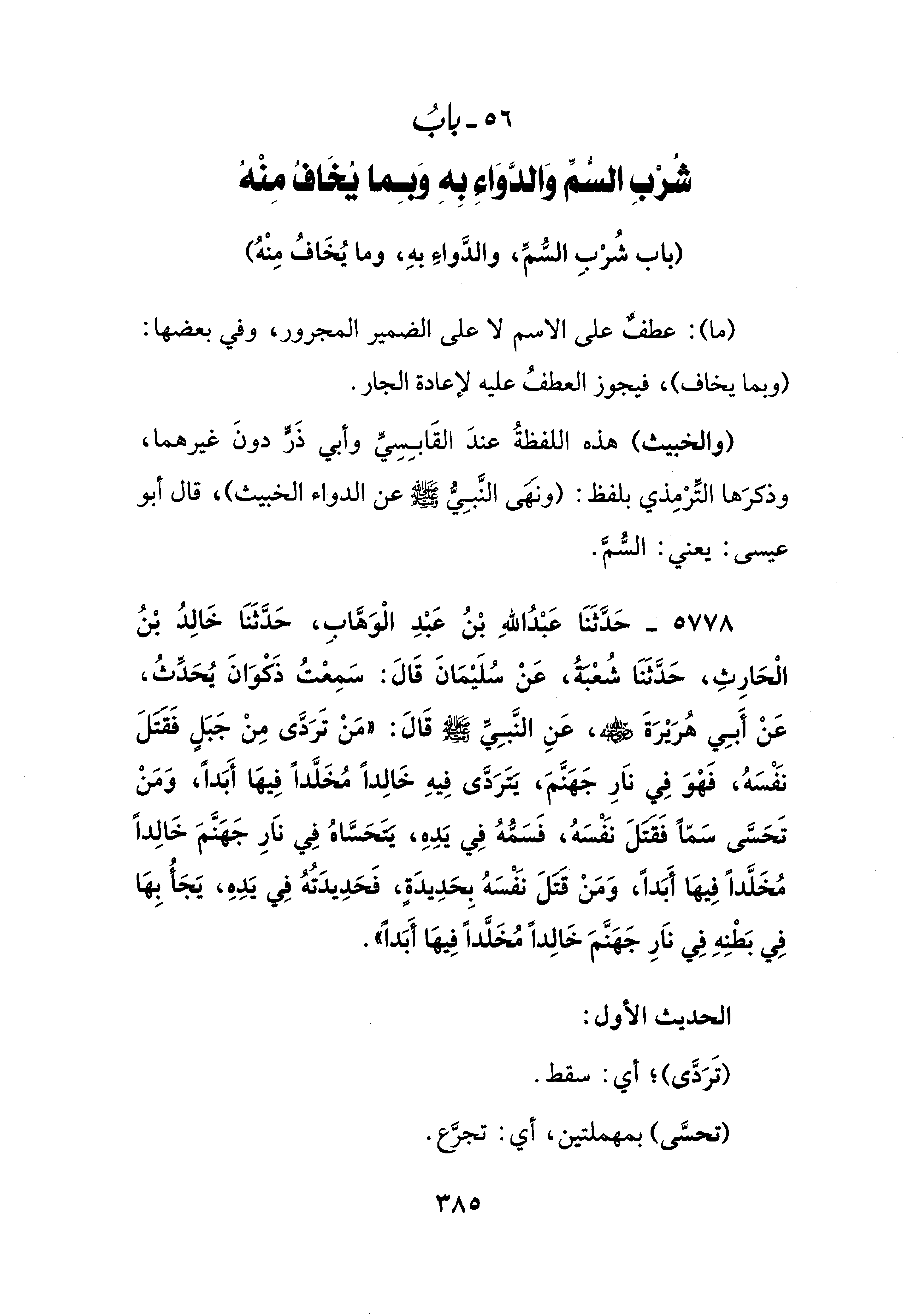 5778 - حَدَّثَنَا عَبْدُ اللهِ بْنُ عَبْدِ الْوَهَّابِ، حَدَّثَنَا خَالِدُ بْنُ الْحَارِثِ، حَدَّثَنَا شُعْبةُ، عَنْ سُلَيْمَانَ قَالَ: سَمِعْتُ ذَكْوَانَ يُحَدِّثُ، عَنْ أَبِي هُرَيرَةَ - رضي الله عنه -، عَنِ النَّبِيِّ - صلى الله عليه وسلم - قَالَ: "مَنْ تَرَدَّى مِنْ جَبَلٍ فَقتَلَ نَفْسَهُ، فَهْوَ في نَارِ جَهَنَّمَ، يترَدَّى فِيهِ خَالِدًا مُخَلَّدًا فِيهَا أَبَدًا، وَمَنْ تَحَسَّى سَمًّا فَقتلَ نَفْسَهُ، فَسَمُّهُ في يَدِهِ، يتحَسَّاهُ في نَارِ جَهَنَّمَ خَالِدًا مُخَلَّدًا فِيهَا أَبَدًا، وَمَنْ قتلَ نَفْسَهُ بِحَدِيدَةٍ، فَحَدِيدَتُهُ في يَدِهِ، يَجَأُ بِهَا في بَطْنِهِ في نَارِ جَهَنَّمَ خَالِدًا مُخَلَّدًا فِيهَا أَبَدًا".