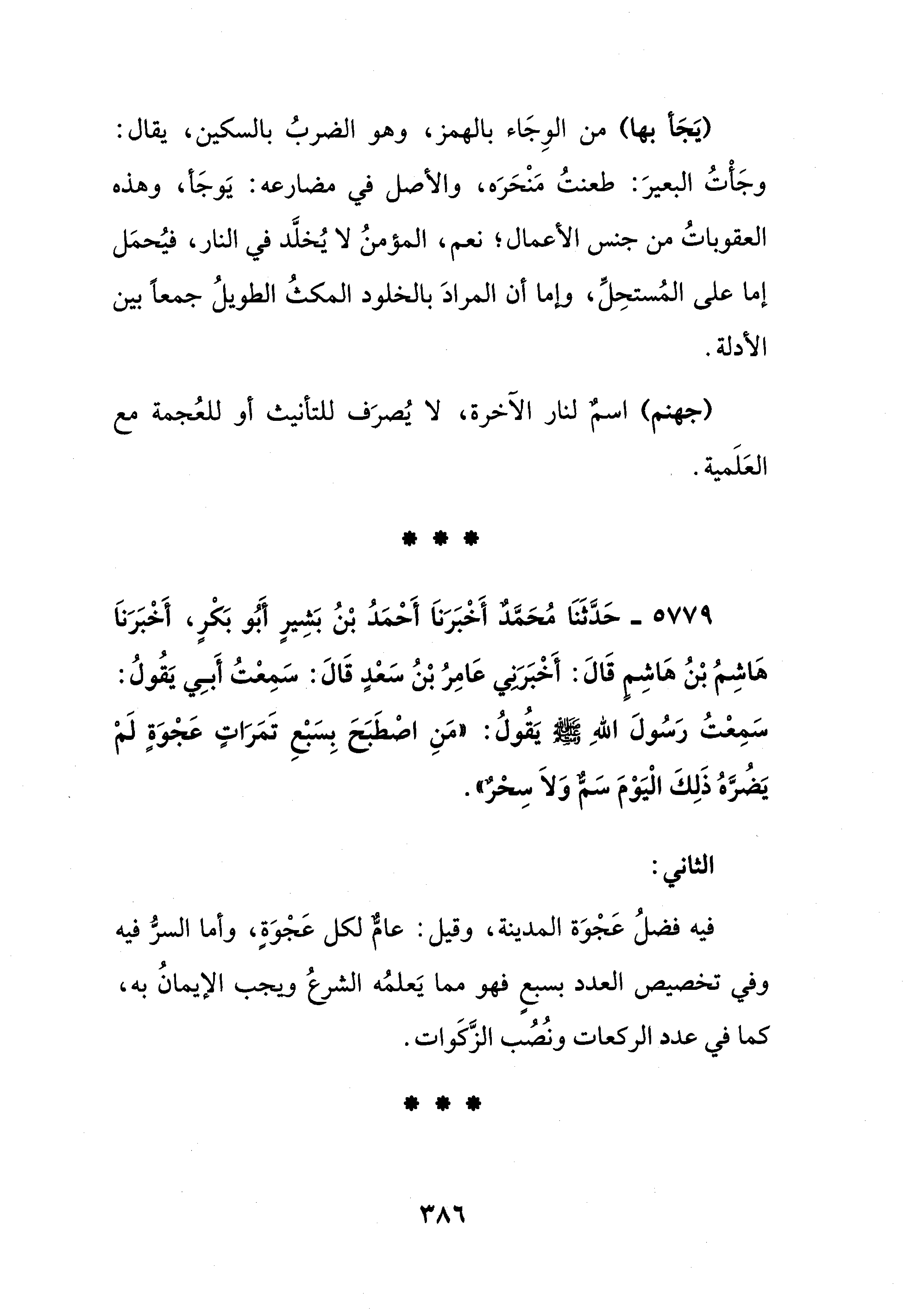 5779 - حَدَّثَنَا مُحَمَّدٌ أَخْبَرَنَا أَحْمَدُ بْنُ بَشِيرٍ أَبُو بَكْرٍ، أَخْبَرَنَا هَاشِمُ بْنُ هَاشِم قَالَ: أَخْبَرَنِي عَامِرُ بْنُ سَعْدٍ قَالَ: سَمِعْتُ أَبِي يَقُولُ: سَمِعْتُ رَسُولَ اللهِ - صلى الله عليه وسلم - يَقُولُ: "مَنِ اصْطَبَحَ بِسَبْعِ تَمَرَاتٍ عَجْوَةٍ لَمْ يَضُرَّهُ ذَلِكَ الْيَوْمَ سَمٌّ وَلَا سِحْرٌ".