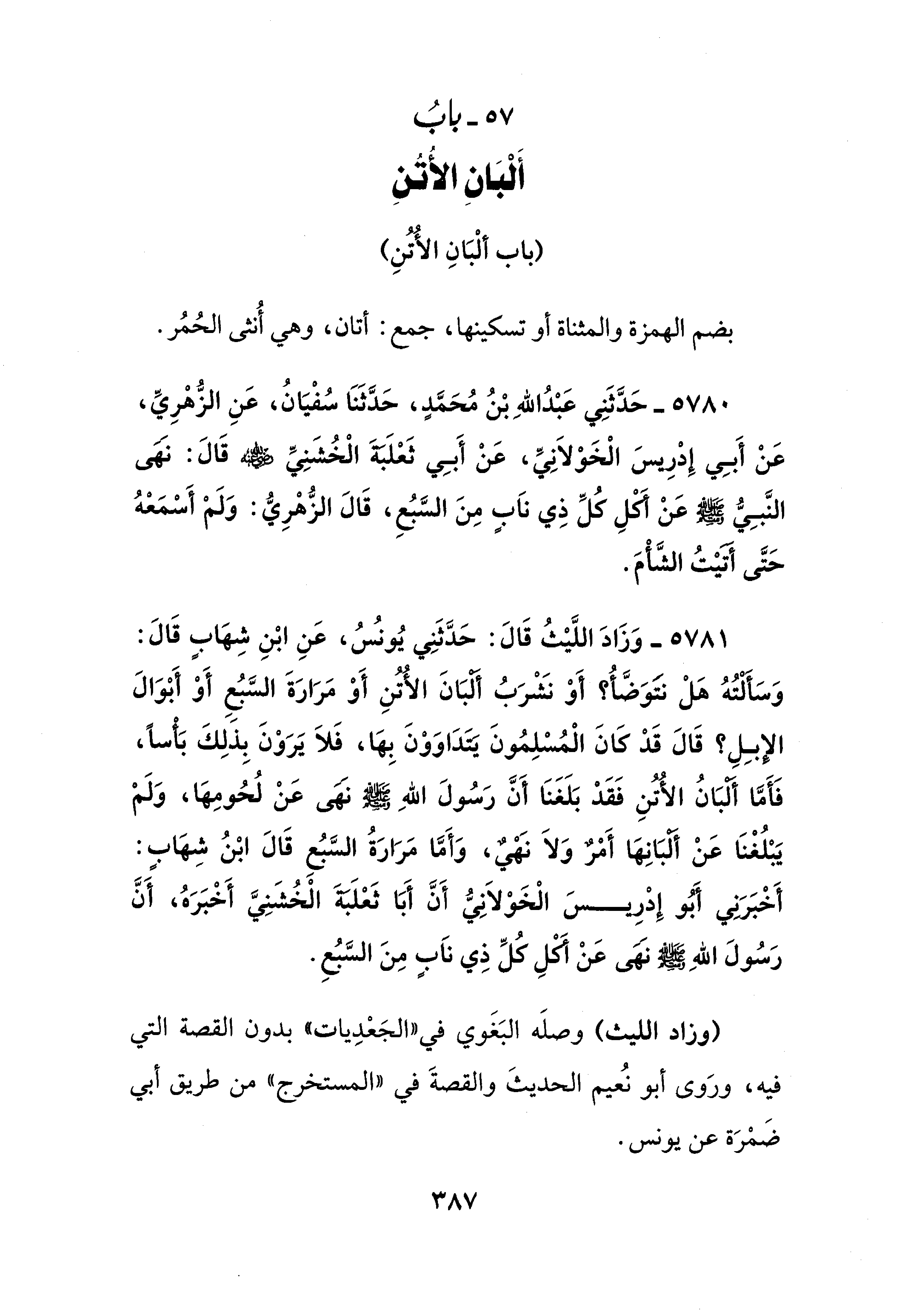 5780 - حَدَّثَنِي عَبْدُ اللهِ بْنُ مُحَمَّدٍ، حَدَّثَنَا سُفْيَانُ، عَنِ الزُّهْرِيِّ، عَنْ أَبِي إِدْرِيسَ الْخَوْلاَنِيِّ، عَنْ أَبِي ثَعْلَبةَ الْخُشنِيِّ - رضي الله عنه - قَالَ: نهى النَّبِيُّ - صلى الله عليه وسلم - عَنْ أكلِ كُلِّ ذِي نَابٍ مِنَ السَّبُعِ، قَالَ الزُّهْرِيُّ: وَلَمْ أَسْمَعْهُ حَتَّى أتيتُ الشَّأمَ.