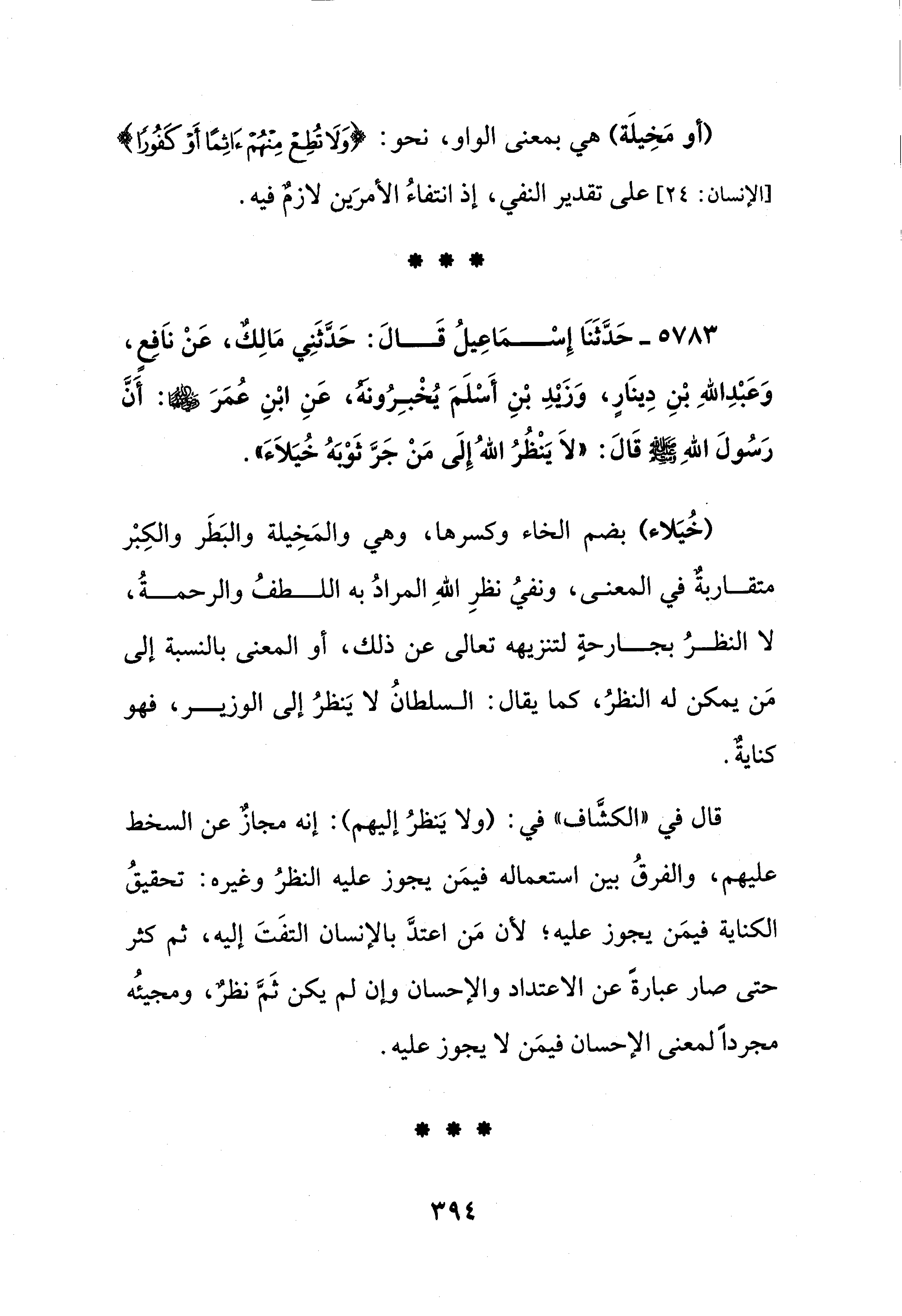 5783 - حَدَّثَنَا إِسْمَاعِيلُ قَالَ: حَدَّثَنِي مَالِكٌ، عَنْ نَافِعٍ، وَعَبْدِ اللهِ بْنِ دِينَارٍ، وَزَيْدِ بْنِ أَسْلَمَ يُخْبِرُونهُ، عَنِ ابْنِ عُمَرَ - رضي الله عنهما -: أَنَّ رَسُولَ اللهِ - صلى الله عليه وسلم - قَالَ: "لَا يَنْظُرُ اللهُ إِلَى مَنْ جَرَّ ثَوْبَهُ خُيَلاَءَ".