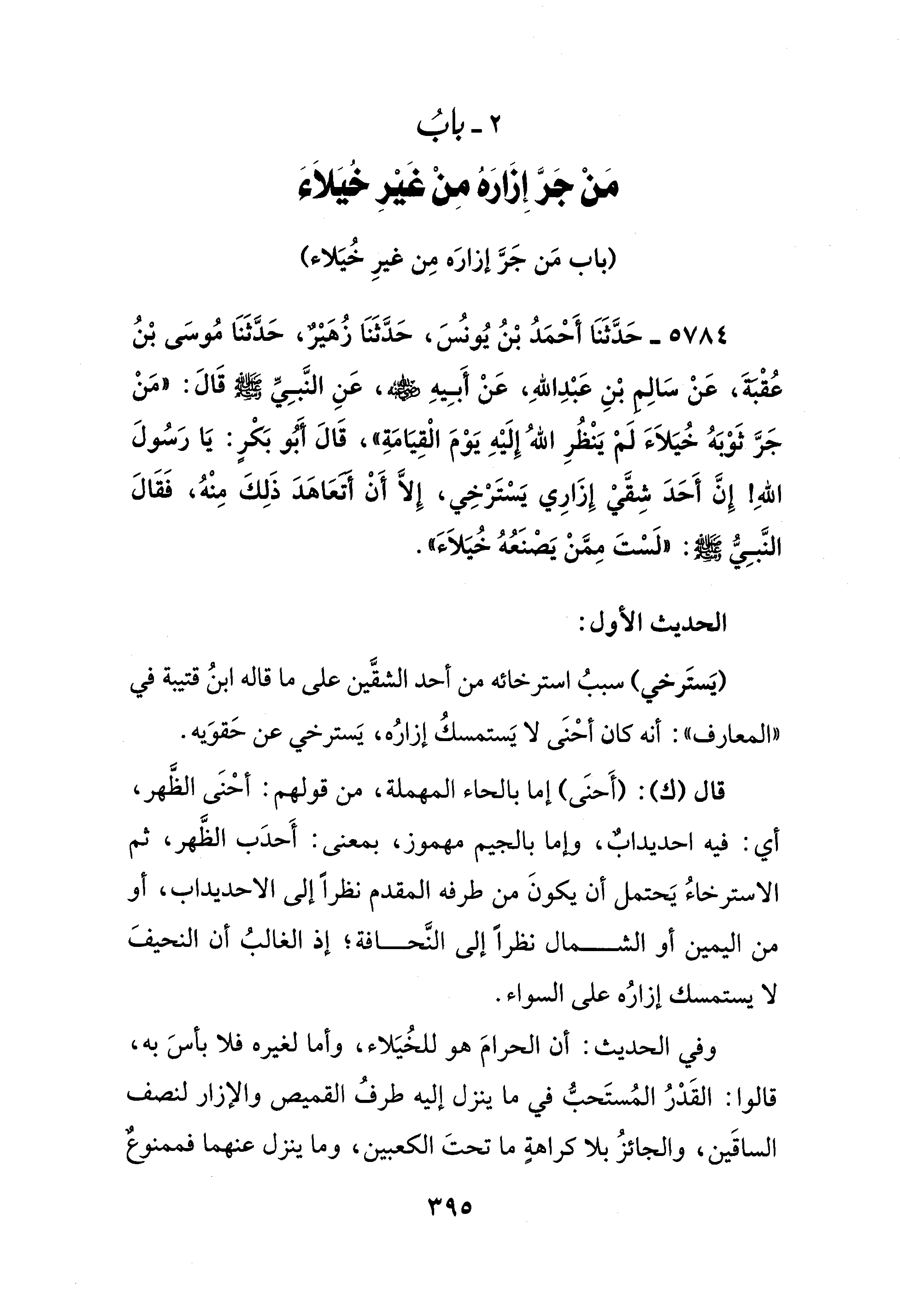 5784 - حَدَّثَنَا أَحْمَدُ بْنُ يُونس، حَدَّثَنَا زُهَيْرٌ، حَدَّثَنَا مُوسَى بْنُ عُقْبةَ، عَنْ سَالِم بْنِ عَبْدِ اللهِ، عَنْ أَبِيهِ - رضي الله عنه -، عَنِ النَّبِيِّ - صلى الله عليه وسلم - قَالَ: "مَنْ جَرَّ ثَوْبَهُ خُيَلاَءَ لَمْ يَنْظُرِ اللهُ إِلَيْهِ يَوْمَ الْقِيَامَةِ"، قَالَ أَبُو بَكْرٍ: يَا رَسُولَ اللهِ! إِنَّ أَحَدَ شِقَّيْ إِزَارِي يَسْتَرْخِي، إلا أَنْ أتعَاهَدَ ذَلِكَ مِنْهُ، فَقَالَ النَّبِيُّ - صلى الله عليه وسلم -: "لَسْتَ مِمَّنْ يَصْنَعُهُ خُيَلاَءَ".