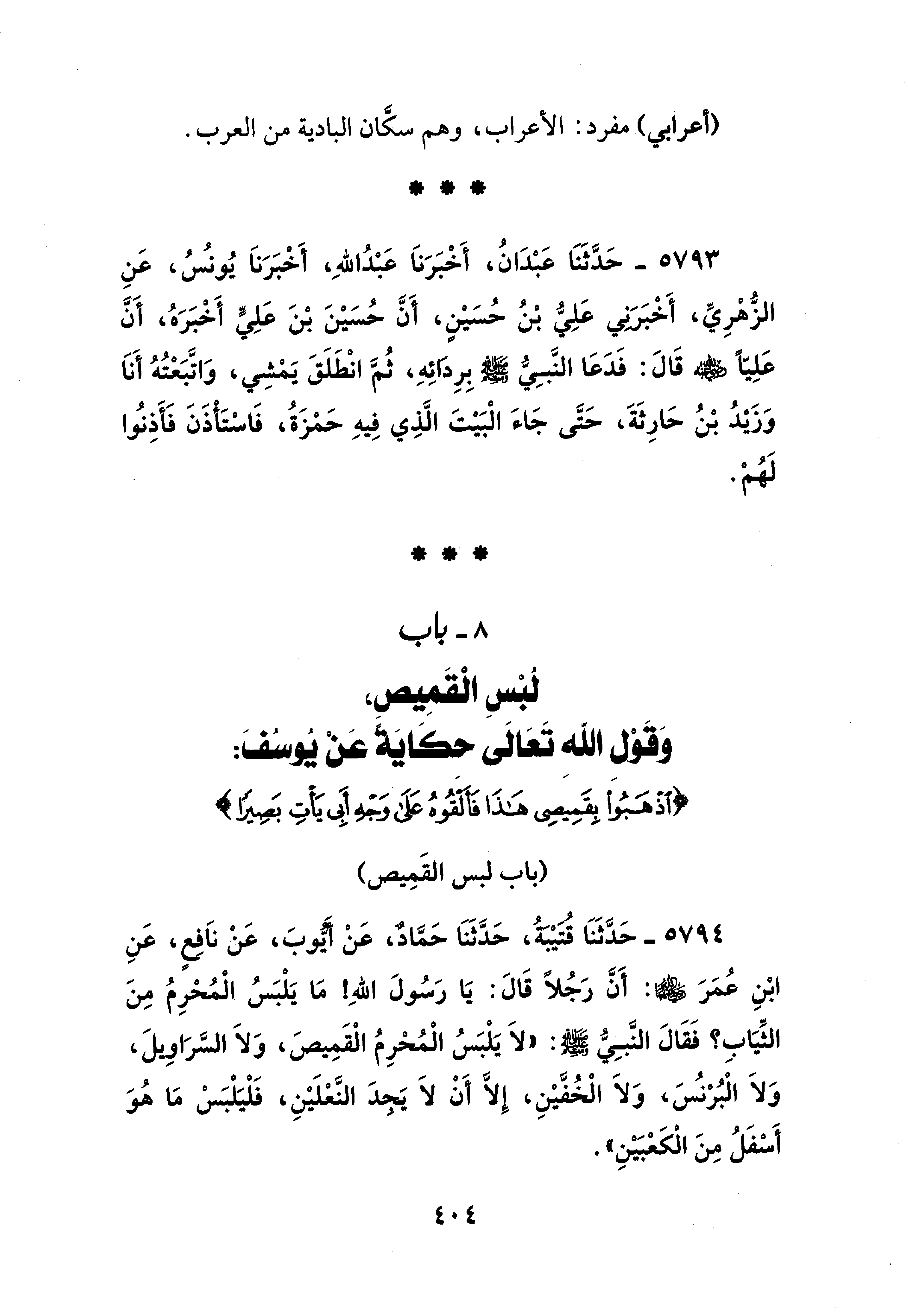 8 - باب لُبْسِ الْقَمِيصِ، وَقَوْل الله تَعَالَى حكَايَةً عَنْ يُوسُفَ: {اذْهَبُوا بِقَمِيصِي هَذَا فَأَلْقُوهُ عَلَى وَجْهِ أَبِي يَأْتِ بَصِيرًا}