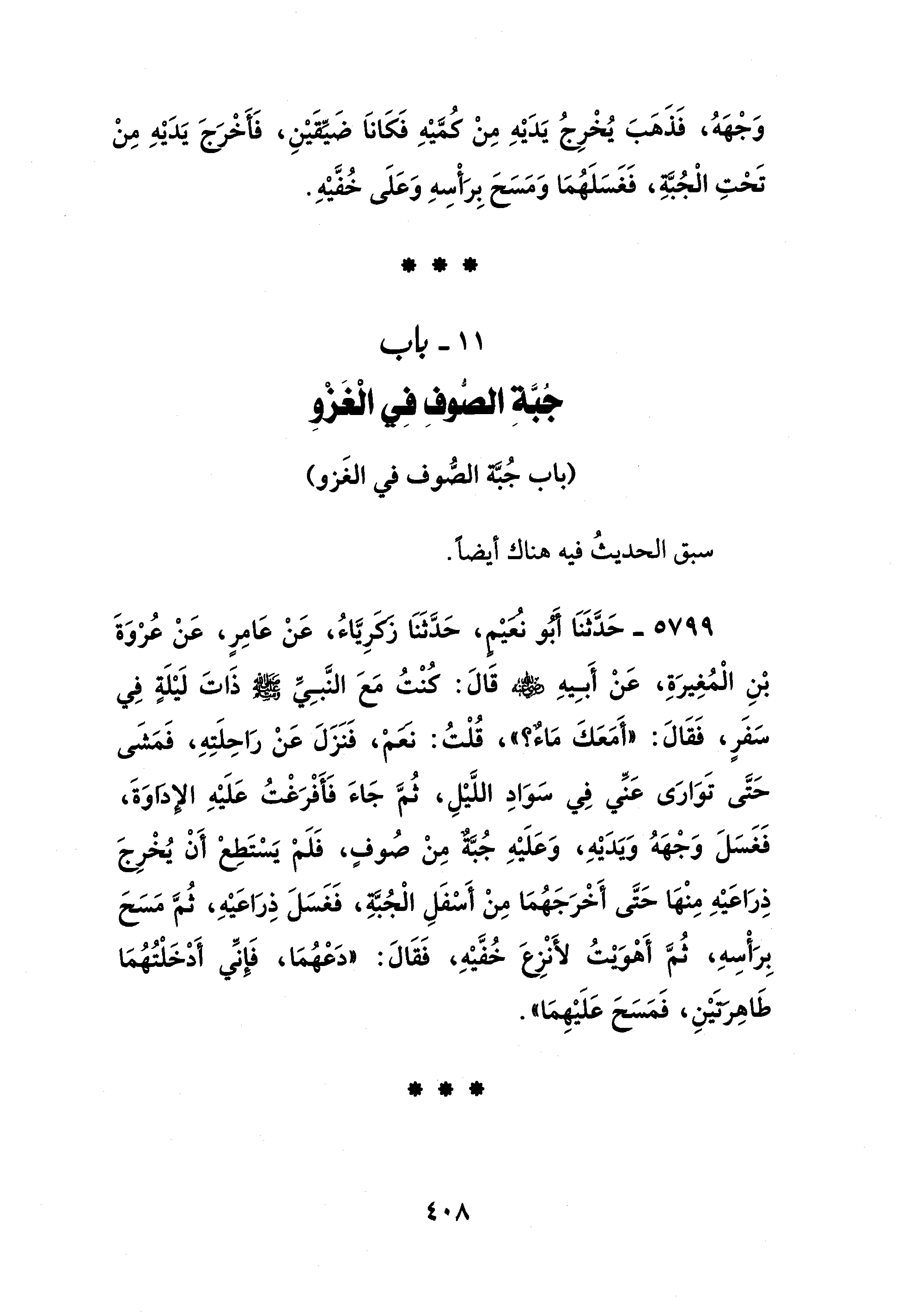 5799 - حَدَّثَنَا أَبُو نُعَيْمٍ، حَدَّثَنَا زكرِيَّاءُ، عَنْ عَامِرٍ، عَنْ عُرْوَةَ بْنِ الْمُغِيرَةِ، عَنْ أَبِيهِ - رضي الله عنه - قَالَ: كُنْتُ مَعَ النَّبِيِّ - صلى الله عليه وسلم - ذَاتَ لَيْلَةٍ في سَفَرٍ، فَقَالَ: "أَمَعَكَ مَاءٌ؟ "، قُلْتُ: نعمْ، فَنَزَلَ عَنْ رَاحِلَتِهِ، فَمَشَى حَتَّى تَوَارَى عَنِّي في سَوَادِ اللَّيْلِ، ثُمَّ جَاءَ فَأَفْرَغْتُ عَلَيْهِ الإداوَةَ، فَغَسَلَ وَجْهَهُ وَيَدَيْهِ، وَعَلَيْهِ جُبَّةٌ مِنْ صُوفٍ، فَلَمْ يَسْتَطِعْ أَنْ يُخْرِجَ ذِرَاعَيْهِ مِنْهَا حَتَّى أَخْرَجَهُمَا مِنْ أَسْفَلِ الْجُبَّة، فَغَسَلَ ذِرَاعَيْهِ، ثُمَّ مَسَحَ بِرَأْسِهِ، ثُمَّ أَهْويتُ لأَنْزِعَ خُفَّيْهِ، فَقَالَ: "دَعْهُمَا، فَإنِّي أَدْخَلْتُهُمَا طَاهِرتيْنِ، فَمَسَحَ عَلَيْهِمَا".