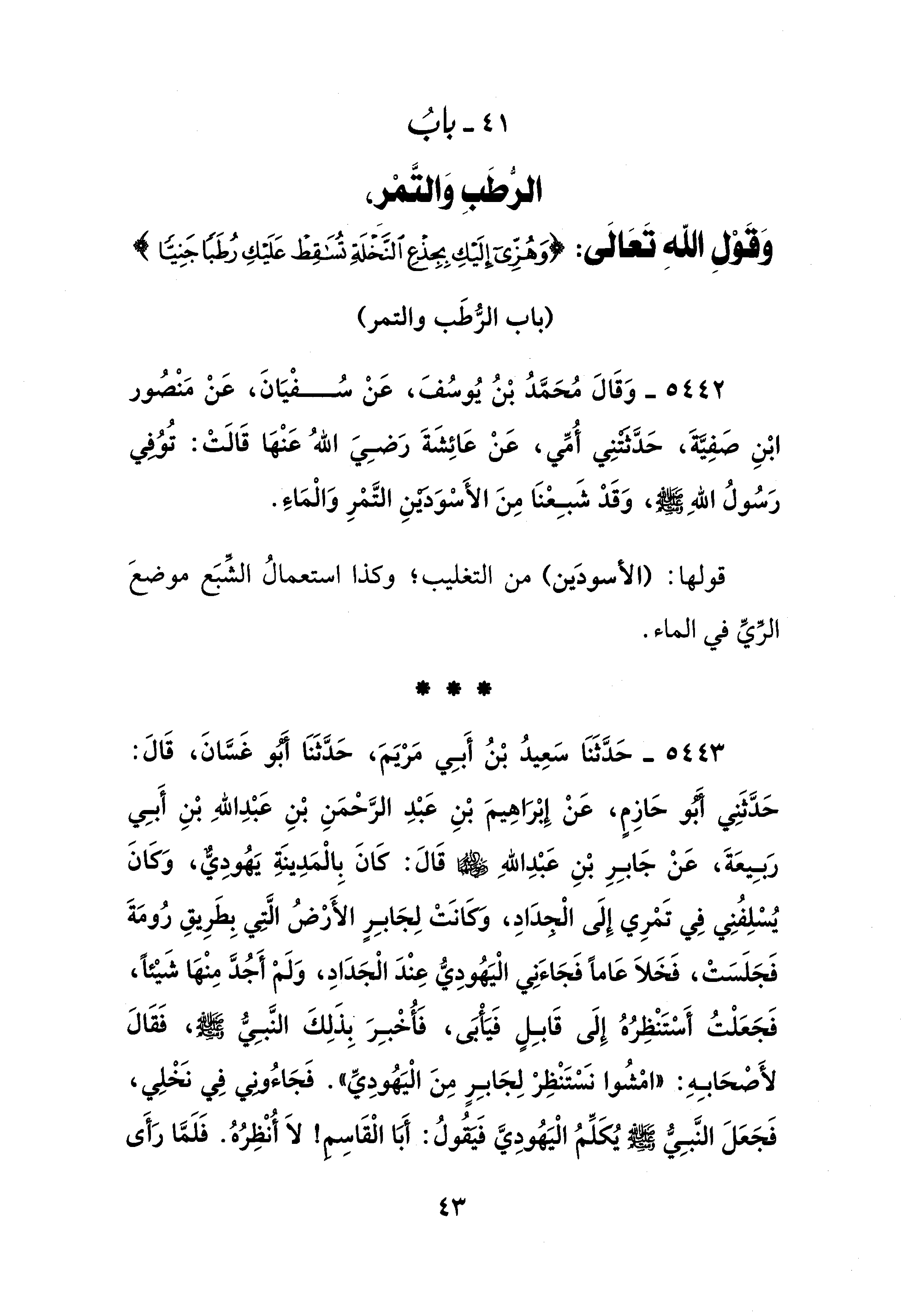 5443 - حَدَّثَنَا سَعِيدُ بْنُ أَبِي مَرْيَمَ، حَدَّثَنَا أبو غَسَّانَ، قَالَ: حَدَّثَنِي أبو حَازِمٍ، عَنْ إِبْرَاهِيمَ بْنِ عَبْدِ الرَّحْمَنِ بْنِ عَبْدِ اللهِ بْنِ أَبِي رَبِيعَةَ، عَنْ جَابِرِ بْنِ عَبْدِ اللهِ - رضي الله عنهما - قَالَ: كَانَ بِالْمَدِينَةِ يَهُودِيٌّ، وَكَانَ يُسْلِفُنِي فِي تَمْرِي إِلَى الْجِدَادِ، وَكَانَتْ لِجَابِر الأَرْضُ الَّتي بِطَرِيقِ رُومَةَ فَجَلَسَتْ، فَخَلاَ عَامًا فَجَاءَنِي الْيَهُودِيُّ عِنْدَ الْجَدَادِ، وَلَمْ أَجُدَّ مِنْهَا شَيْئًا، فَجَعَلْتُ أَسْتَنْظِرُهُ إِلَى قَابِلٍ فَيَأبَى، فَأخْبِرَ بِذَلِكَ النَّبِيّ - صلى الله عليه وسلم -، فَقَالَ لأَصْحَابِهِ: "امْشُوا نستَنْظِرْ لِجَابِرٍ مِنَ الْيَهُودِيّ". فَجَاءُوني فِي نَخْلِي، فَجَعَلَ النَّبِيُّ - صلى الله عليه وسلم - يُكَلِّمُ الْيَهُودِيَّ فَيقُولُ: أَبَا الْقَاسِم! لَا أُنْظِرُهُ. فَلَمَّا رَأَى