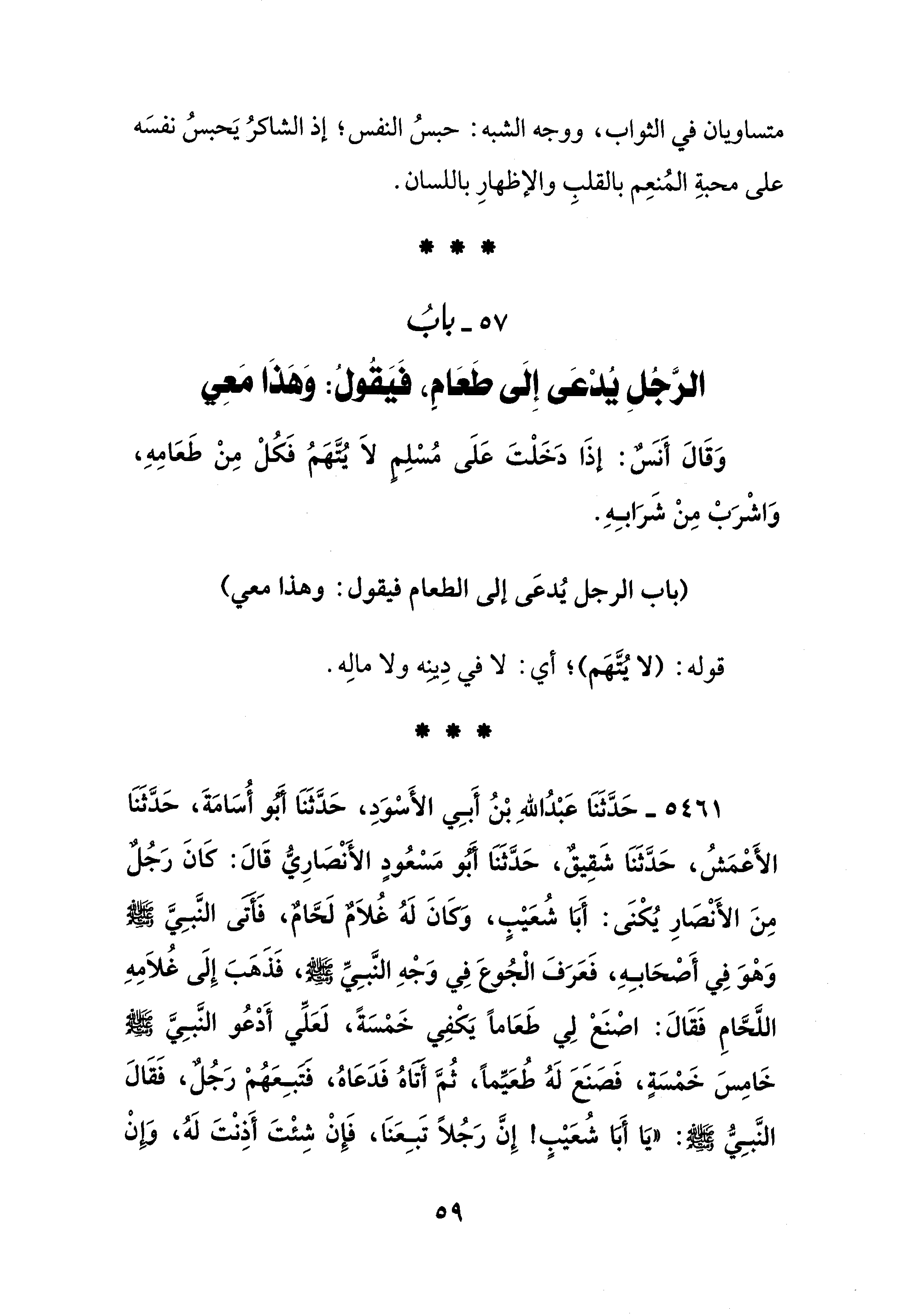 5461 - حَدَّثَنَا عَبْدُ اللهِ بْنُ أَبِي الأَسْوَدِ، حَدَّثَنَا أَبُو أُسَامَةَ، حَدَّثَنَا الأَعْمَشُ، حَدَّثَنَا شَقِيقٌ، حَدَّثَنَا أَبُو مَسْعُودٍ الأَنْصَارِيُّ قَالَ: كَانَ رَجُلٌ مِنَ الأَنْصَارِ يُكْنَى: أَبَا شُعَيْبٍ، وَكَانَ لَهُ غُلاَمٌ لَحَّامٌ، فَأَتَى النَّبِيَّ - صلى الله عليه وسلم - وَهْوَ فِي أَصْحَابِهِ، فَعَرَفَ الْجُوعَ فِي وَجْهِ النَّبِيِّ - صلى الله عليه وسلم -، فَذَهَبَ إِلَى غُلاَمِهِ اللَّحَّامِ فَقَالَ: اصْنَعْ لِي طَعَامًا يَكْفِي خَمْسَةً، لَعَلِّي أَدْعُو النَّبِيَّ - صلى الله عليه وسلم - خَامِسَ خَمْسَةٍ، فَصَنَعَ لَهُ طُعَيِّمًا، ثُمَّ أتاهُ فَدَعَاهُ، فَتَبِعَهُمْ رَجُلٌ، فَقَالَ النَّبِيُّ - صلى الله عليه وسلم -: "يَا أَبَا شُعَيْبٍ! إِنَّ رَجُلًا تَبِعَنَا، فَإِنْ شِئْتَ أَذِنْتَ لَهُ، وَإِنْ