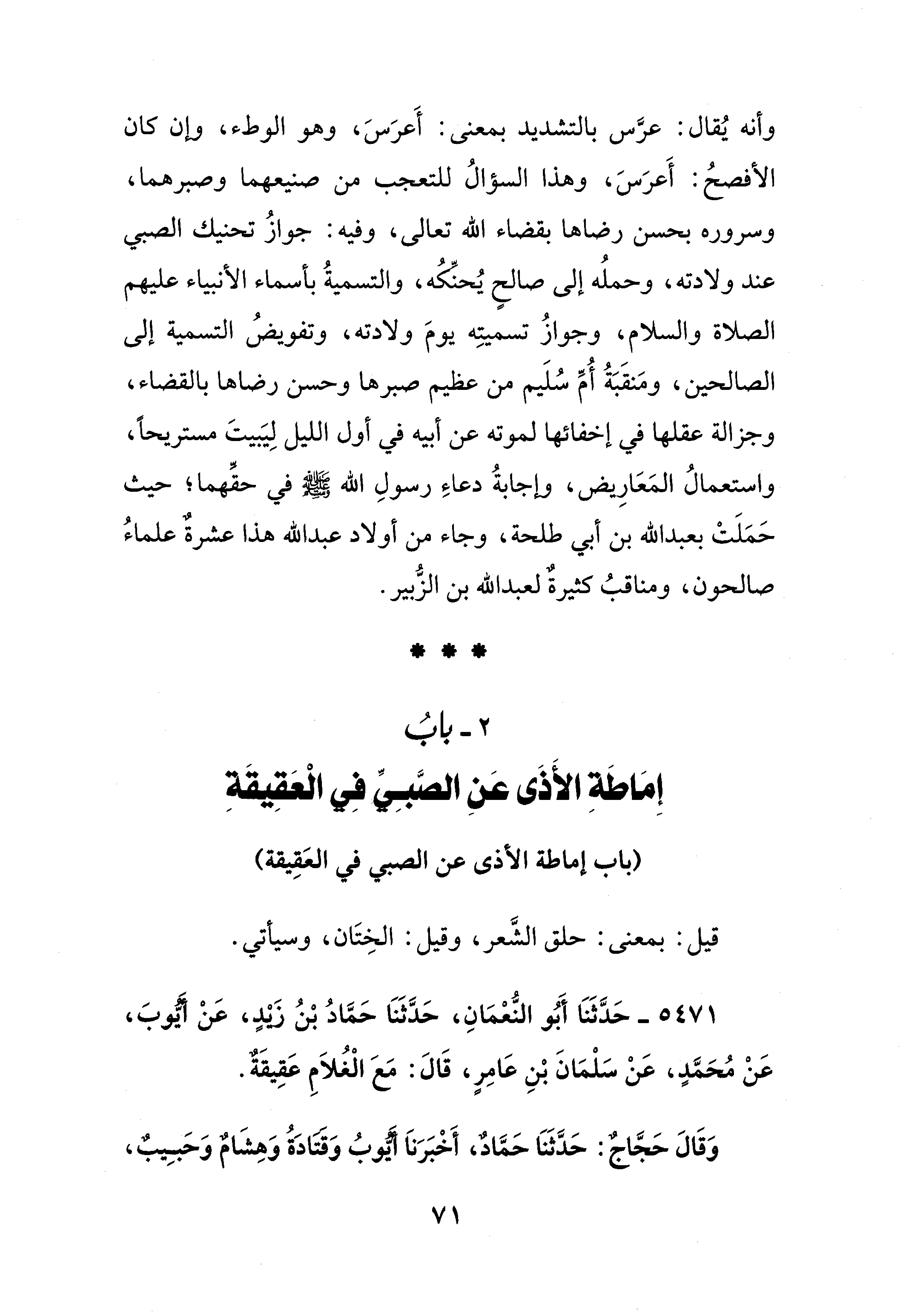 وأنه يُقال: عرَّس بالتشديد بمعنى: أَعرَسَ، وهو الوطء، وإن كان الأفصحُ: أَعرَسَ، وهذا السؤالُ للتعجب من صنيعهما وصبرهما، وسروره بحسن رضاها بقضاء الله تعالى، وفيه: جوازُ تحنيك الصبي عند ولادته، وحملُه إلى صالحٍ يُحنِّكُه، والتسميةُ بأسماء الأنبياء عليهم الصلاة والسلام، وجوازُ تسميتِه يومَ ولادته، وتفويضُ التسمية إلى الصالحين، ومَنقَبَةُ أُمِّ سُلَيم من عظيم صبرها وحسن رضاها بالقضاء، وجزالة عقلها في إخفائها لموته عن أبيه في أول الليل لِيَبيتَ مستريحًا، واستعمالُ المَعَارِيض، وإجابةُ دعاءِ رسولِ الله - صلى الله عليه وسلم - في حقِّهما؛ حيث حَمَلَتْ بعبد الله بن أبي طلحة، وجاء من أولاد عبد الله هذا عشرةٌ لا علماءُ صالحون، ومناقبُ كثيرةٌ لعبد الله بن الزُّبير.