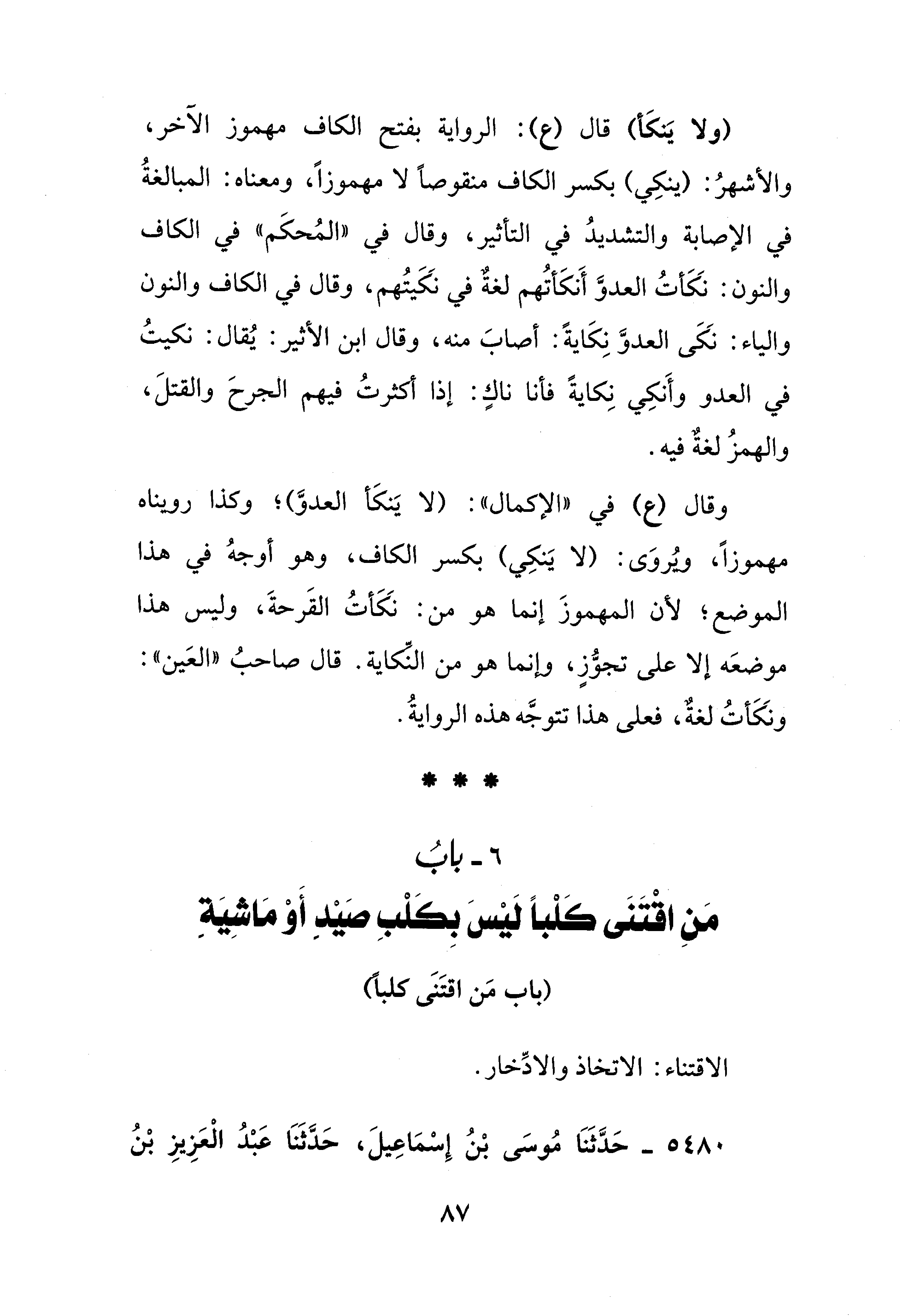 وقال (ع) في "الإكمال": (لا يَنكَأ العدوَّ)؛ وكذا رويناه مهموزًا، ويُروَى: (لا يَنكِي) بكسر الكاف، وهو أوجهُ في هذا الموضع؛ لأن المهموزَ إنما هو من: نَكَأتُ القَرحةَ، وليس هذا موضعَه إلا على تجوُّزٍ، وإنما هو من النِّكاية. قال صاحبُ "العَين": ونَكَأتُ لغةٌ، فعلى هذا تتوجَّه هذه الروايةُ.