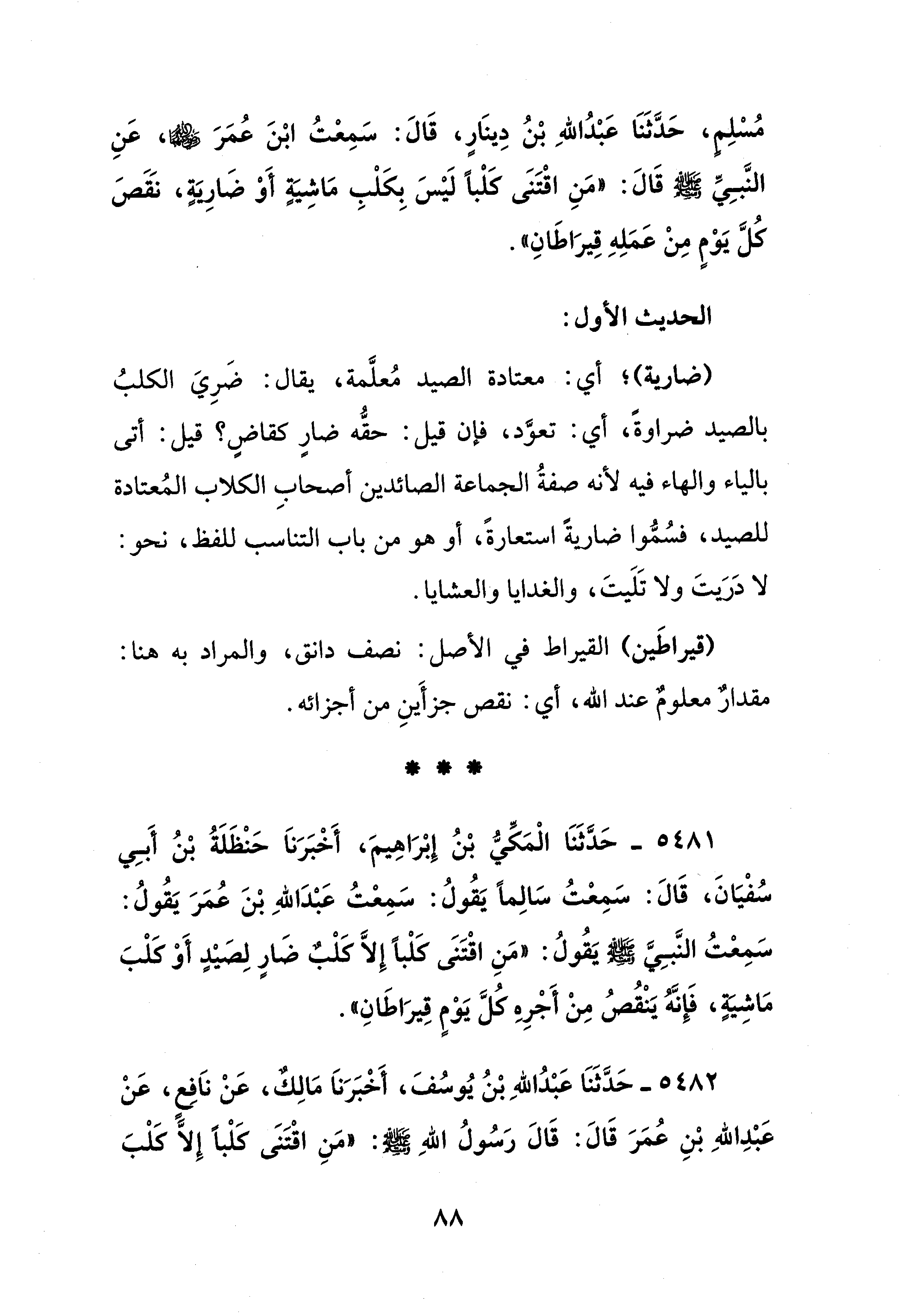 مُسْلِمٍ، حَدَّثَنَا عَبْدُ اللهِ بْنُ دِينَارٍ، قَالَ: سَمِعْتُ ابْنَ عُمَرَ - رضي الله عنهما -، عَنِ النَّبِيِّ - صلى الله عليه وسلم - قَالَ: "مَنِ اقْتَنَى كلْبًا لَيْسَ بِكَلْبِ مَاشِيةٍ أَوْ ضَارِيَةٍ، نَقَصَ كُلَّ يَوْمٍ مِنْ عَمَلِهِ قِيرَاطَانِ".