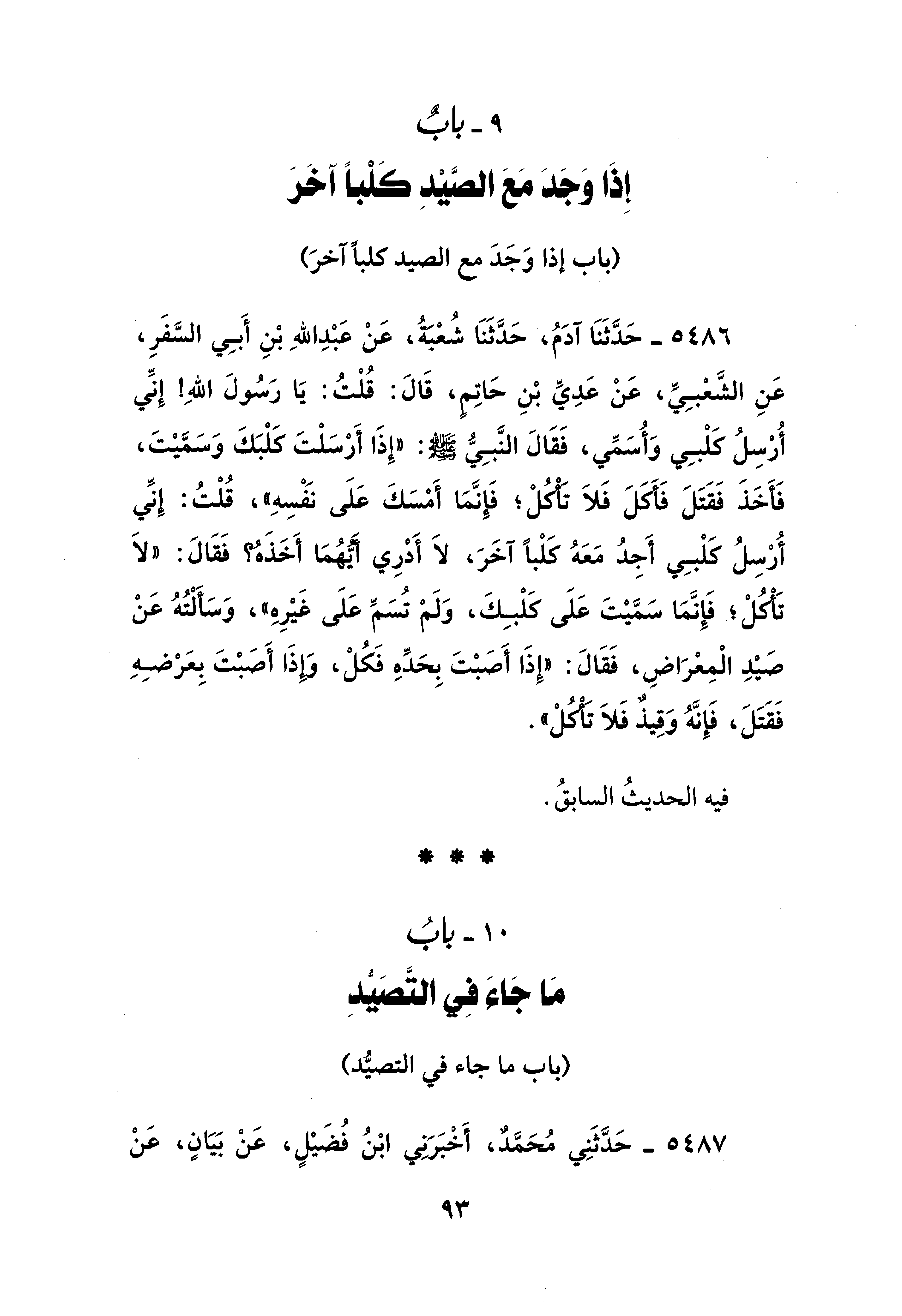 5486 - حَدَّثَنَا آدَمُ، حَدَّثَنَا شُعْبَةُ، عَنْ عَبْدِ اللهِ بْنِ أَبِي السَّفَرِ، عَنِ الشَّعْبِيِّ، عَنْ عَدِيِّ بْنِ حَاتِمٍ، قَالَ: قُلْتُ: يَا رَسُولَ اللهِ! إِنِّي أُرْسِلُ كَلْبِي وَأُسَمِّي، فَقَالَ النَّبِيُّ - صلى الله عليه وسلم -: "إِذَا أَرْسَلْتَ كَلْبَكَ وَسَمَّيْتَ، فَأَخَذَ فَقَتَلَ فَأَكَلَ فَلَا تَأْكُلْ؟ فَإِنَّمَا أَمْسَكَ عَلَى نَفْسِهِ"، قُلْتُ: إِنِّي أُرْسِلُ كَلْبِي أَجِدُ مَعَهُ كلْبًا آخَرَ، لَا أَدْرِي أَيُّهُمَا أَخَذَهُ؟ فَقَالَ: "لَا تَأكُلْ؛ فَإِنَّمَا سَمَّيْتَ عَلَى كَلْبِكَ، وَلَمْ تُسَمِّ عَلَى غَيْرِهِ"، وَسَأَلْتُهُ عَنْ صَيْدِ الْمِعْرَاضِ، فَقَالَ: "إِذَا أَصَبْتَ بِحَدِّهِ فَكُلْ، وَإِذَا أَصَبْتَ بِعَرْضِهِ فَقَتَلَ، فَإِنَّهُ وَقِيذٌ فَلَا تَأْكُلْ".